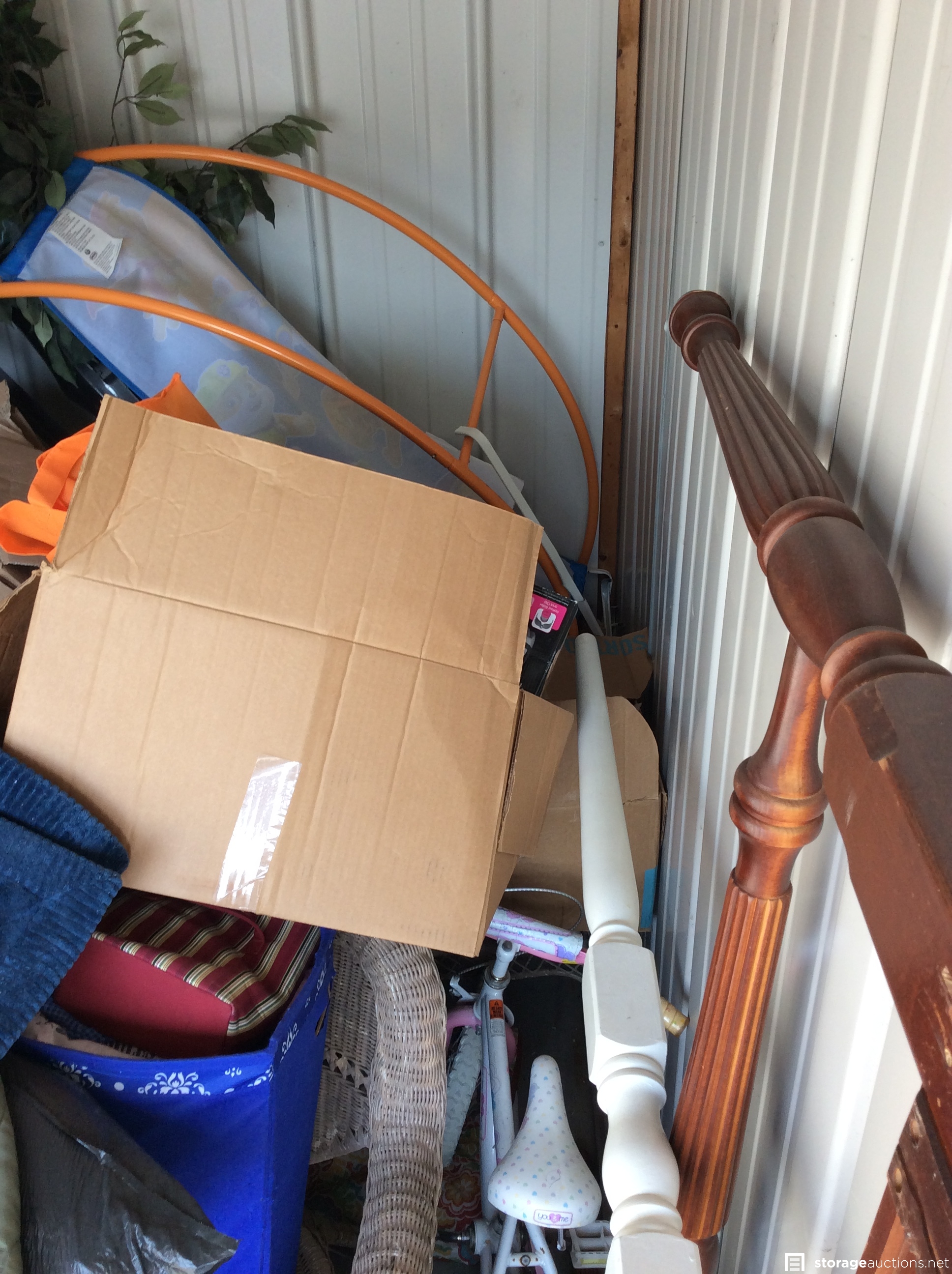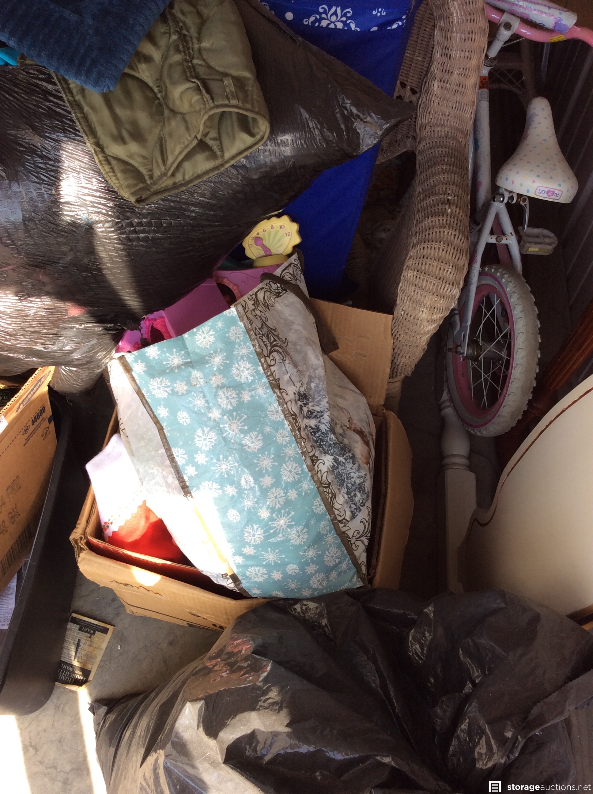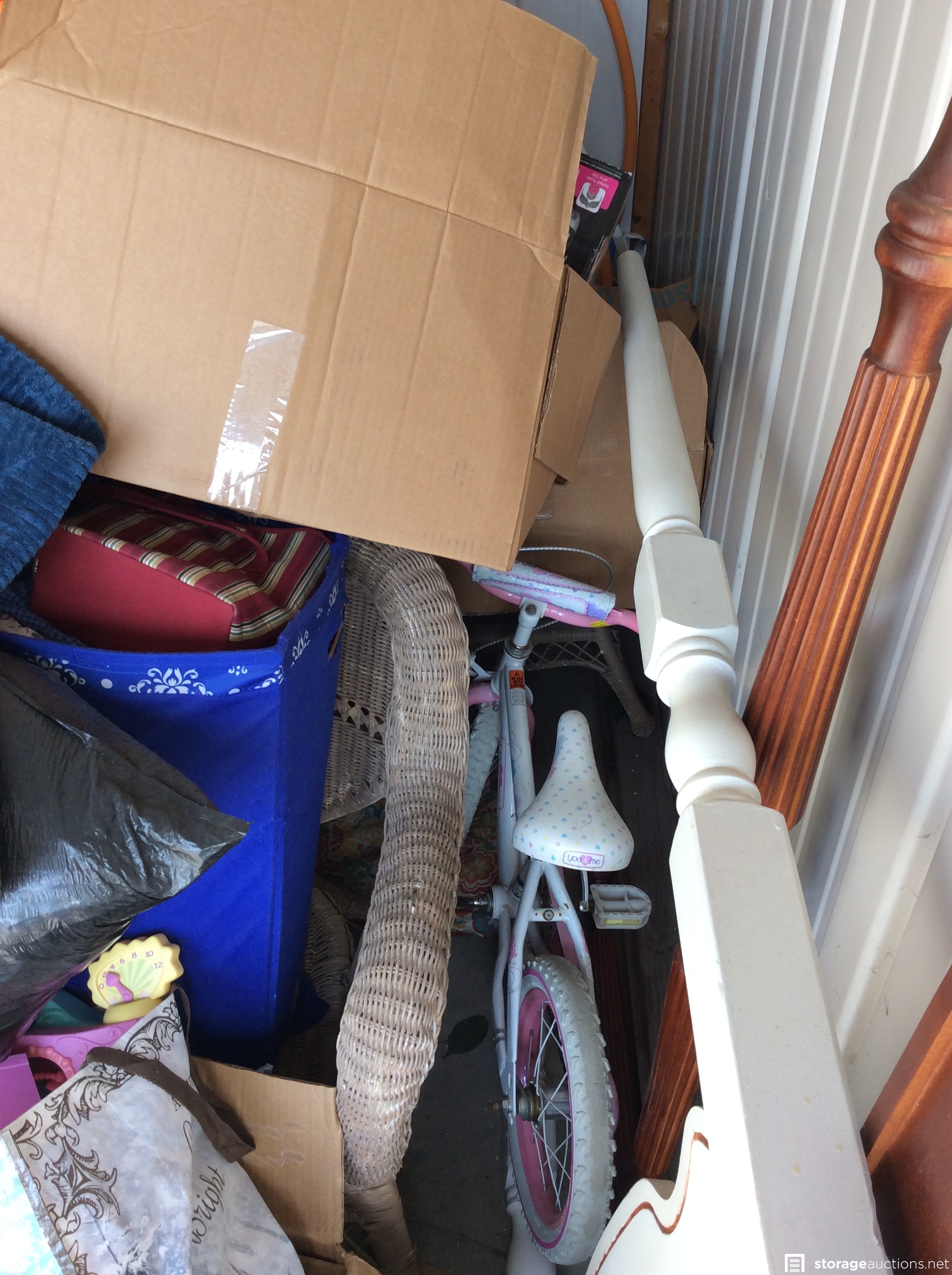 Wicker chairs, little girl bike, large suitcase, bed frame, boxes, tote