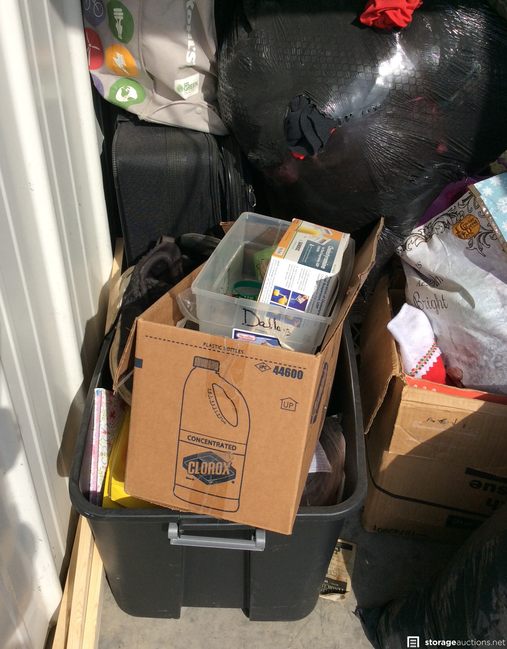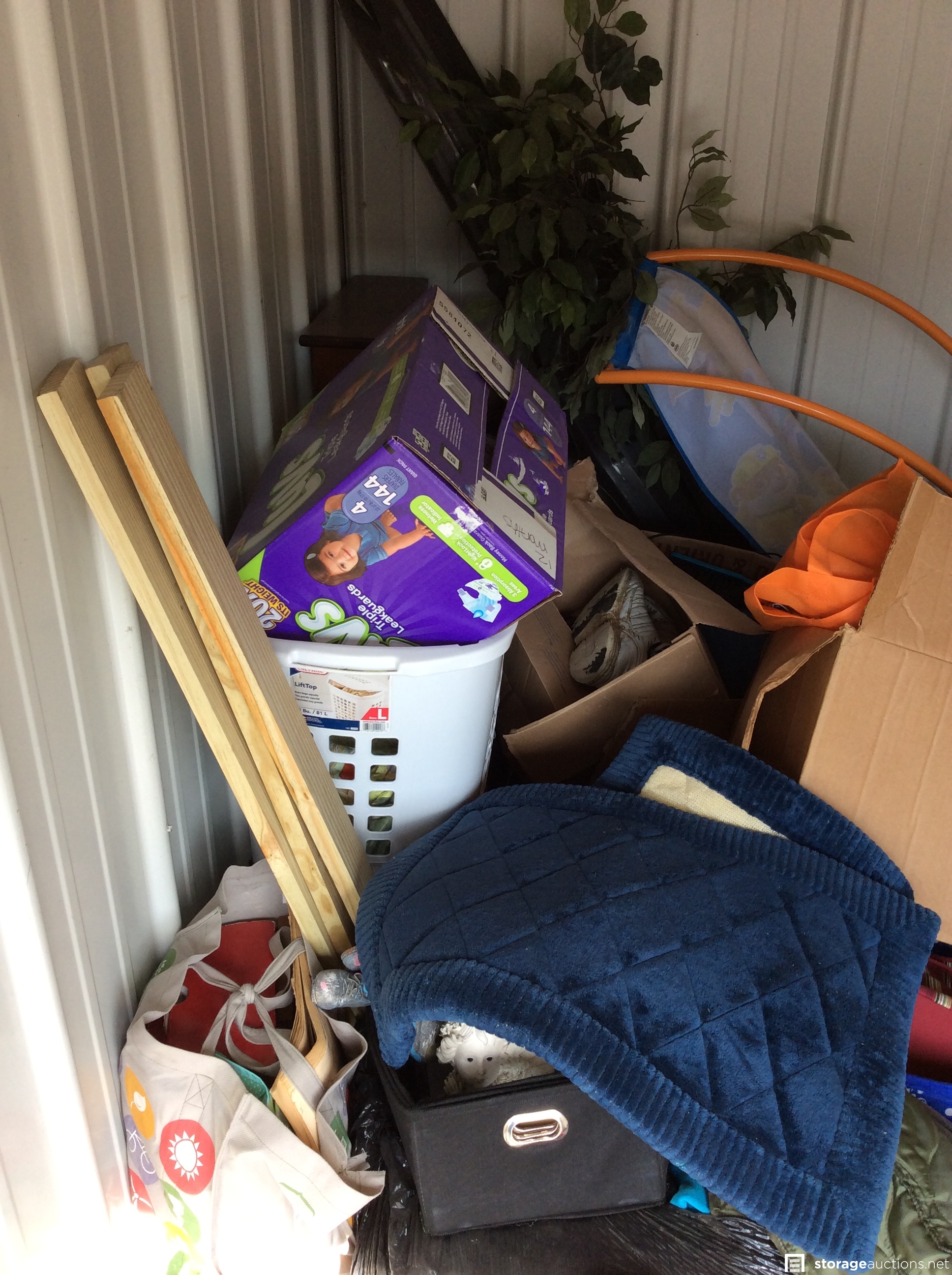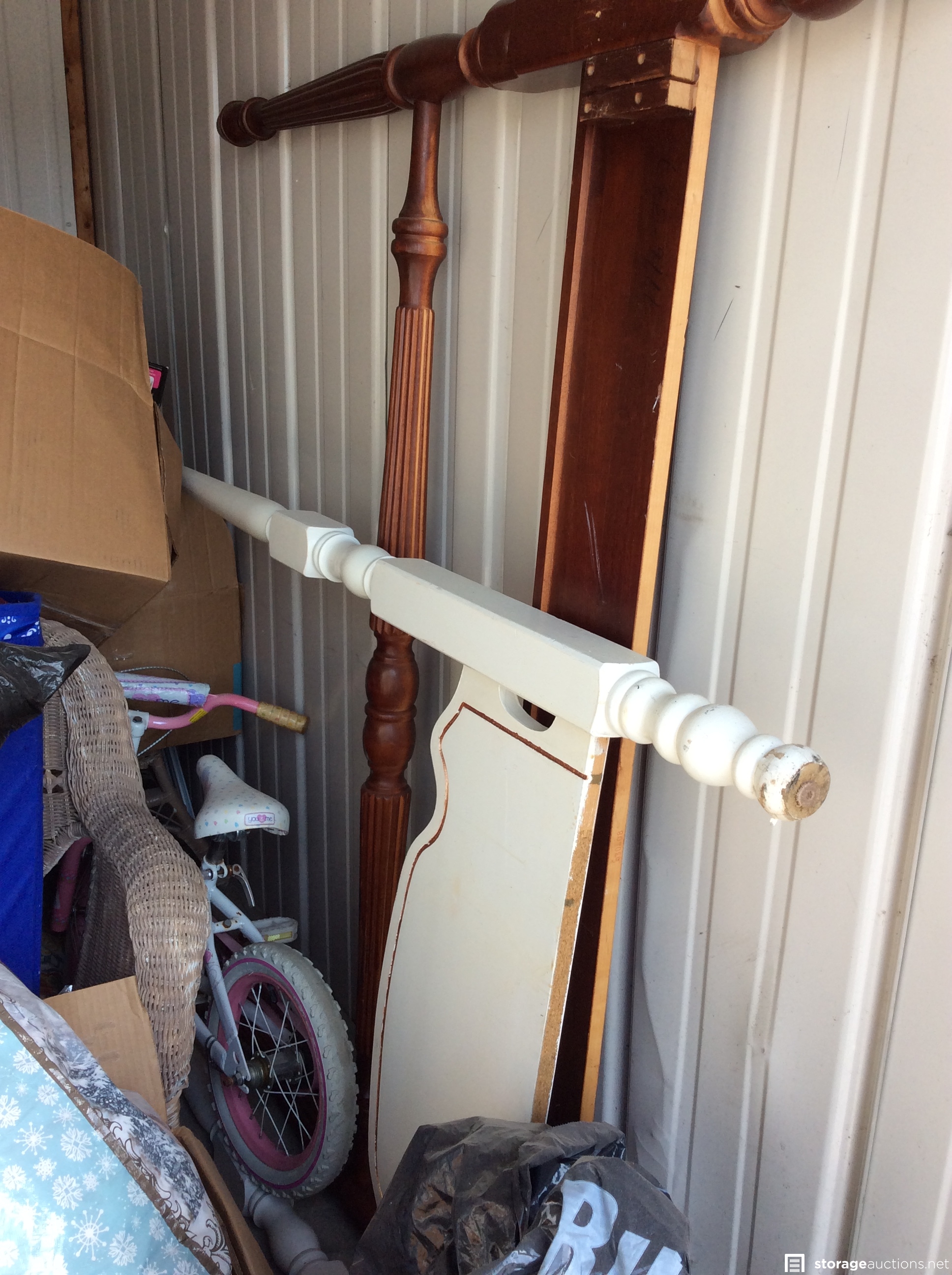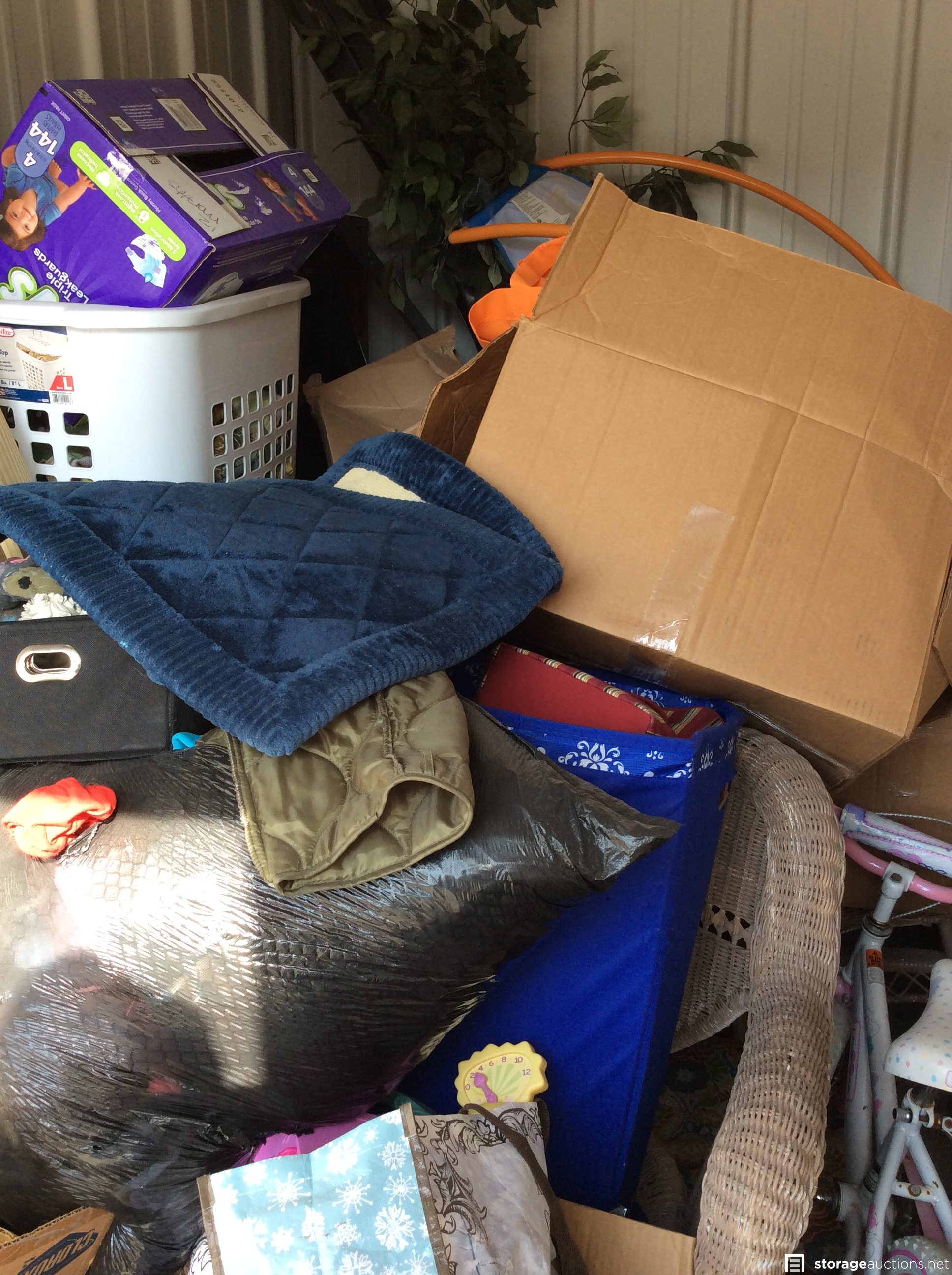 Wicker chairs, little girl bike, large suitcase, bed frame, boxes, tote
