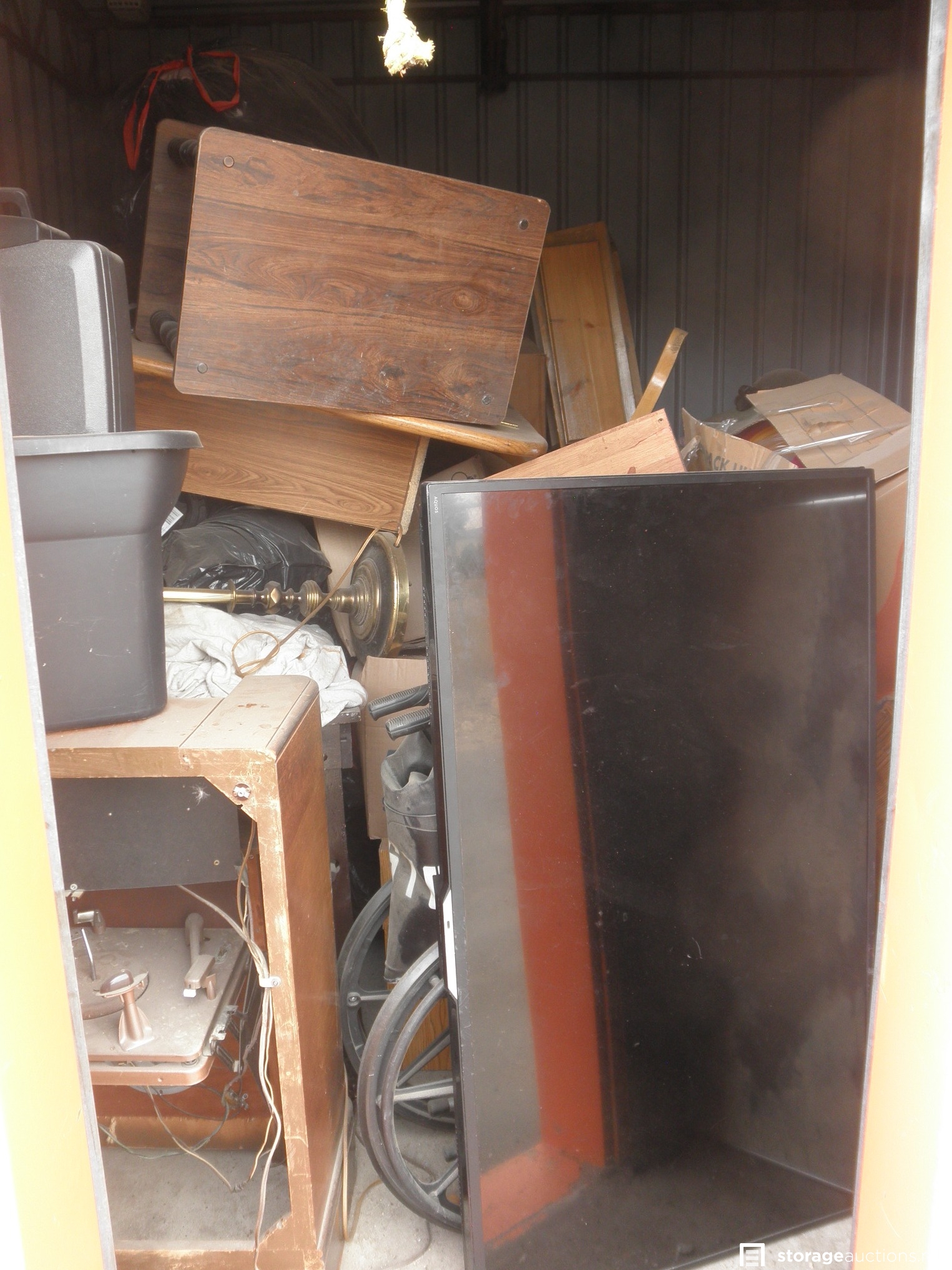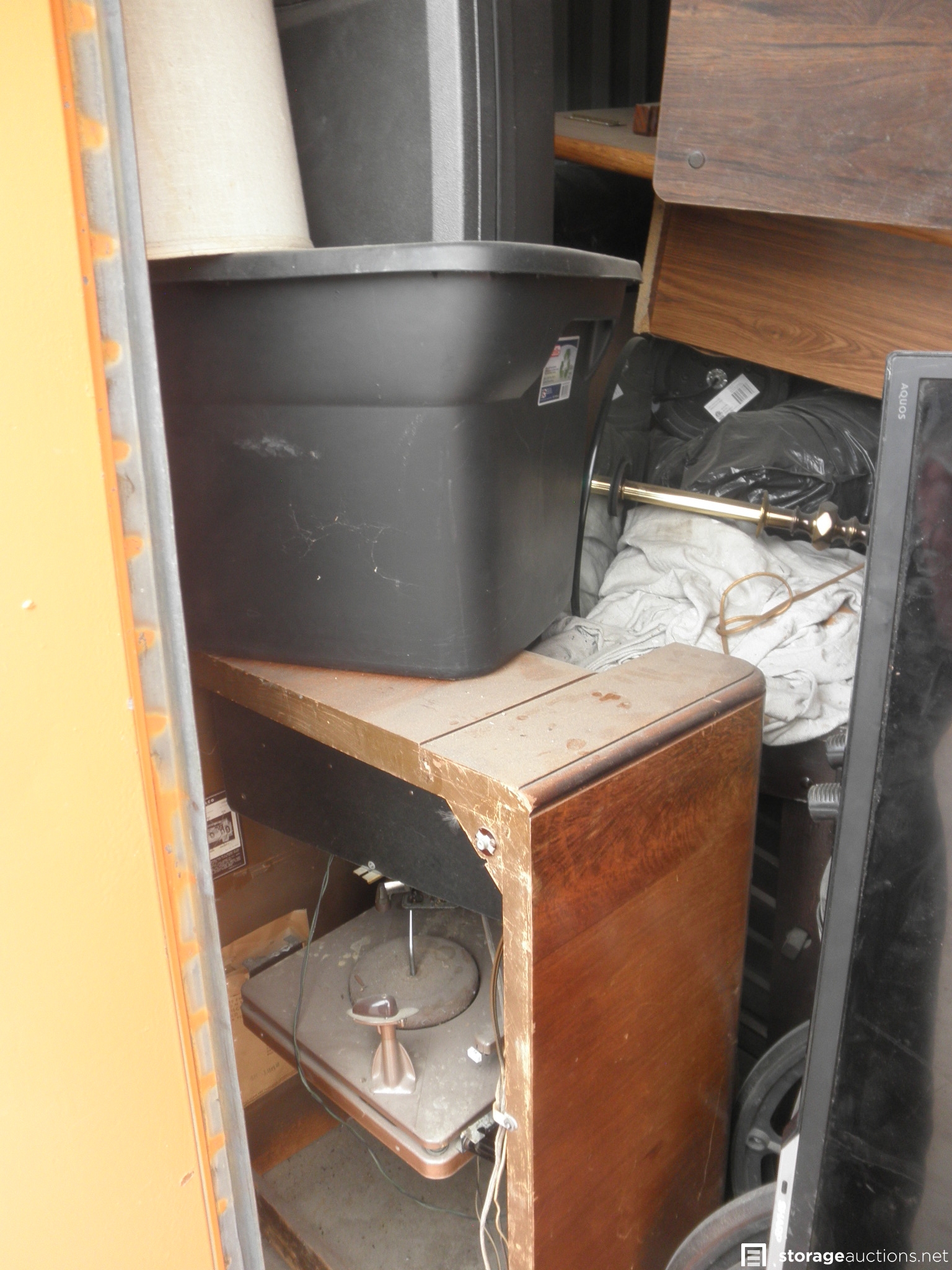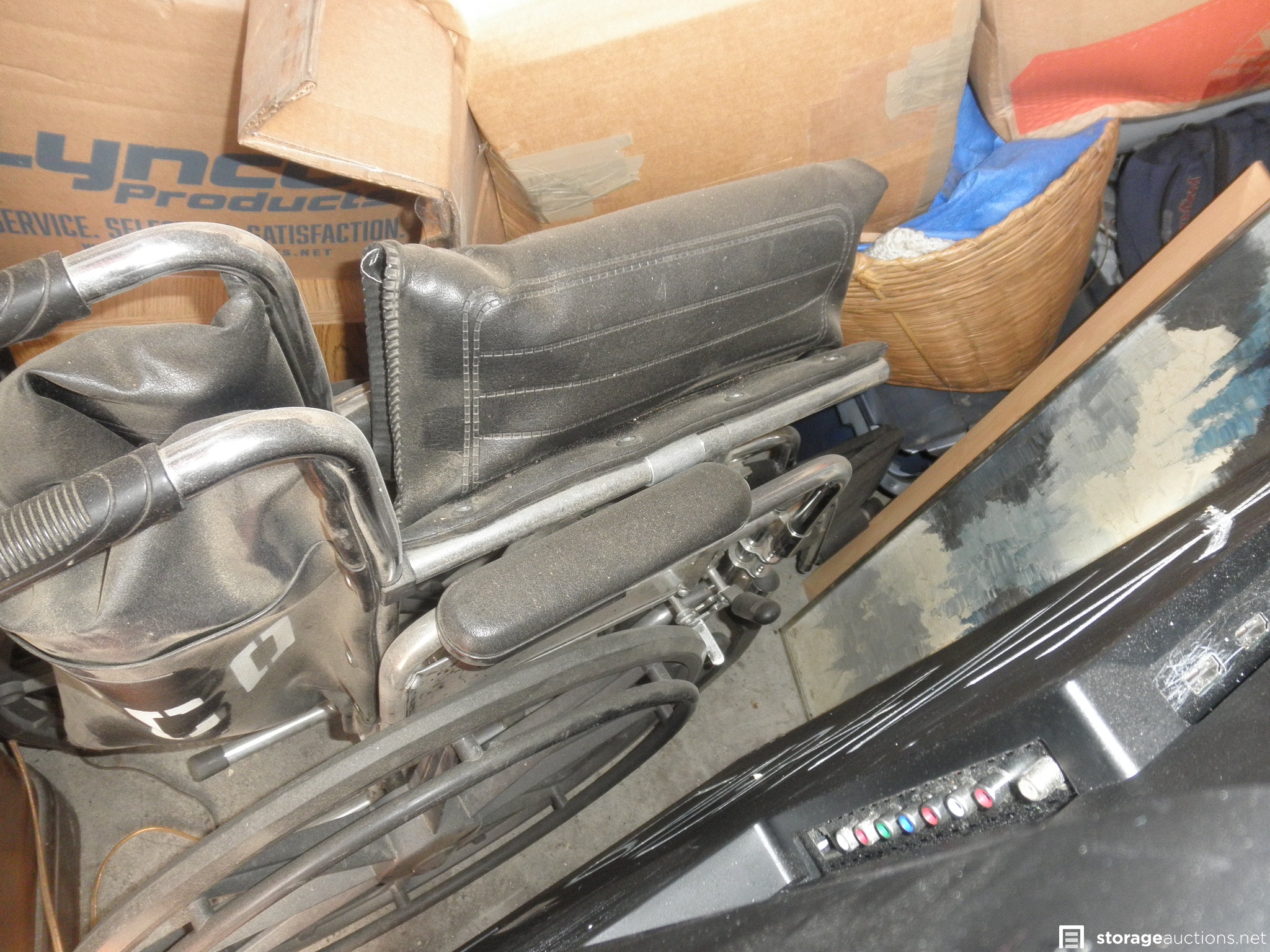 Flat screen TV, Safe, old cabinet phonograph, Wheelchair, tables, lots of boxes & bags unopened, household personal items