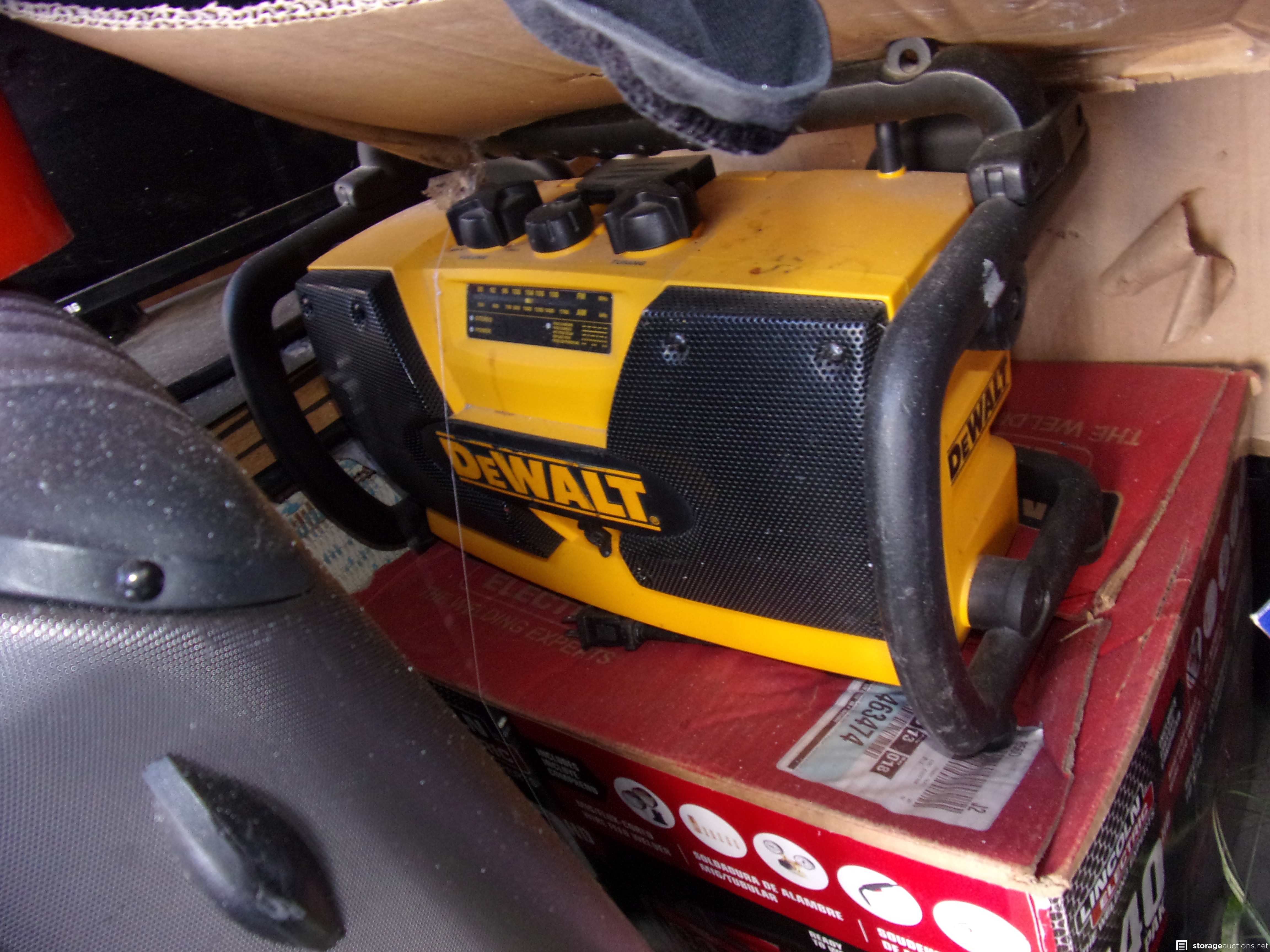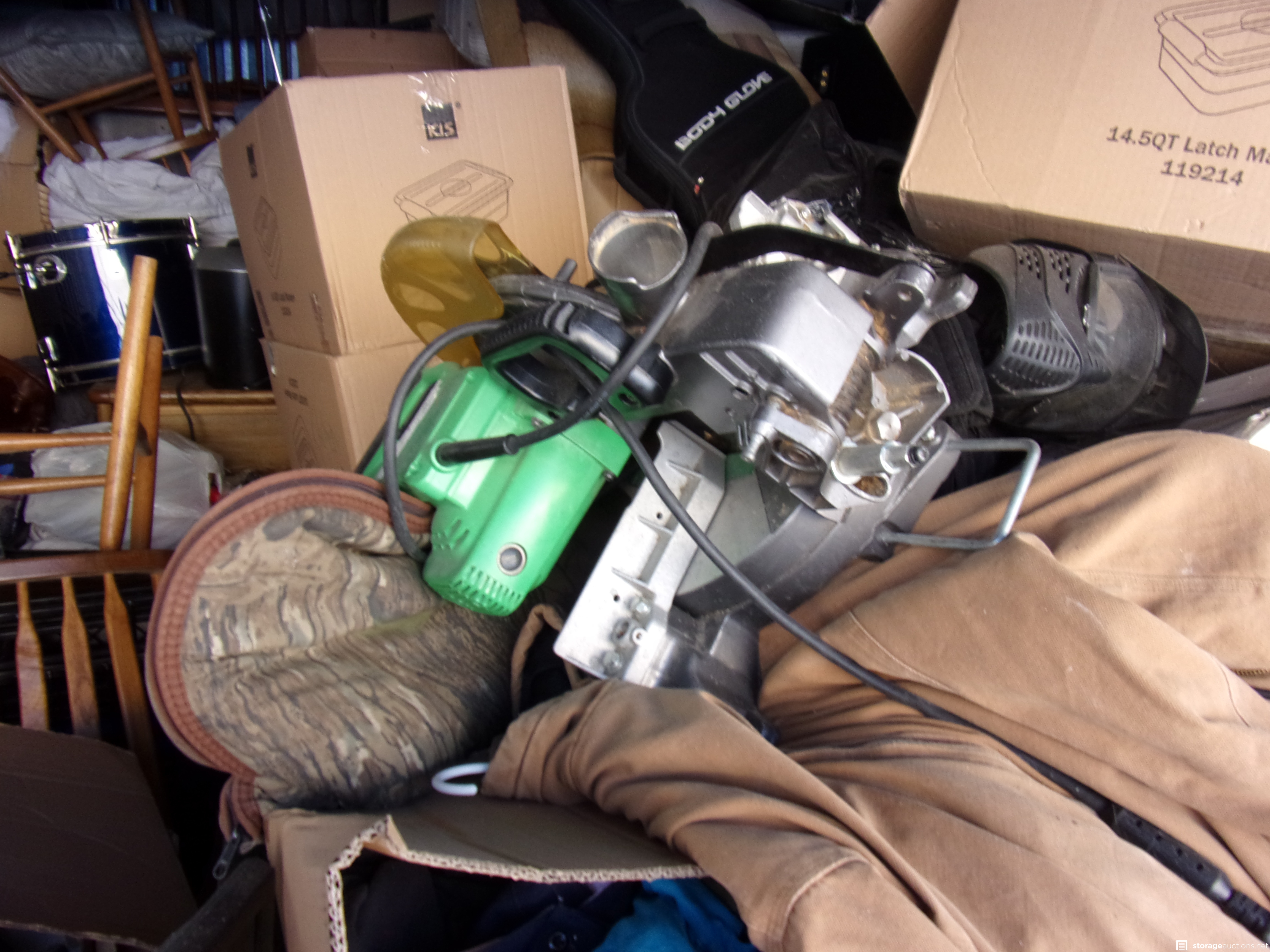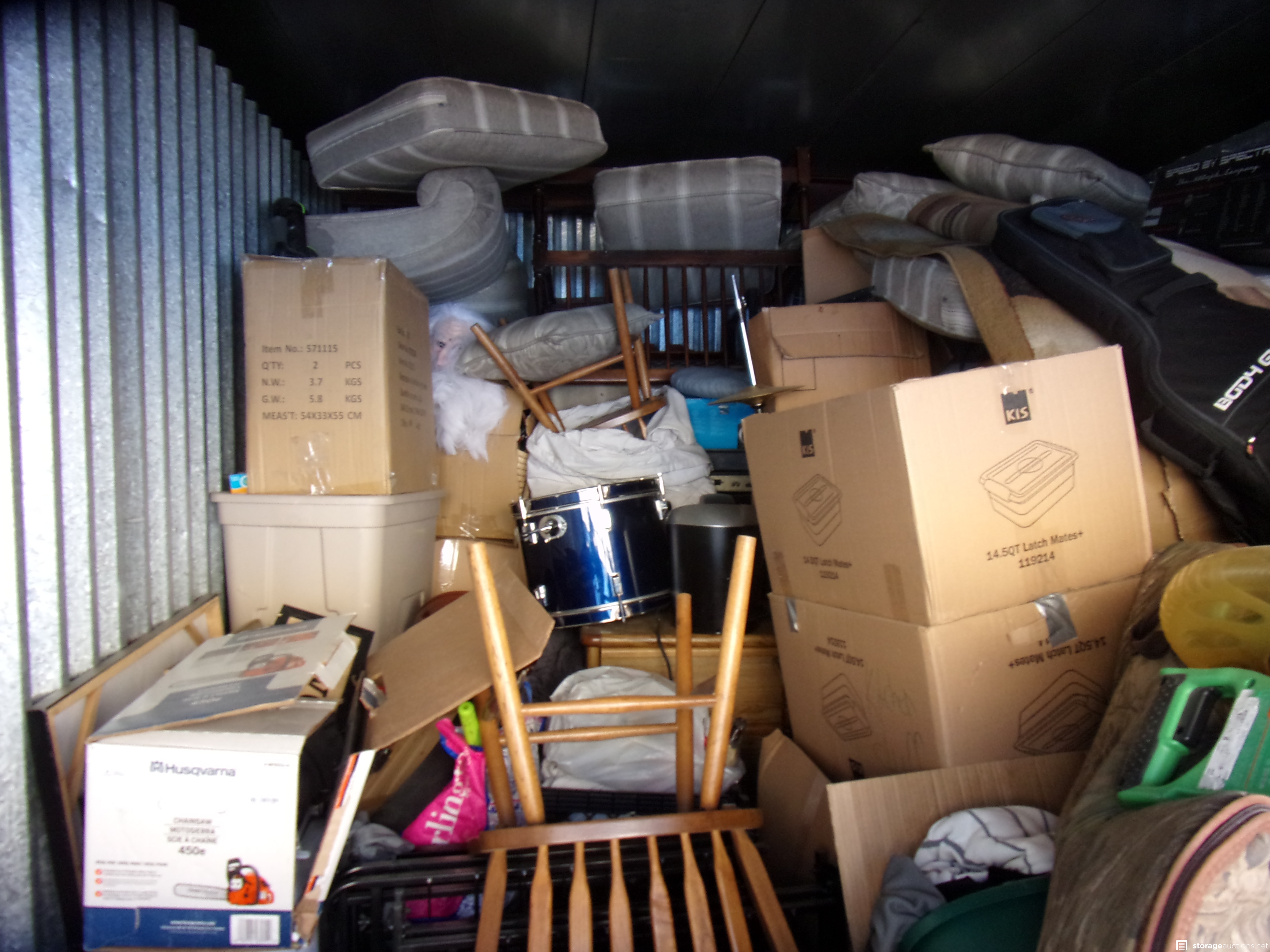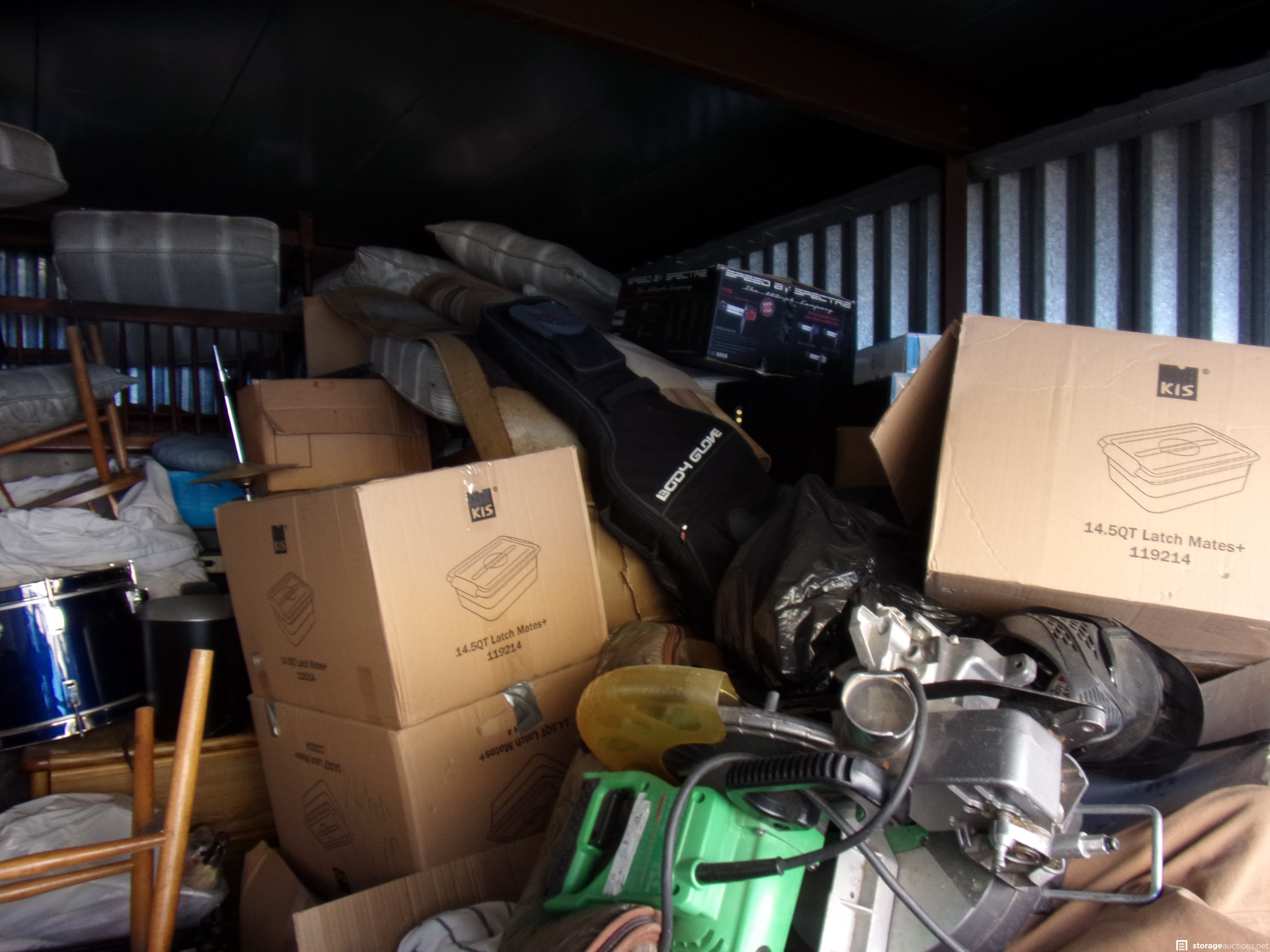 Boxes, Guitar Case, Metal Detector, Suitcase, TV, Speakers, Dresser, Dewalt Radio, Chop Saw, Drums, Chairs, Sofa, Crib