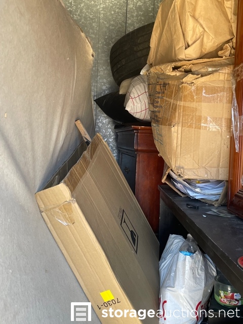 This unit appears to contain bags, box-spring, mattress, 6 boxes, clothing, mirror, lamp, refrigerator, speaker, coffee table, 2 totes, dryer or washer? carpet cleaner, furniture, car tires, wall art, misc items