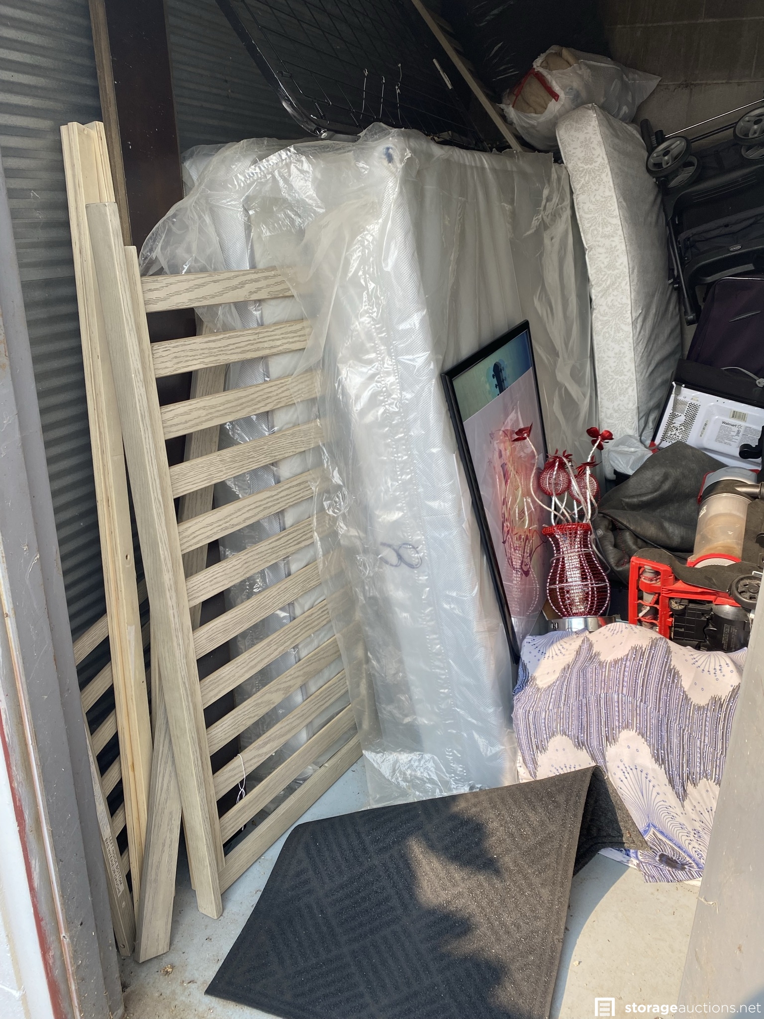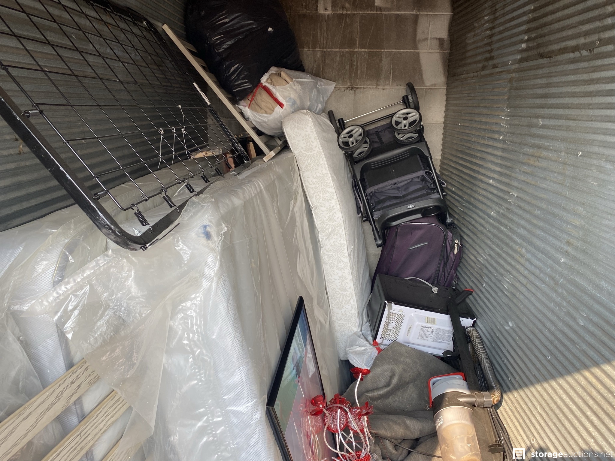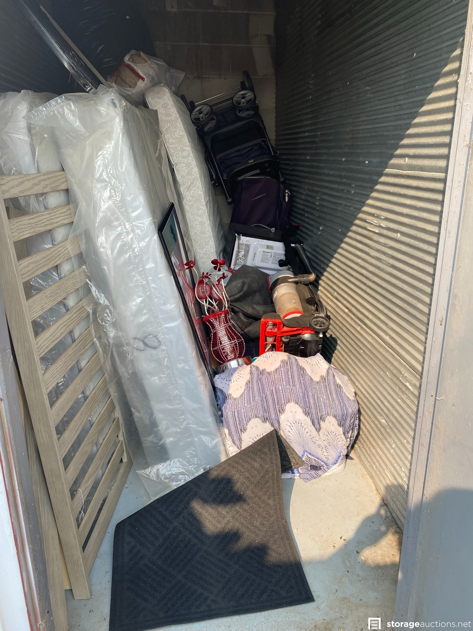 Nice crib with crib mattress, what looks like a queen mattress and box spring, stroller, microwave, suitcase, poster, etc.
