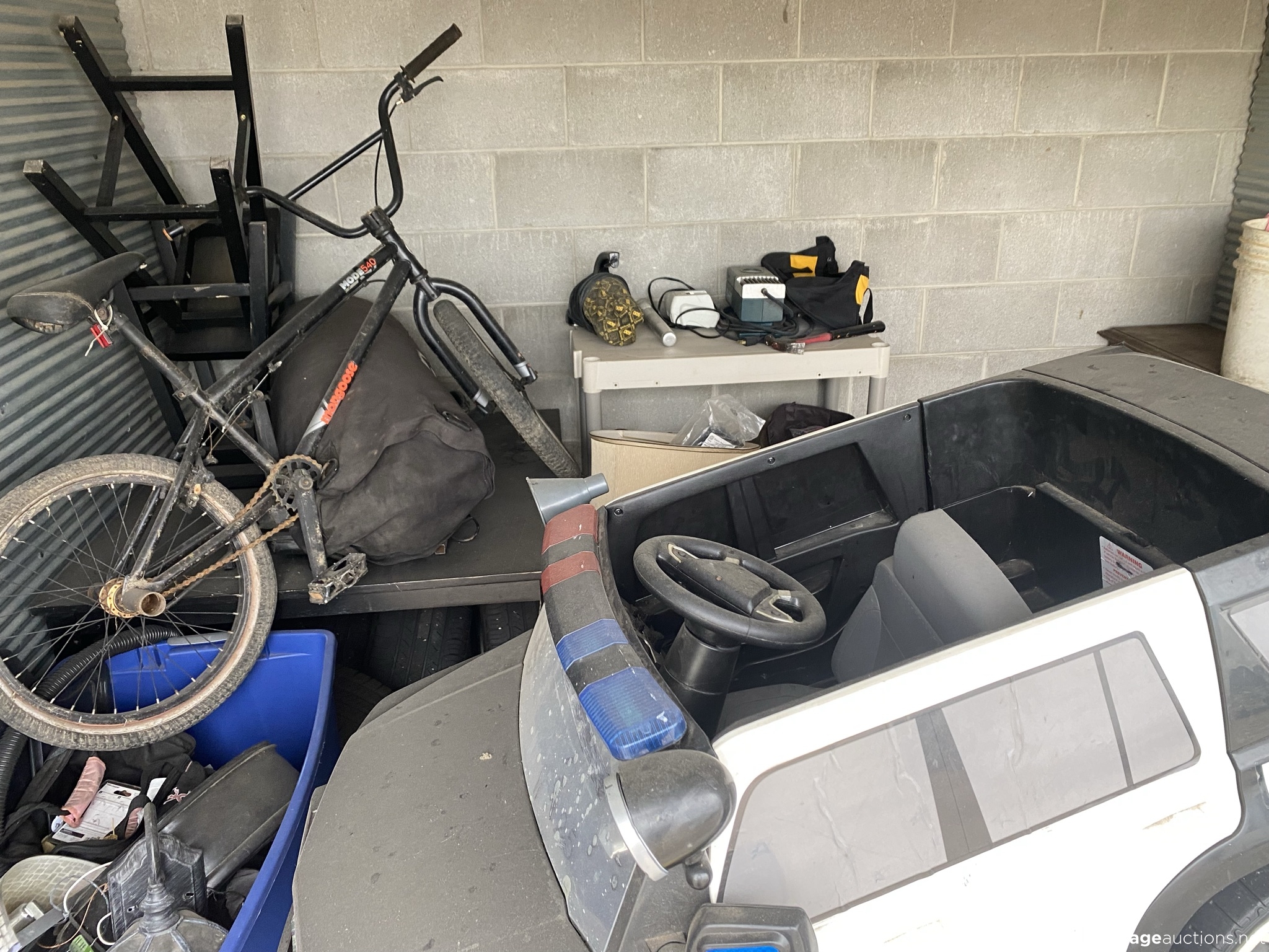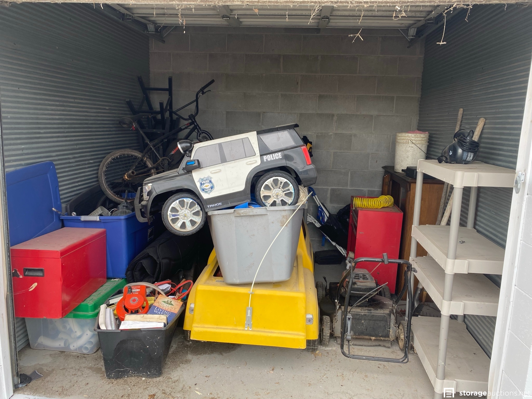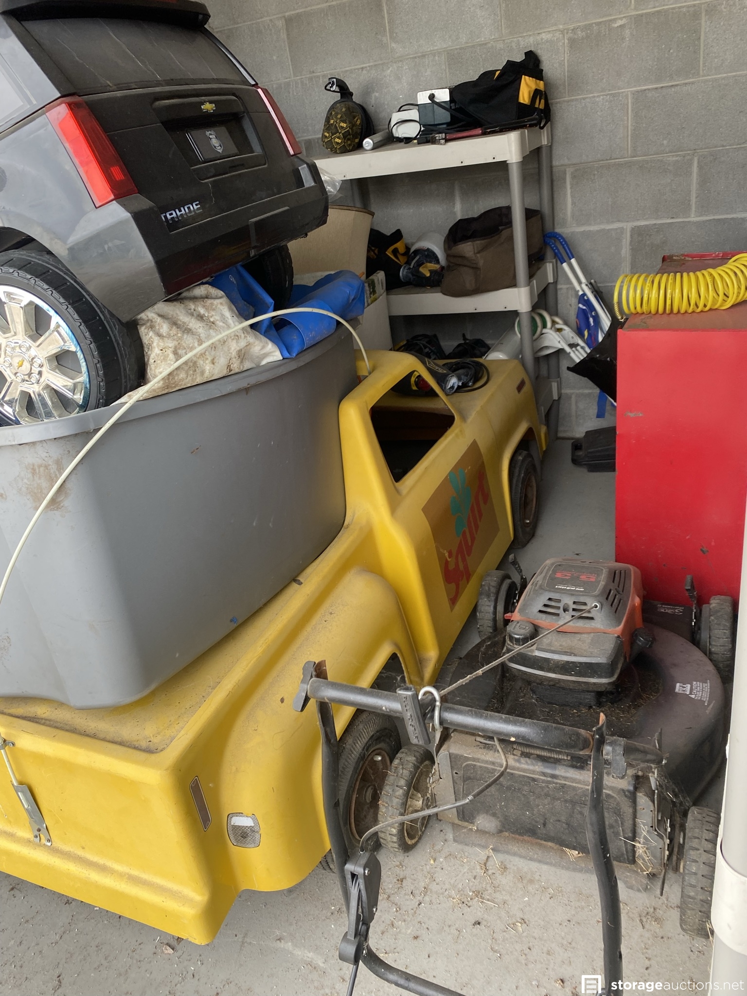 Two tool boxes, tools, BMX bike, mower, tires and rims, kids motorized cars, shelf, bar stools, etc.