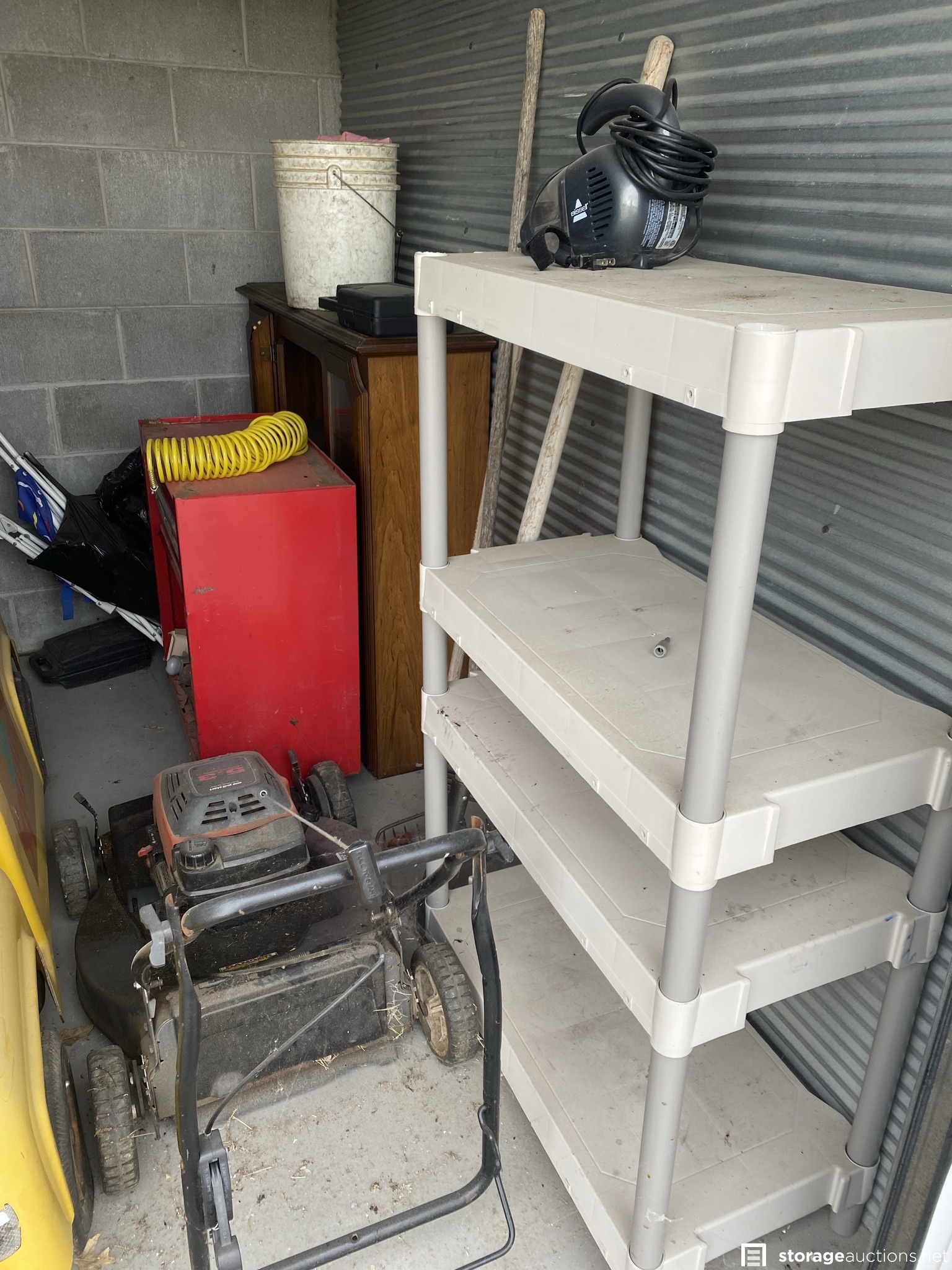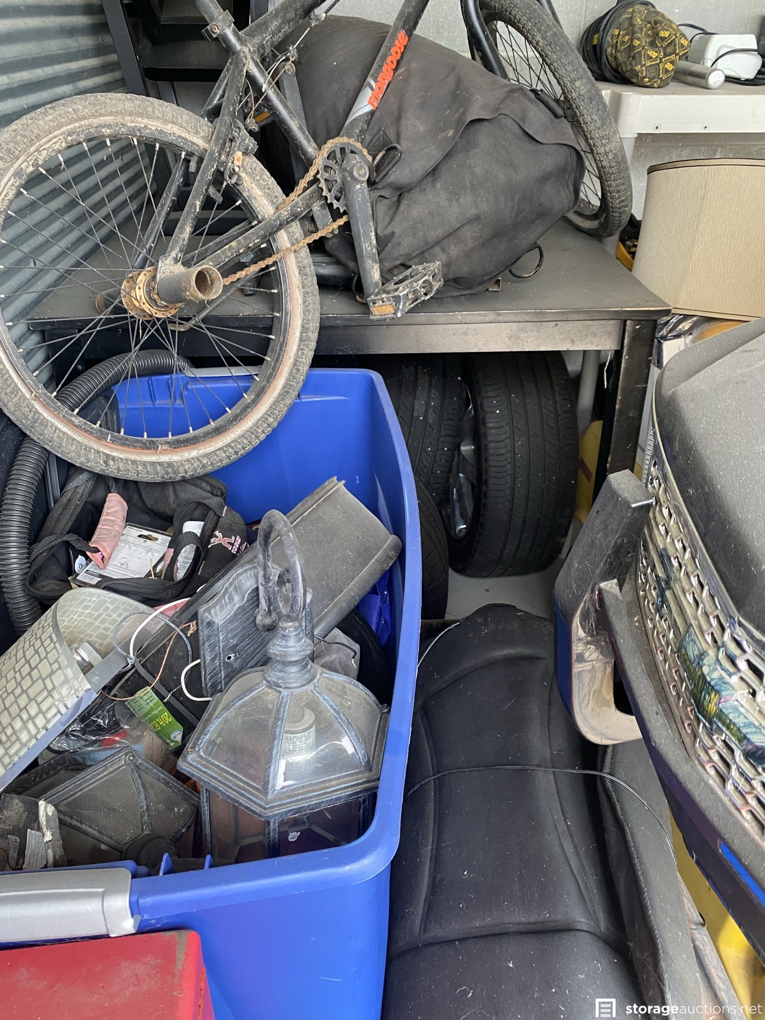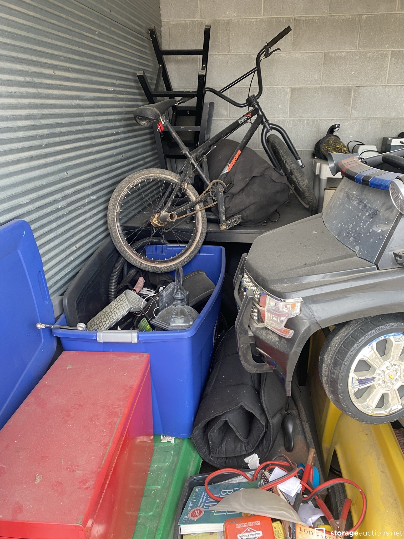 Two tool boxes, tools, BMX bike, mower, tires and rims, kids motorized cars, shelf, bar stools, etc.