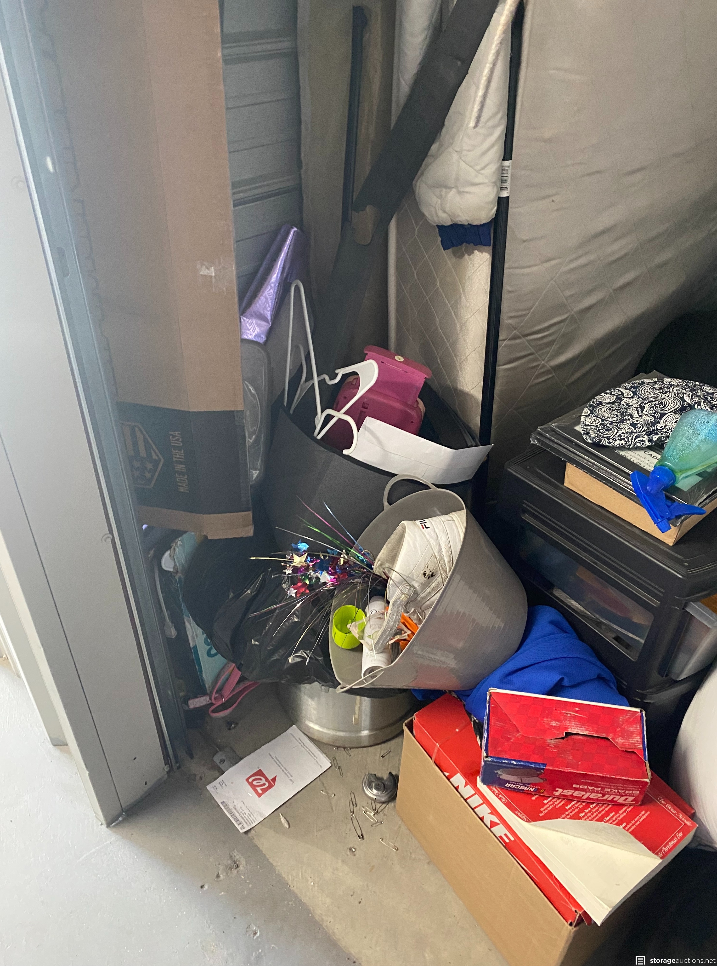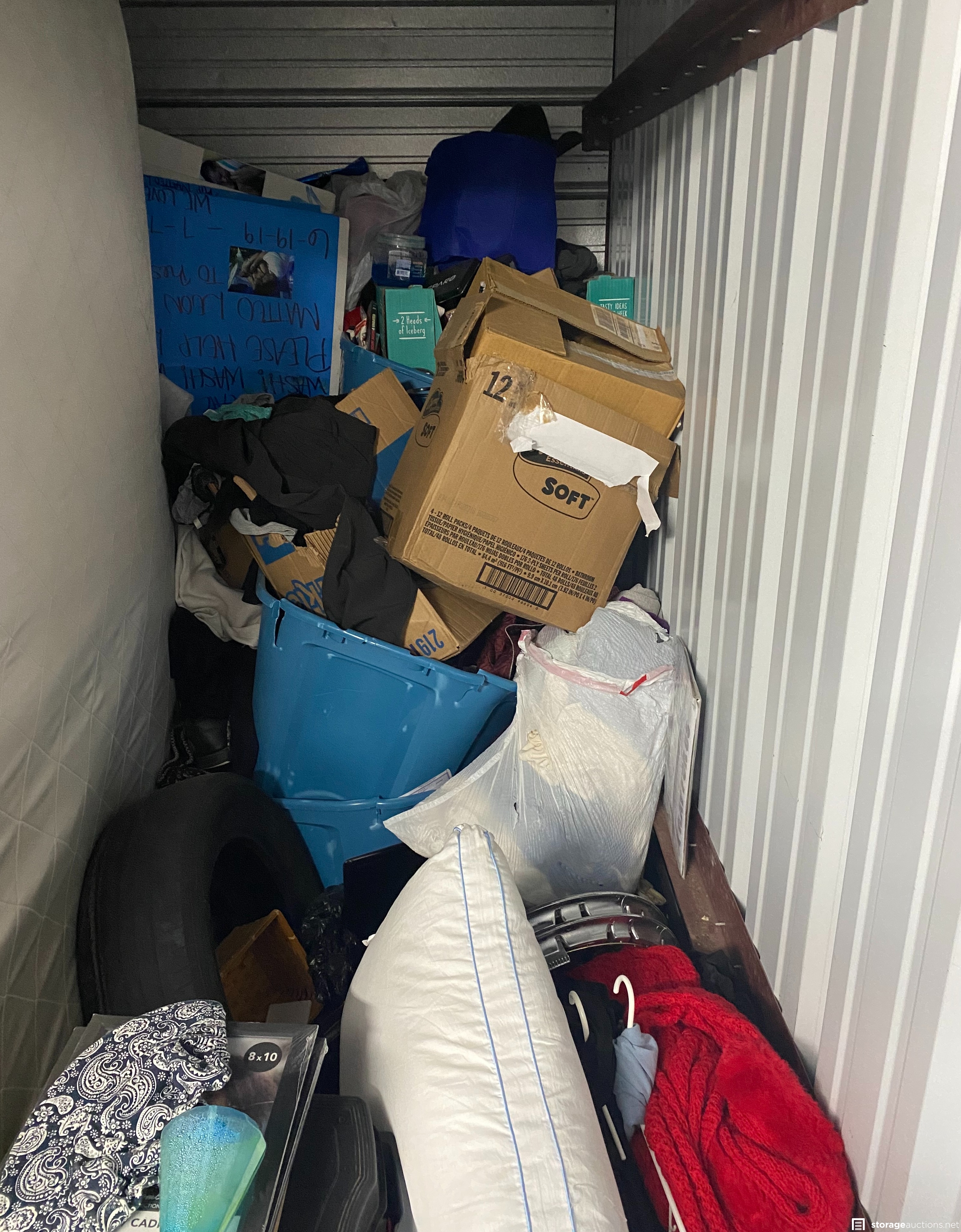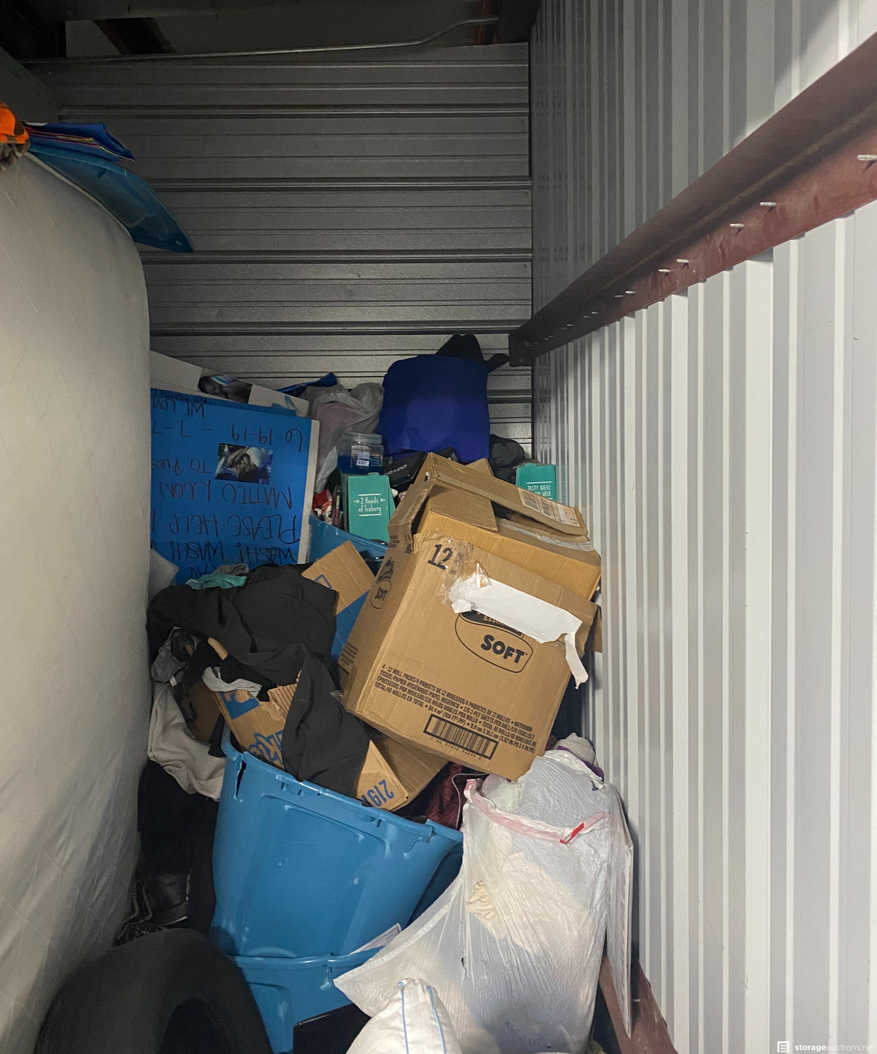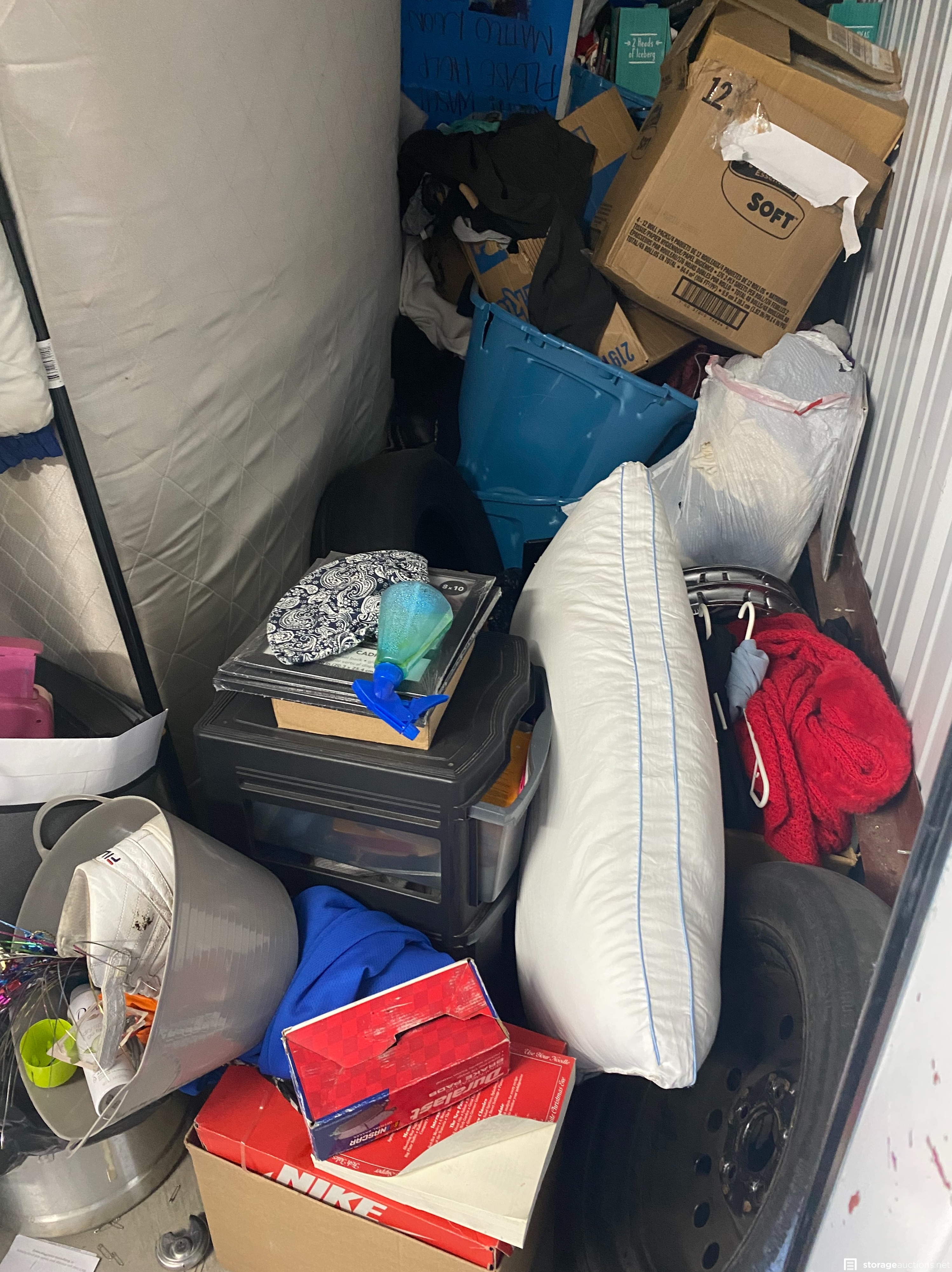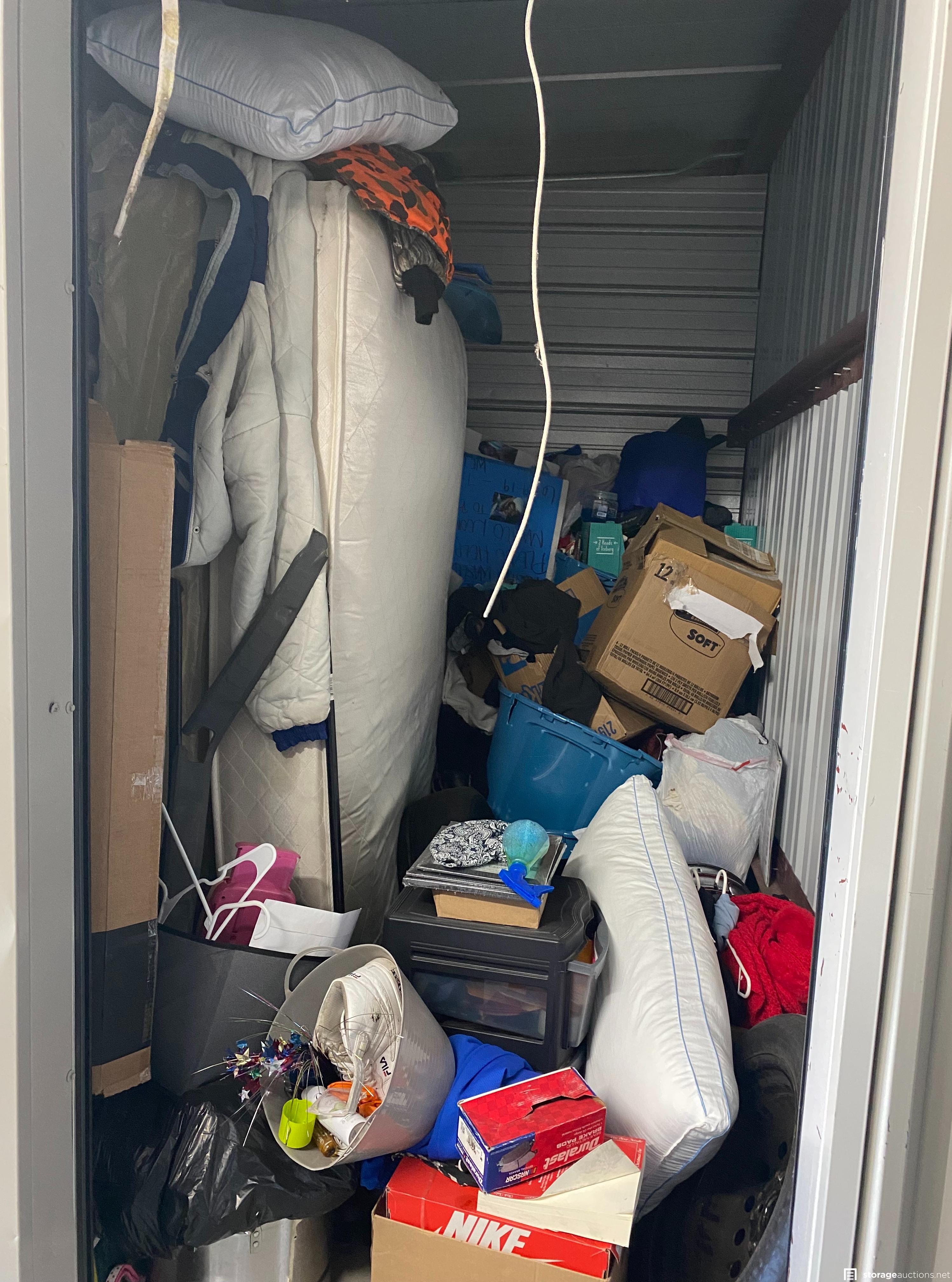 Contents of unit visibly include but not limited to: a mattress, boxes, bags, totes, clothes, and misc.