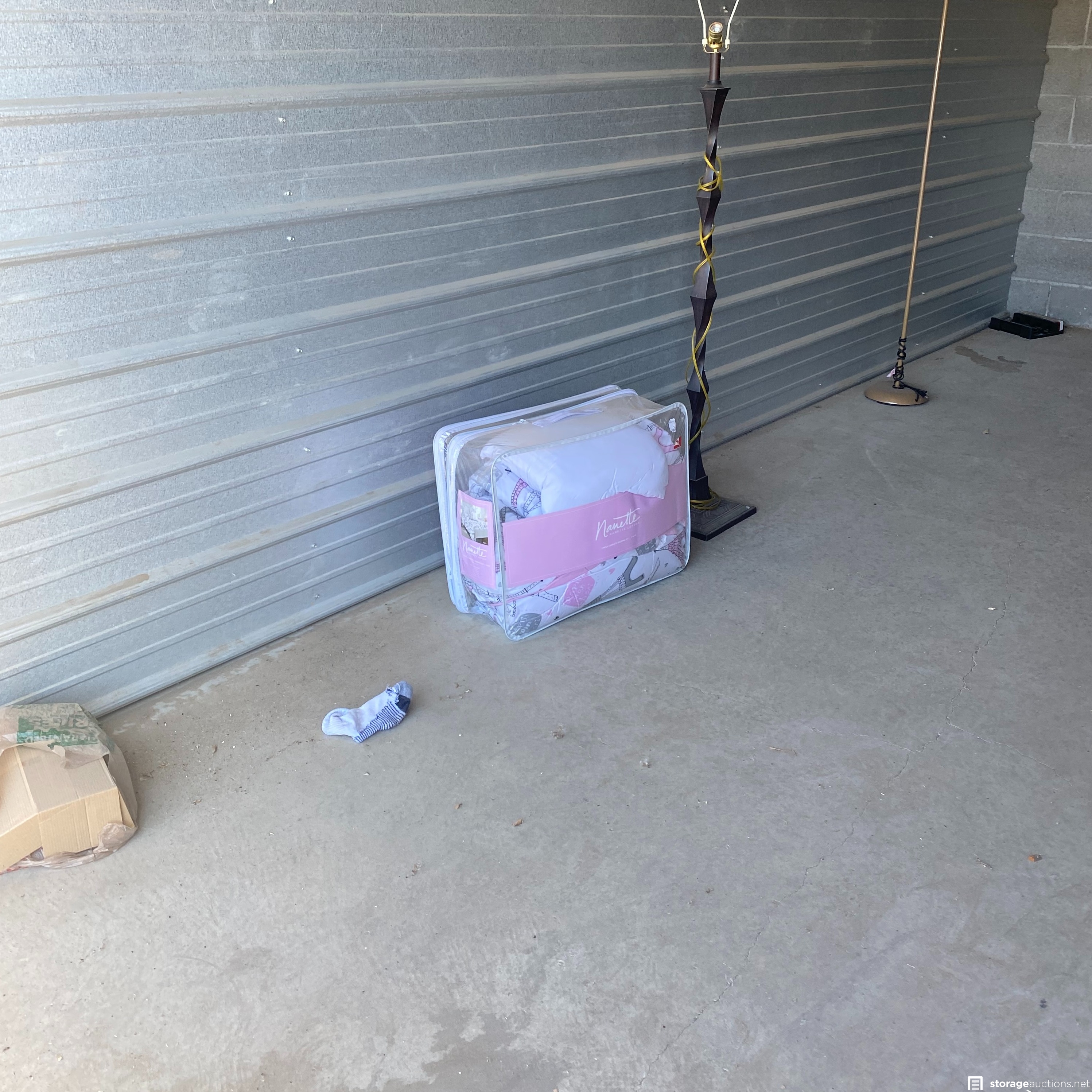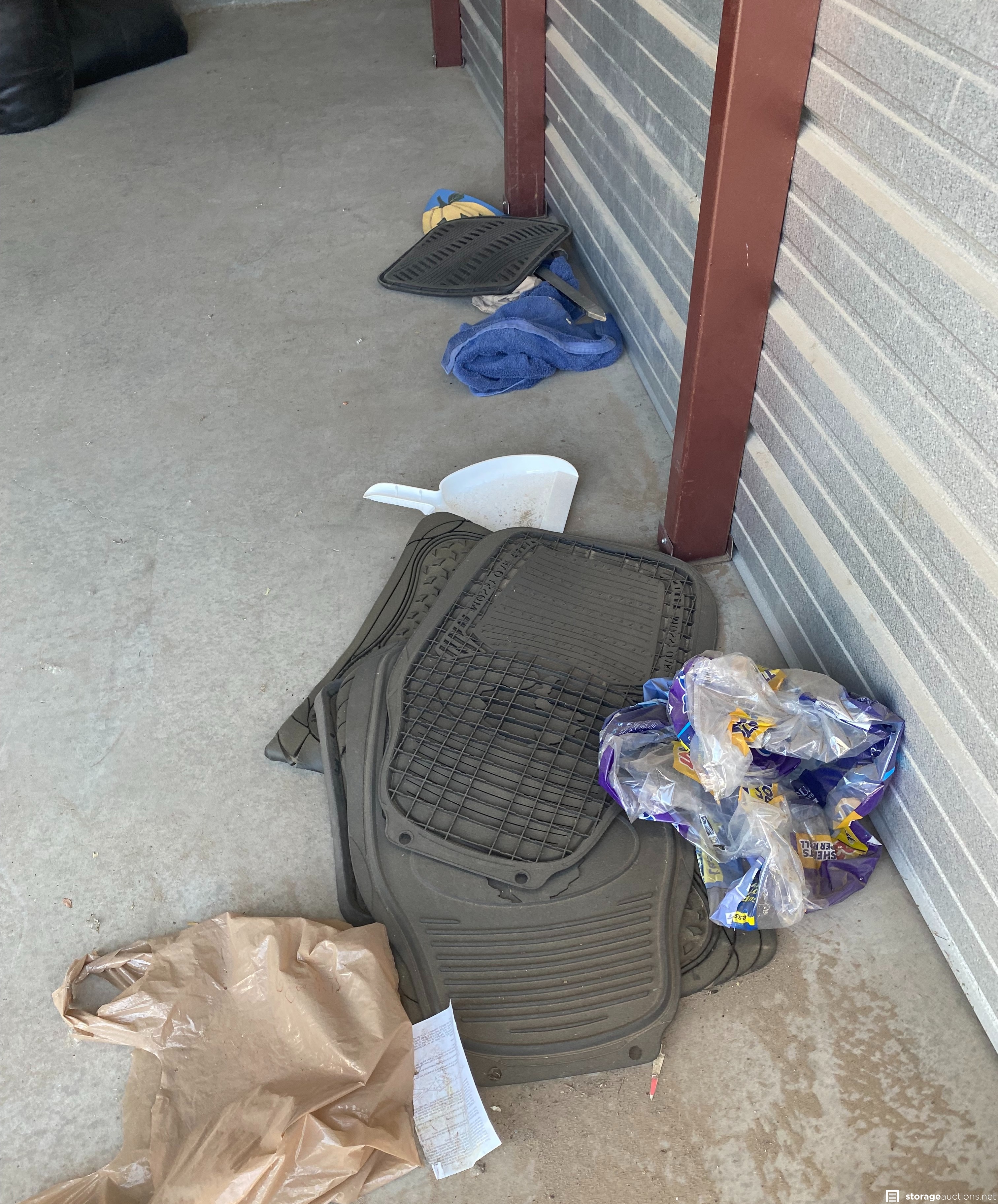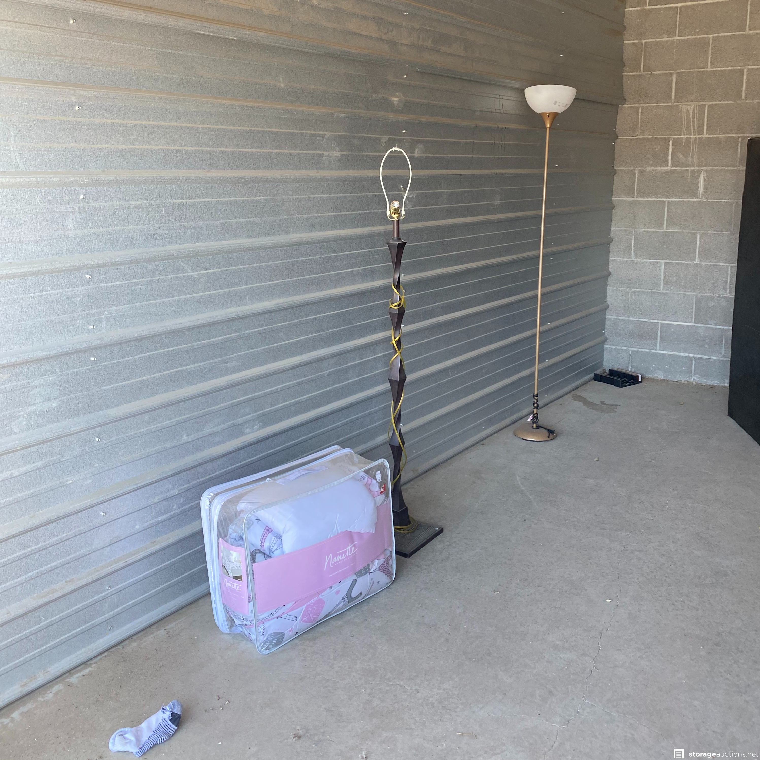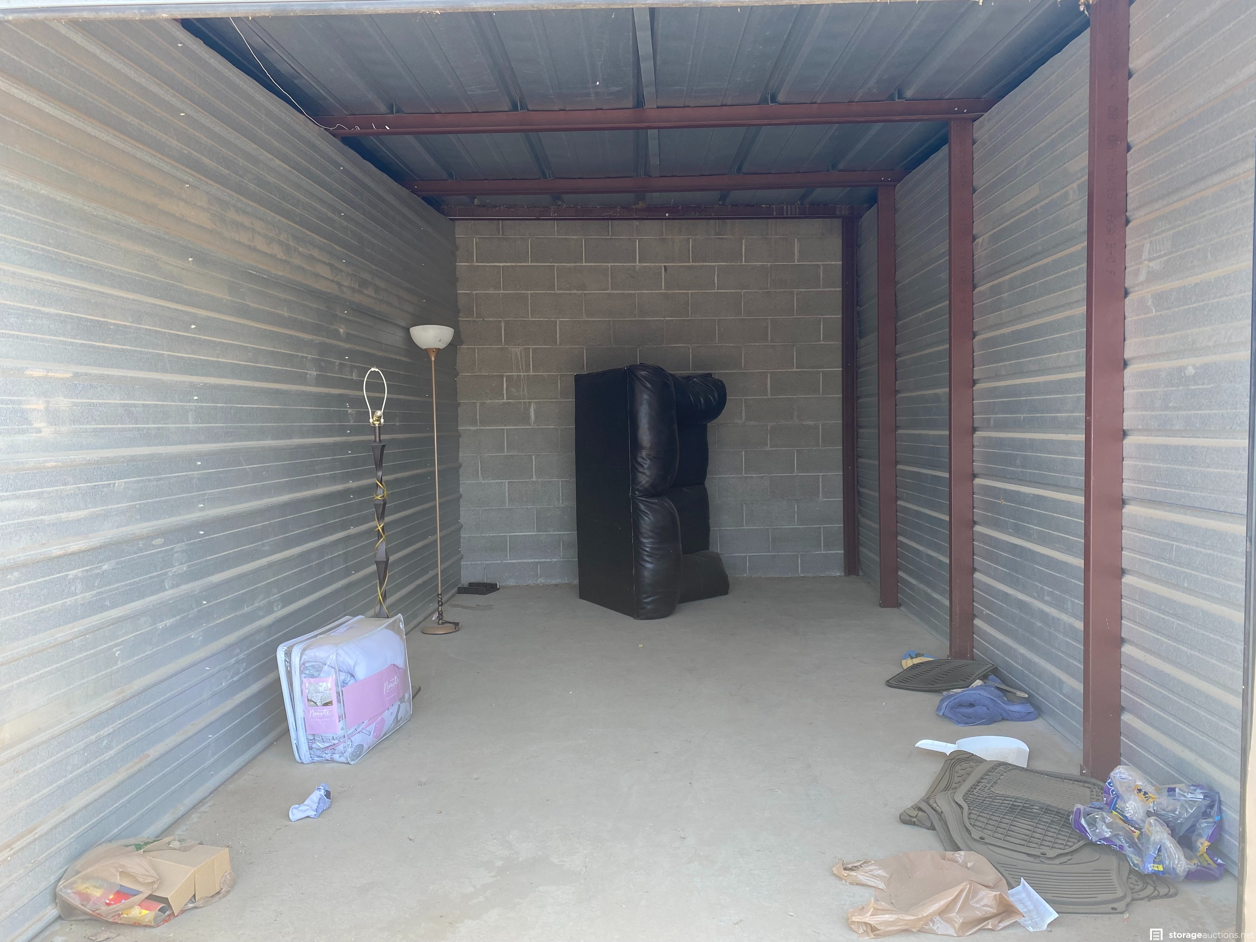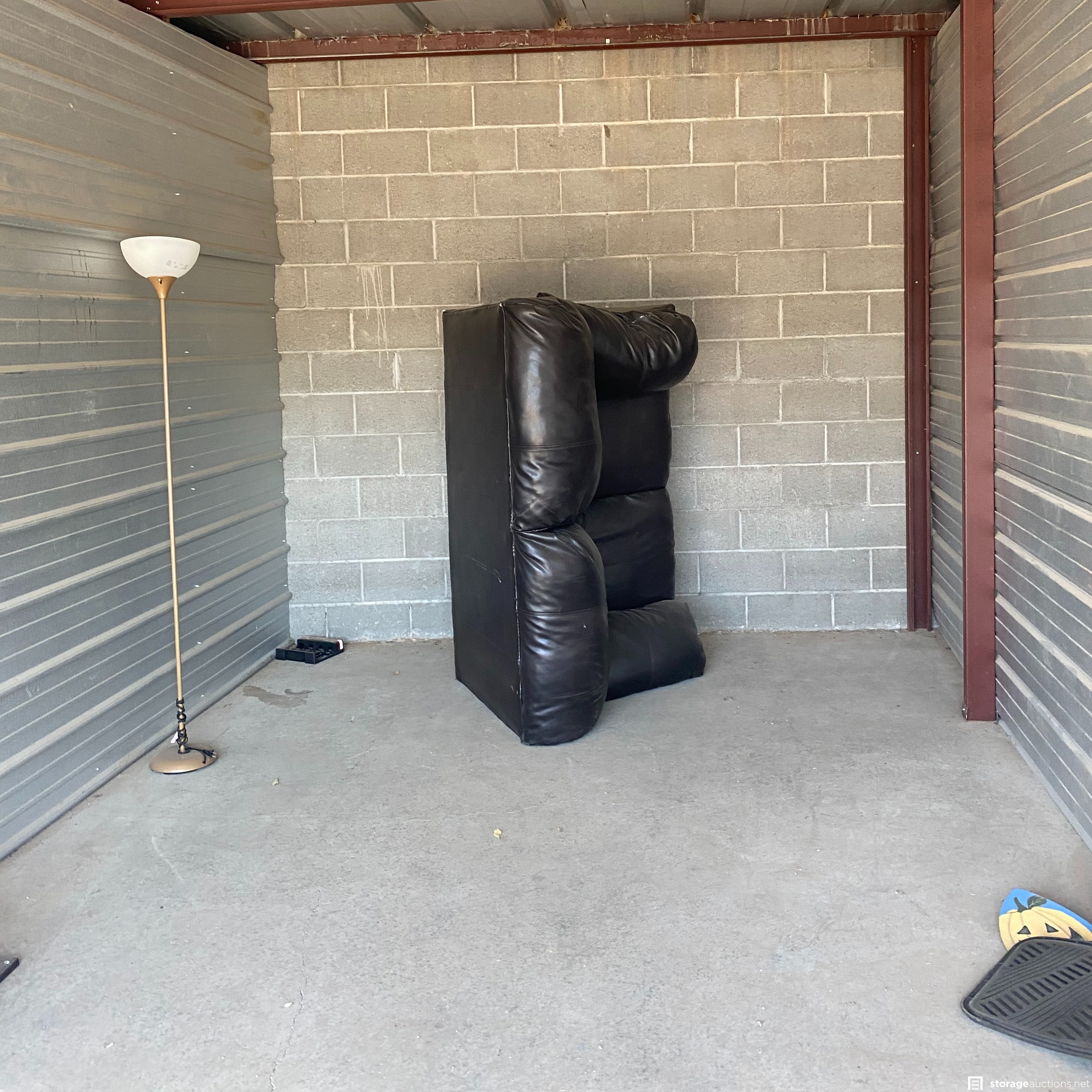 Contents of the unit visibly include but not limited to: a black leather loveseat, car floor mats, a blanket, two lamps, and misc.