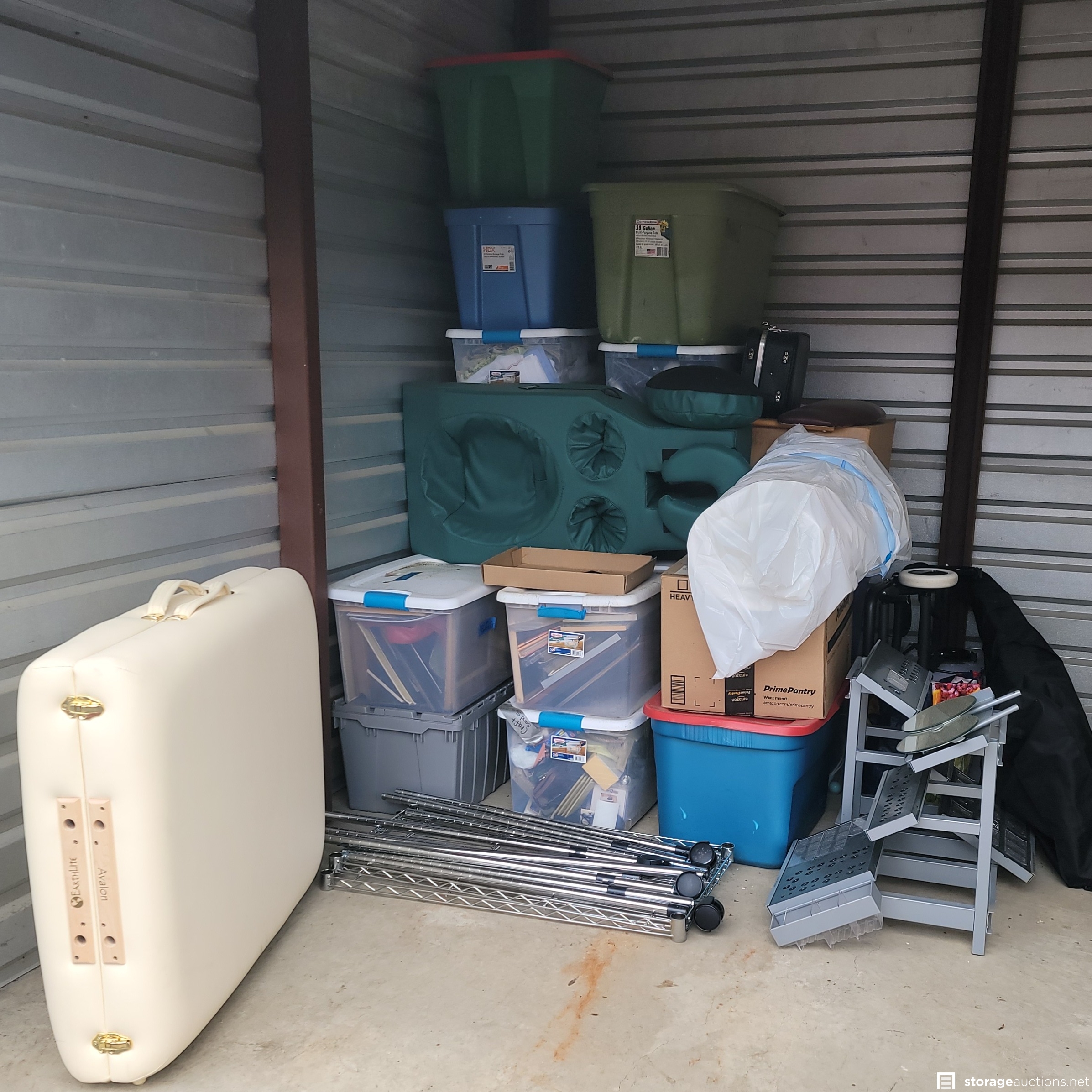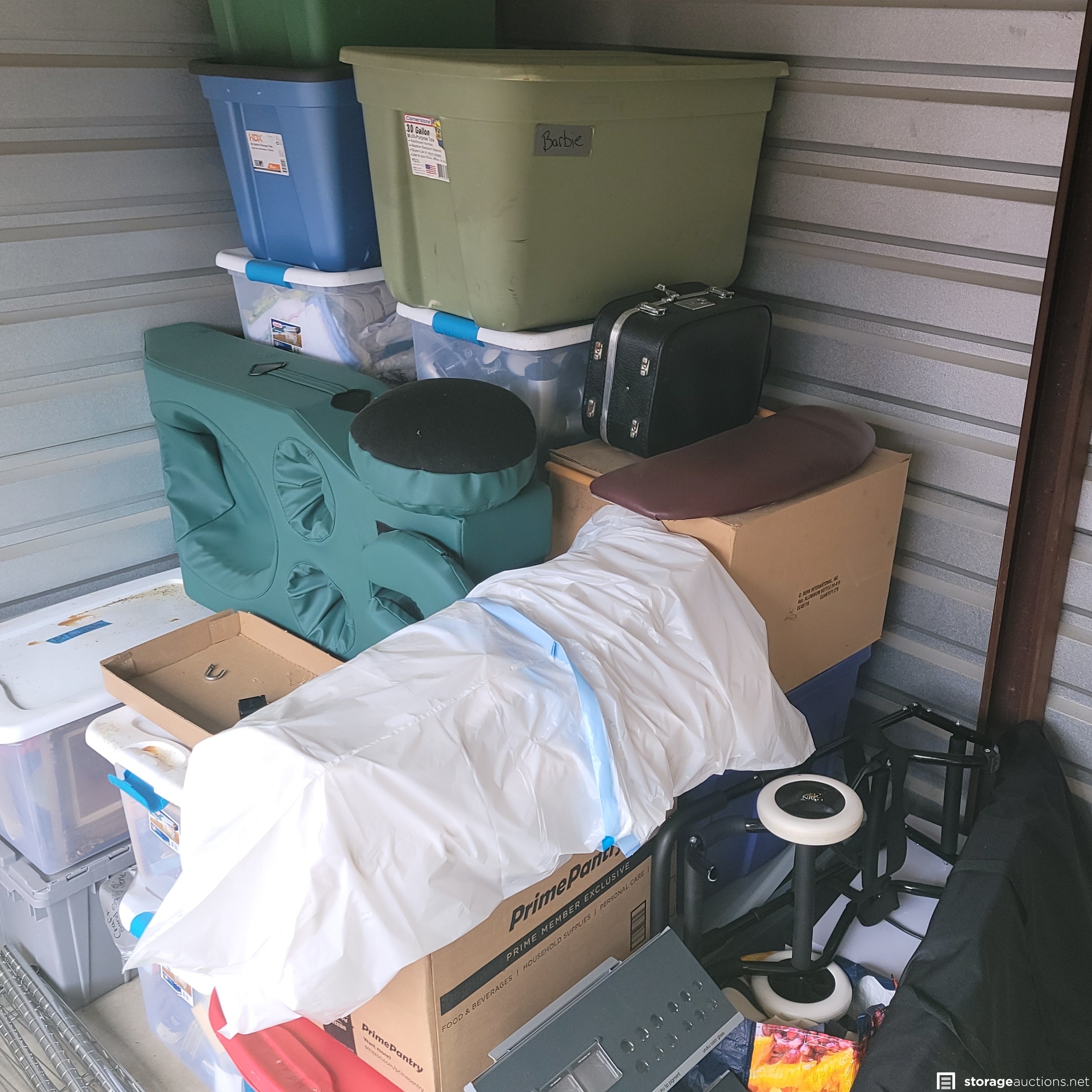 Contains a massage table and miscellaneous boxes.