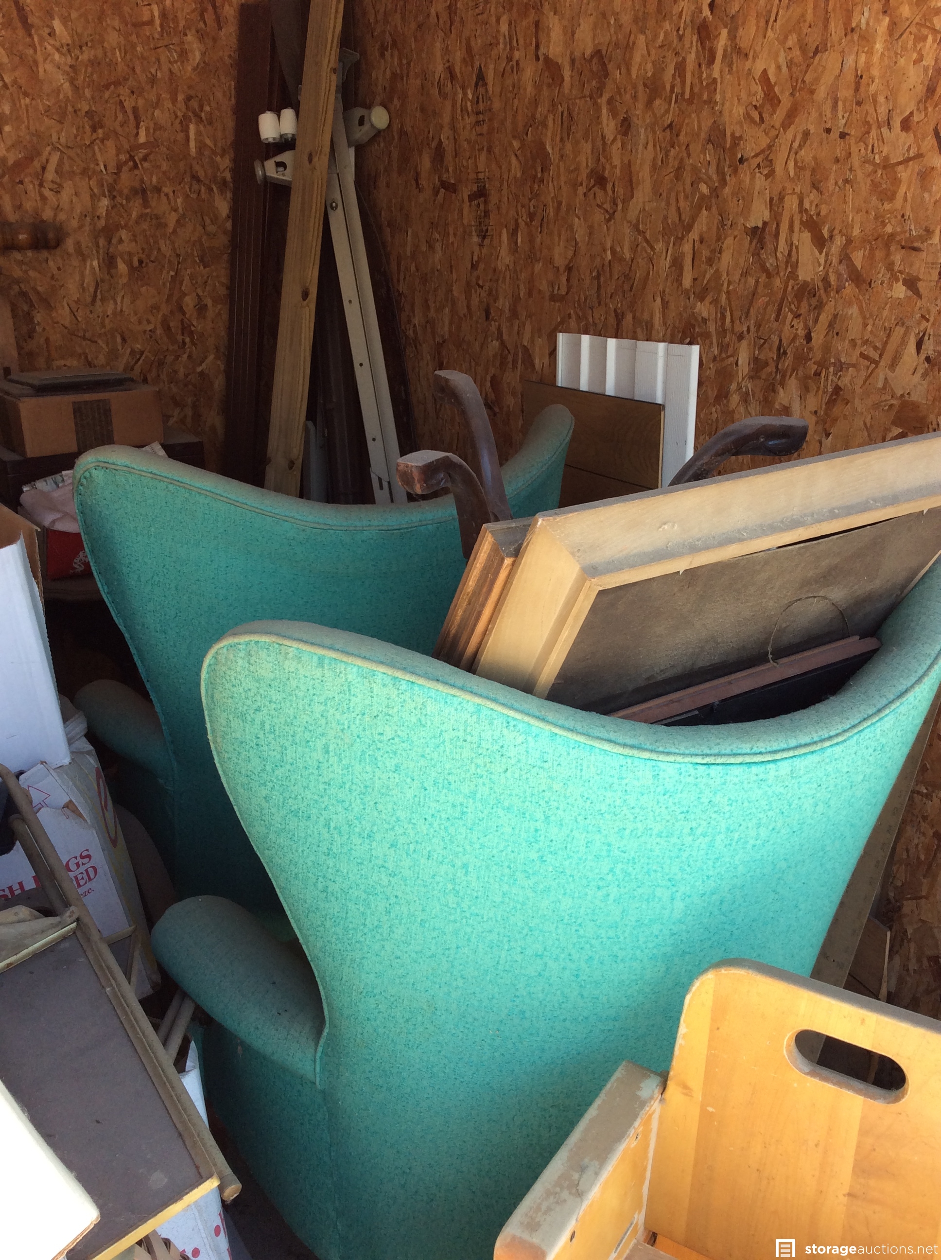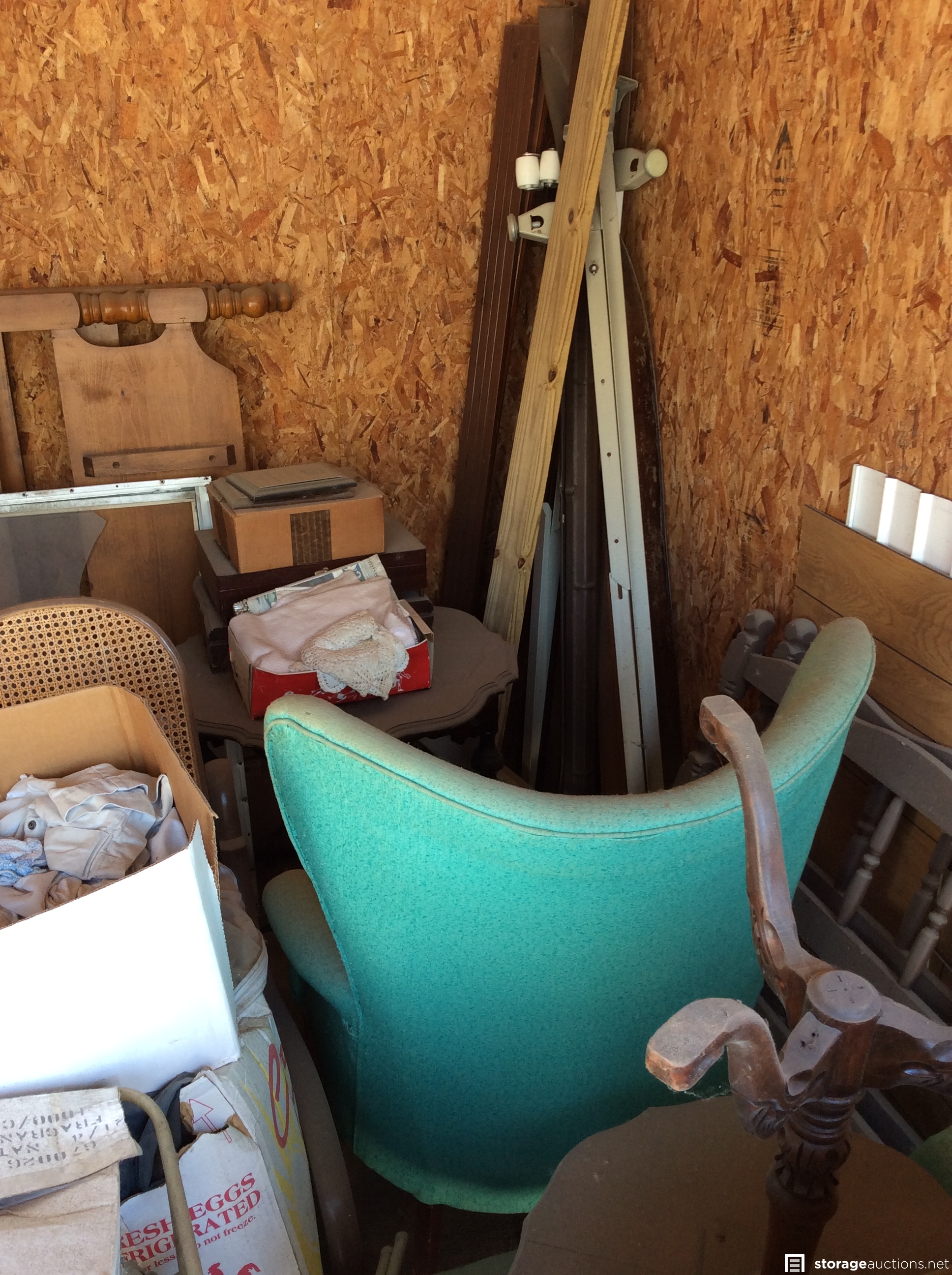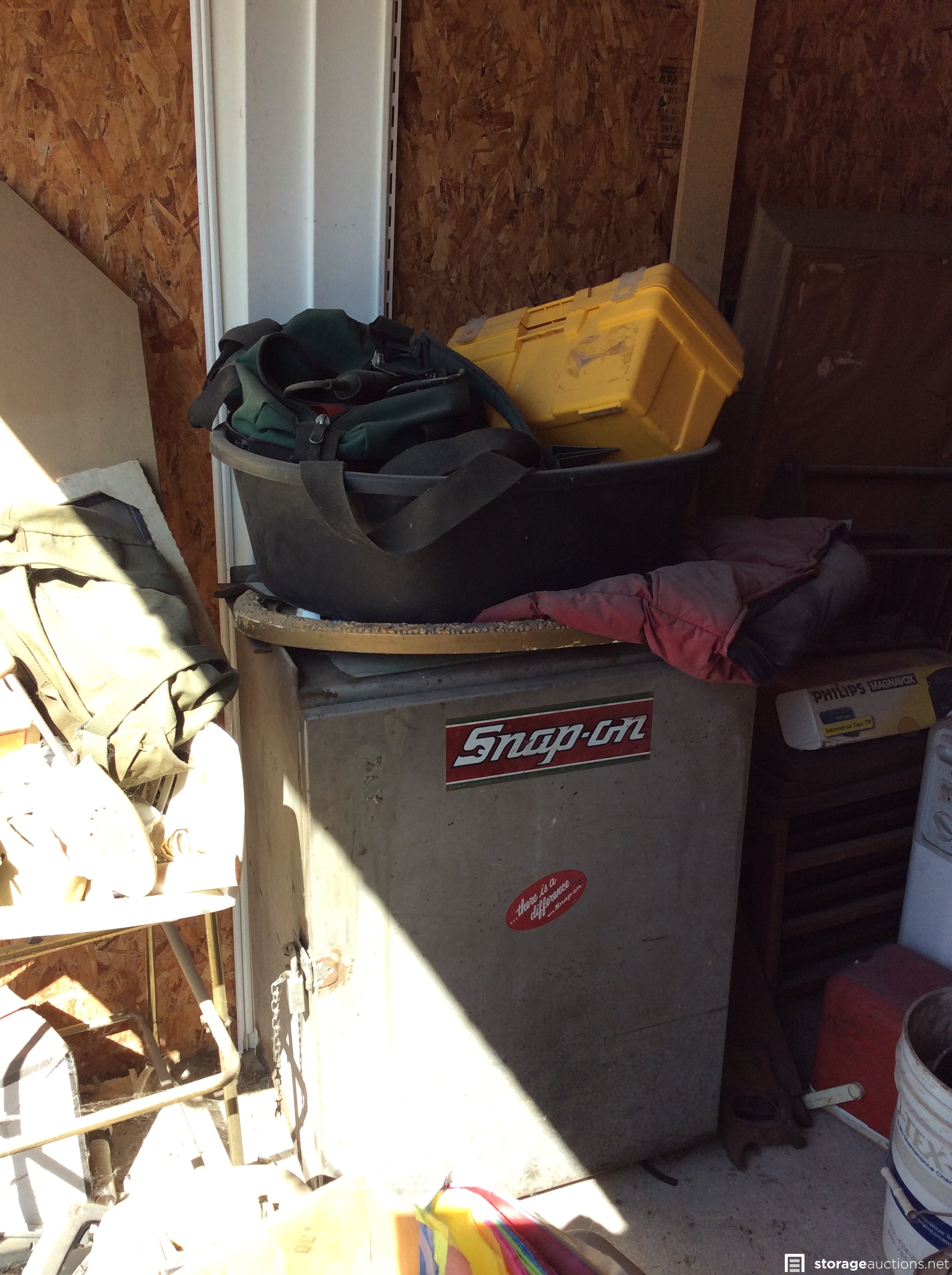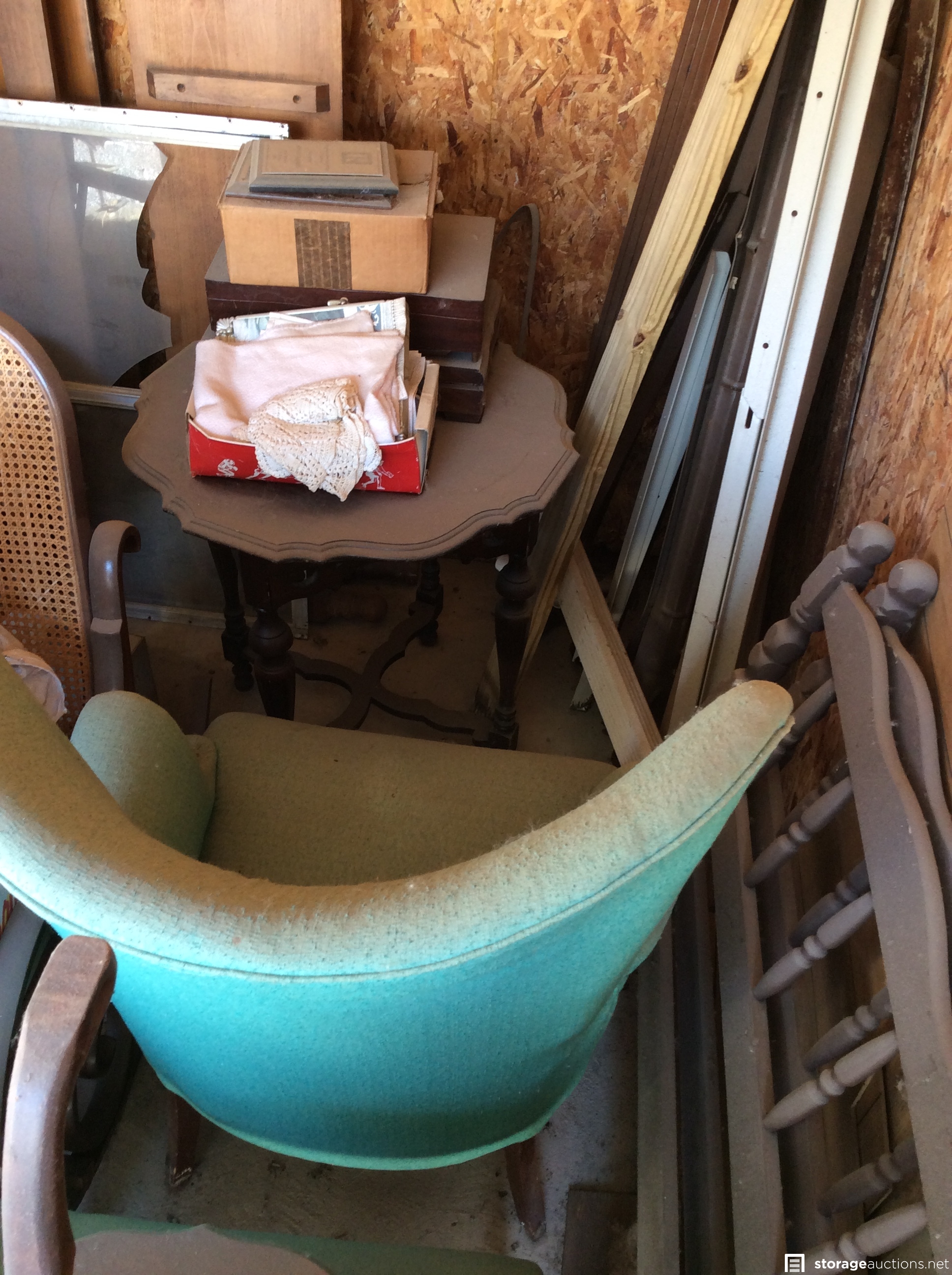 Snap-on Tool cabinet w/padlock, small wooden chairs, framed art, wooden jewelry type boxes, bed frames, lamp, chest of drawers, large tote, upholstered chairs, small wooden table, several boxes