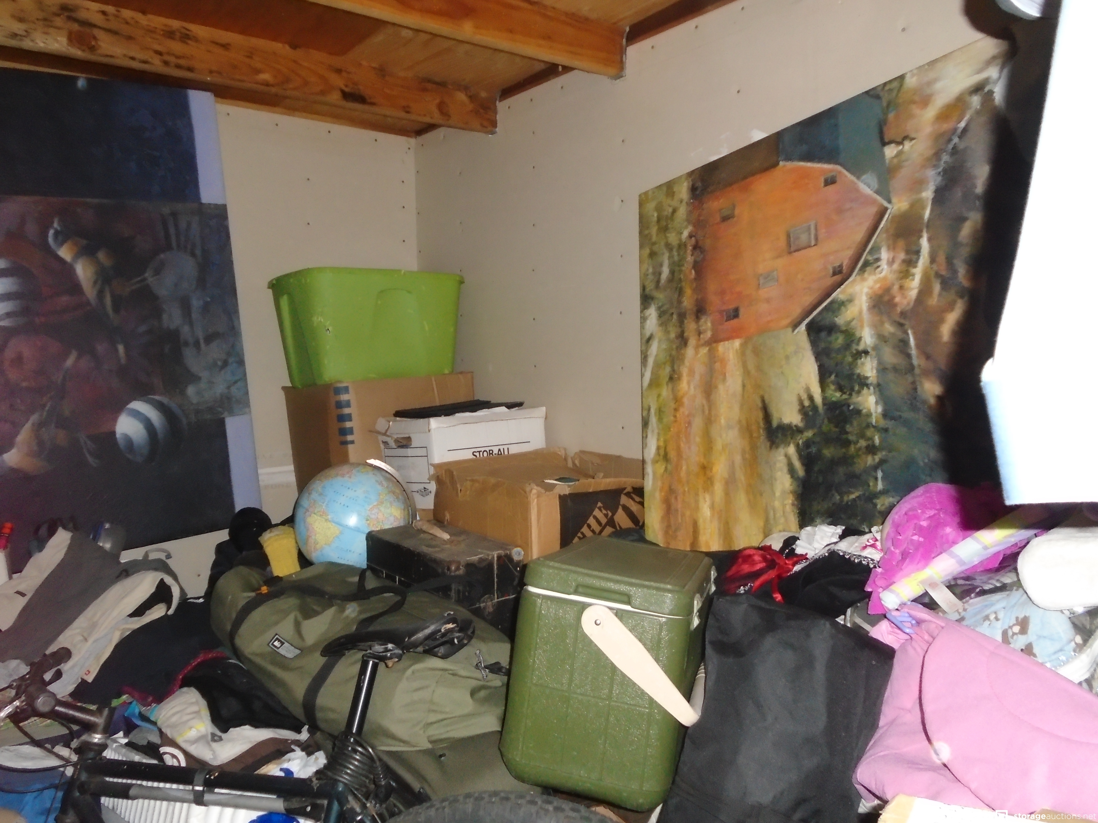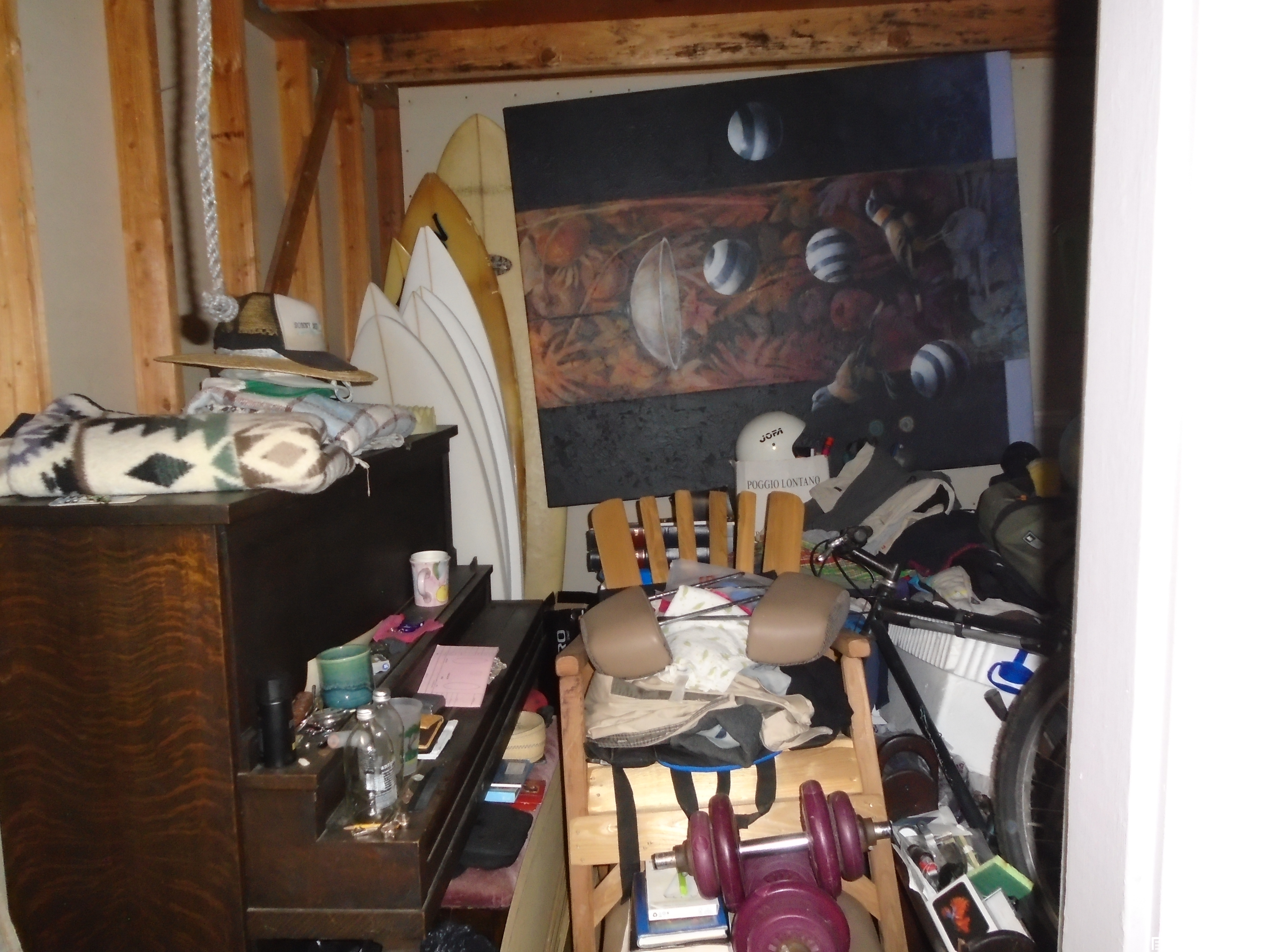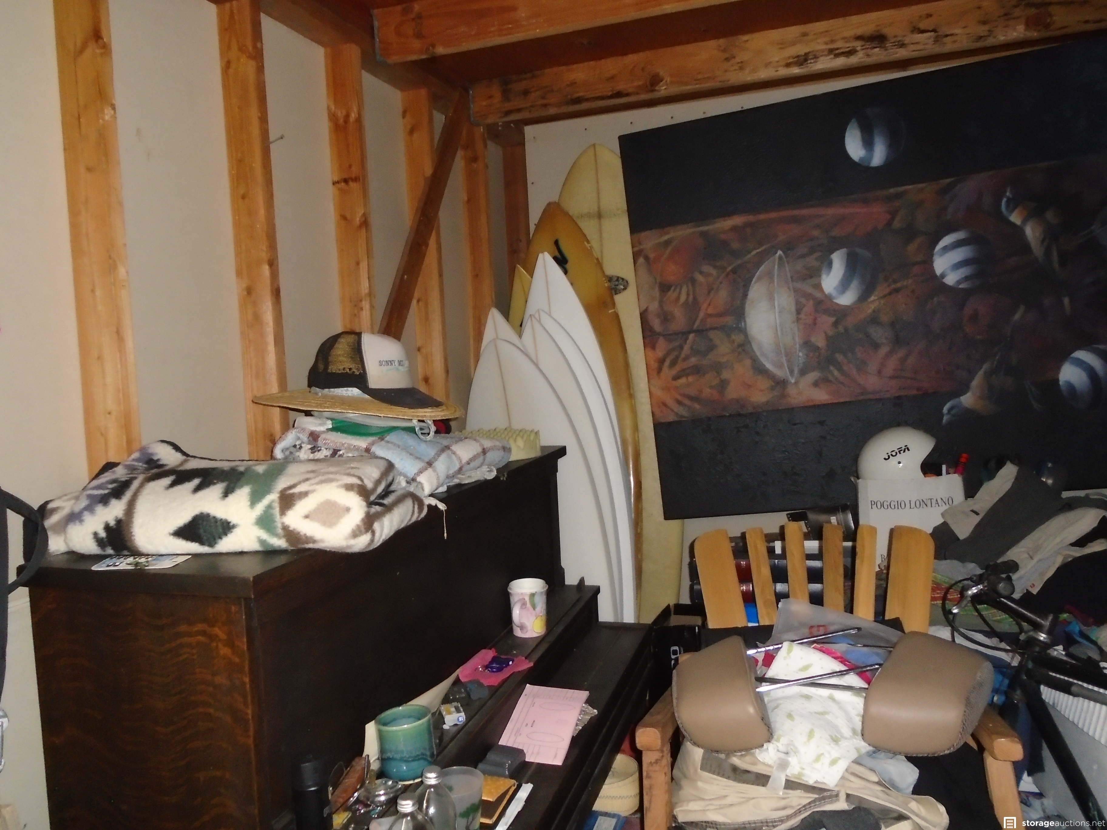 Boxes, Surfboards x9, ski equipment, chairs, piano, bicycle, ez up tent