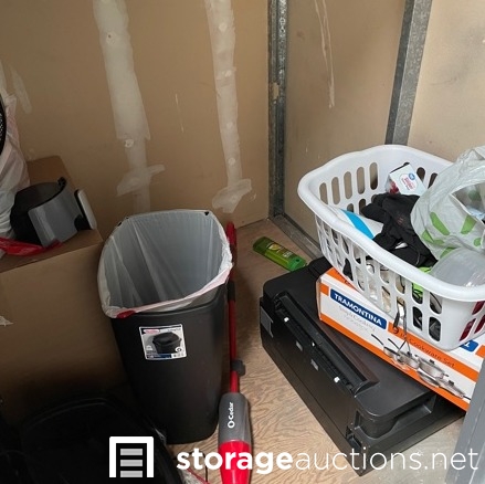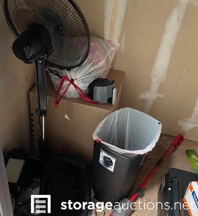 This unit appears to contain clothing, fan, trash can, hamper, blender, printer and miscellaneous items.