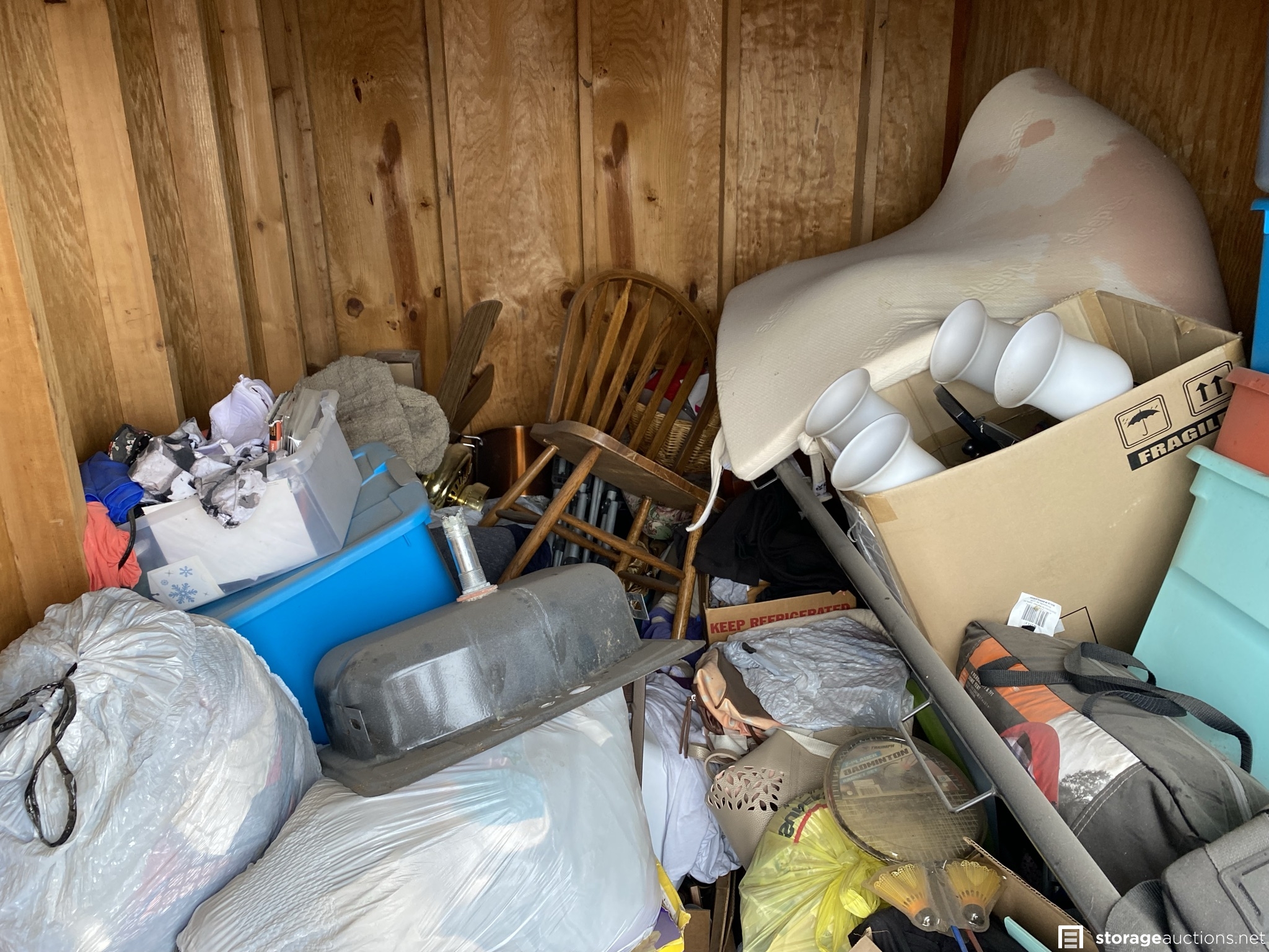 Tent, chairs, sink, computer hard drives, badminton set, rim, light fixtures, ceiling fan, plastic totes and household goods.