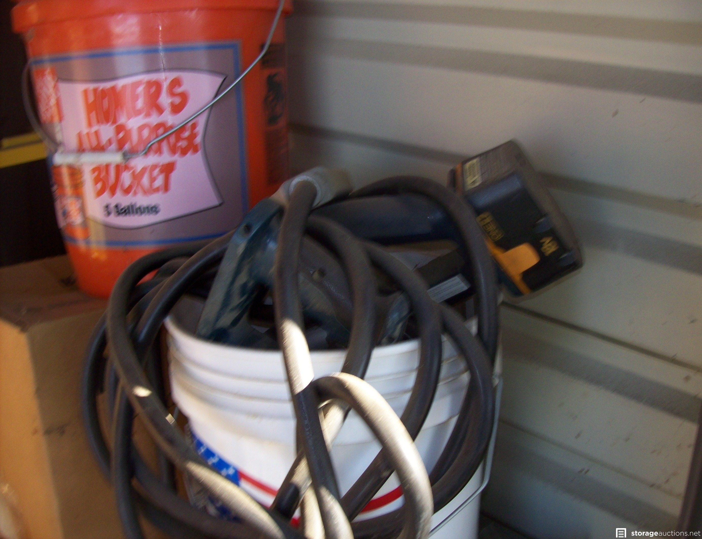 Boxes, totes, saw, sleeping bag, sewing machine, ice chest, extension cord