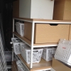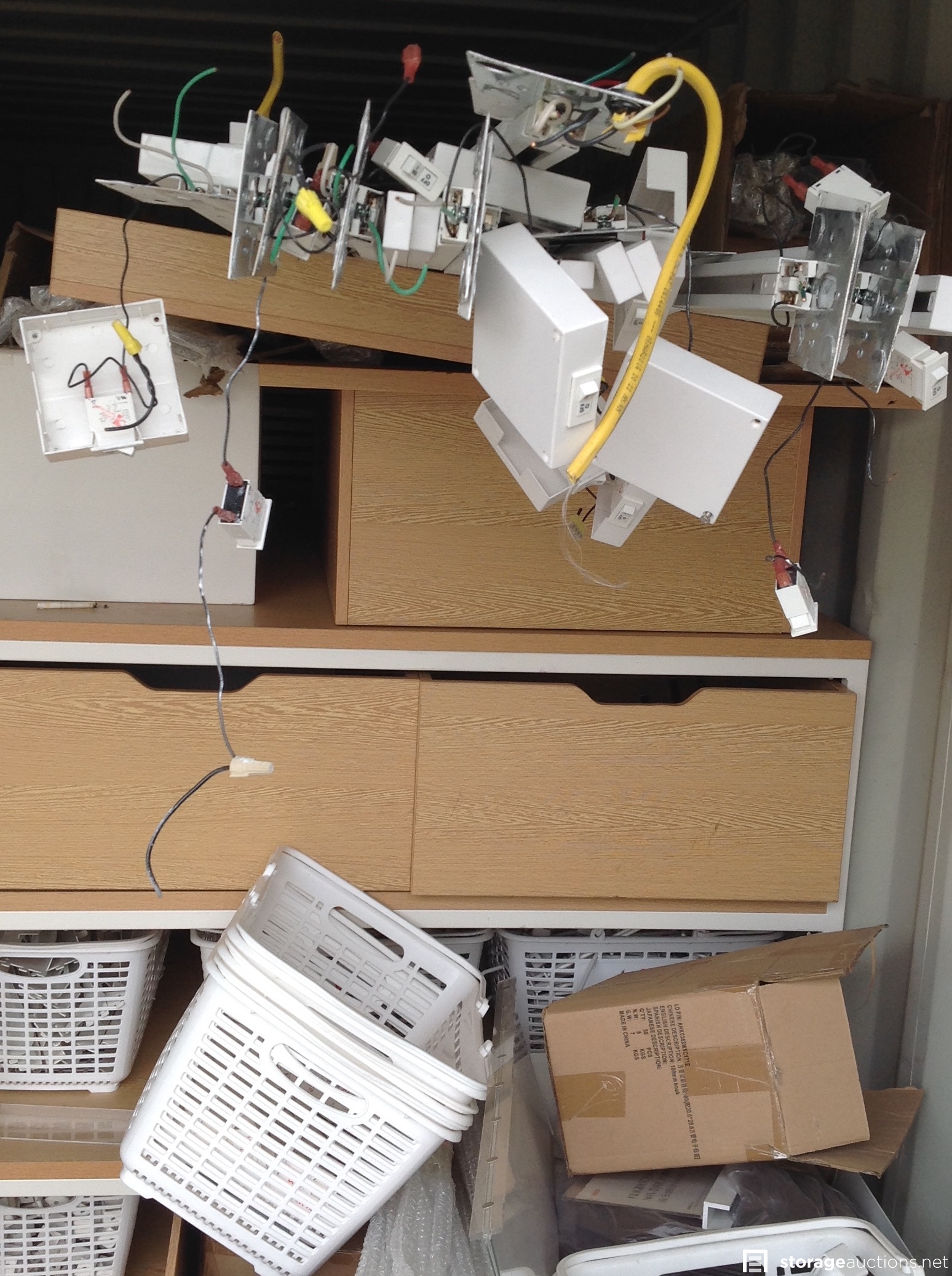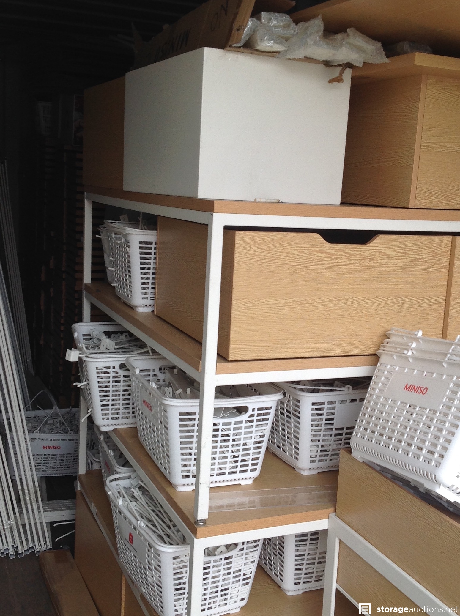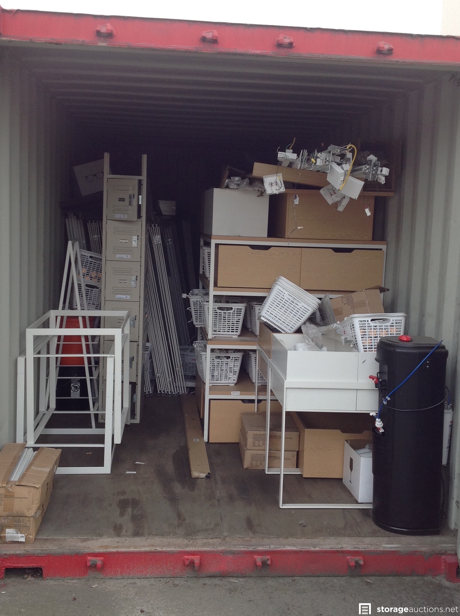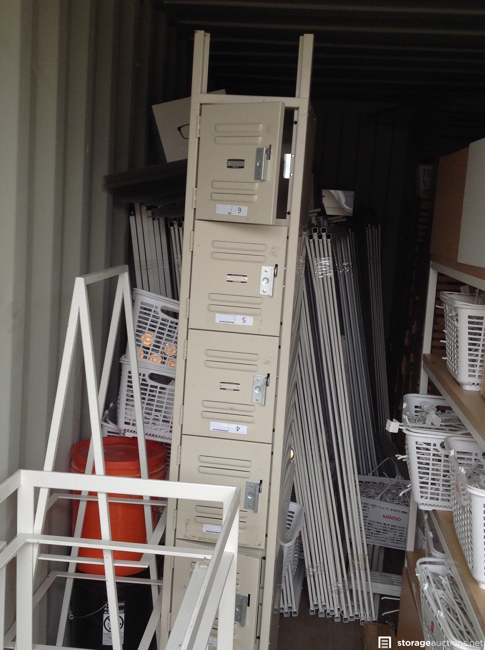 8'x20' Storage container appears to contain retail store fixtures, racks, hooks (pegs), shelving. LED track lighting with fixtures. Employee Lockers and water dispenser.