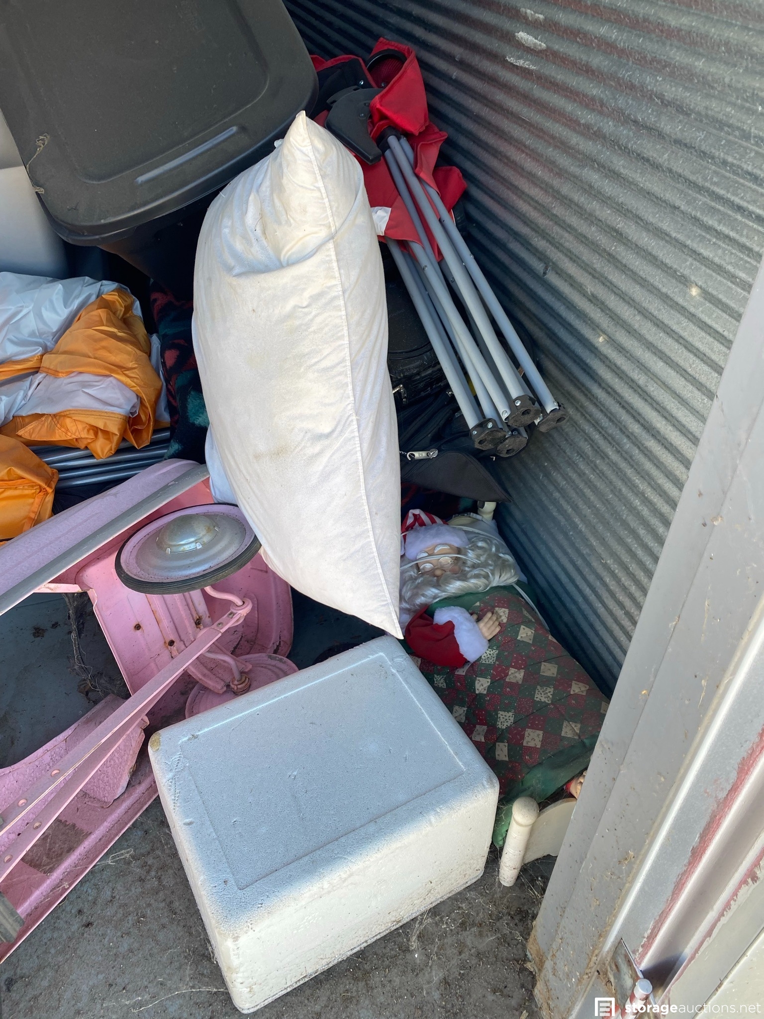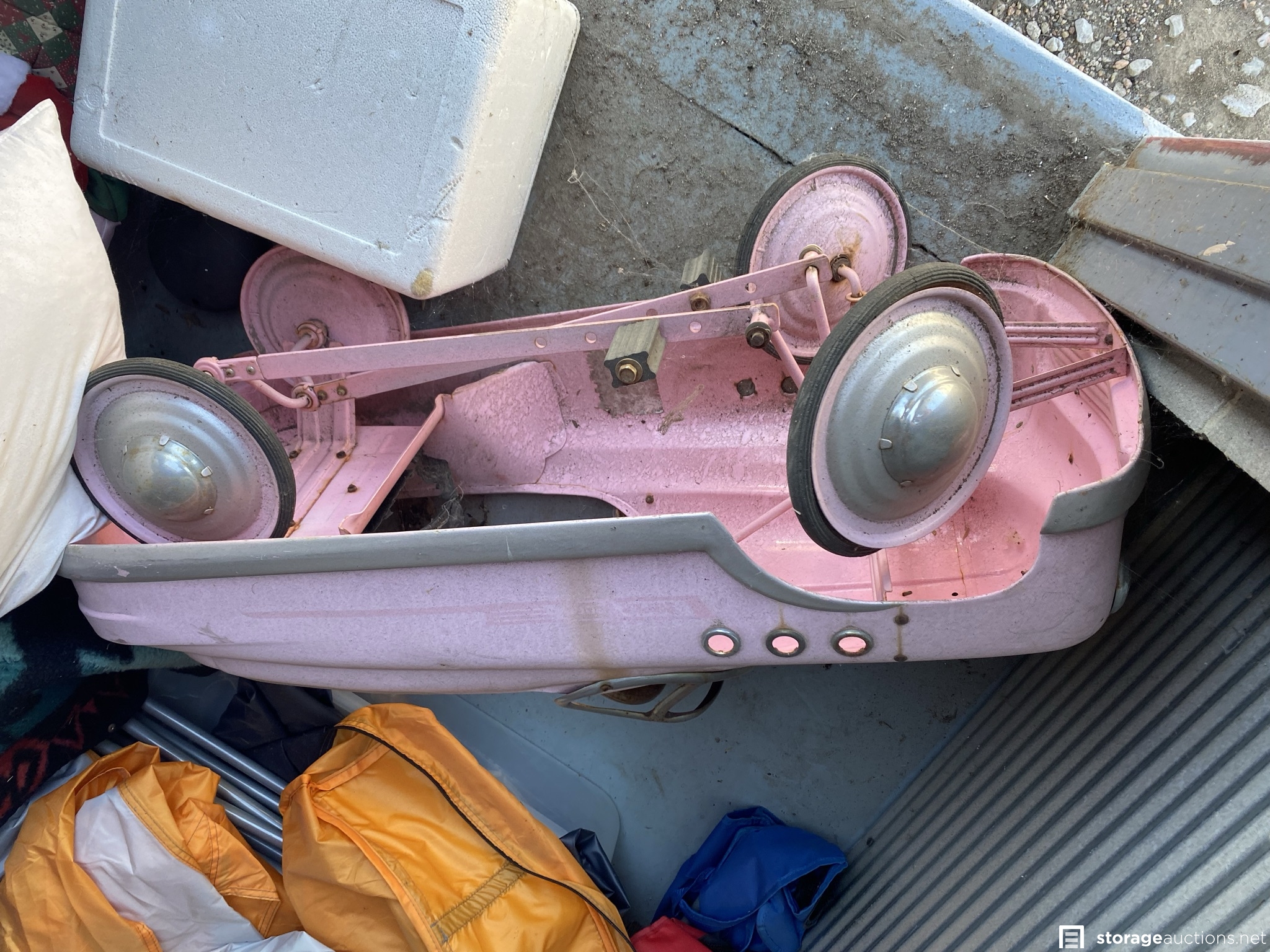 Kids pedal car, toys, looks like a tent, plastic totes and various household goods.
