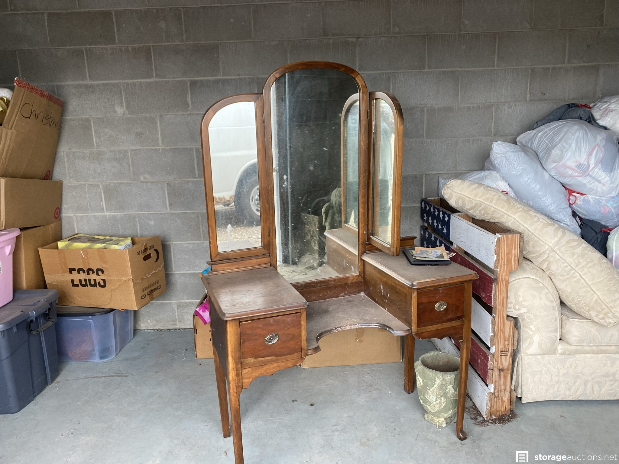 Golf bag and golf clubs, credenza, sofa, wood table with mirrors, plastic totes, lawn ornaments and various household goods.