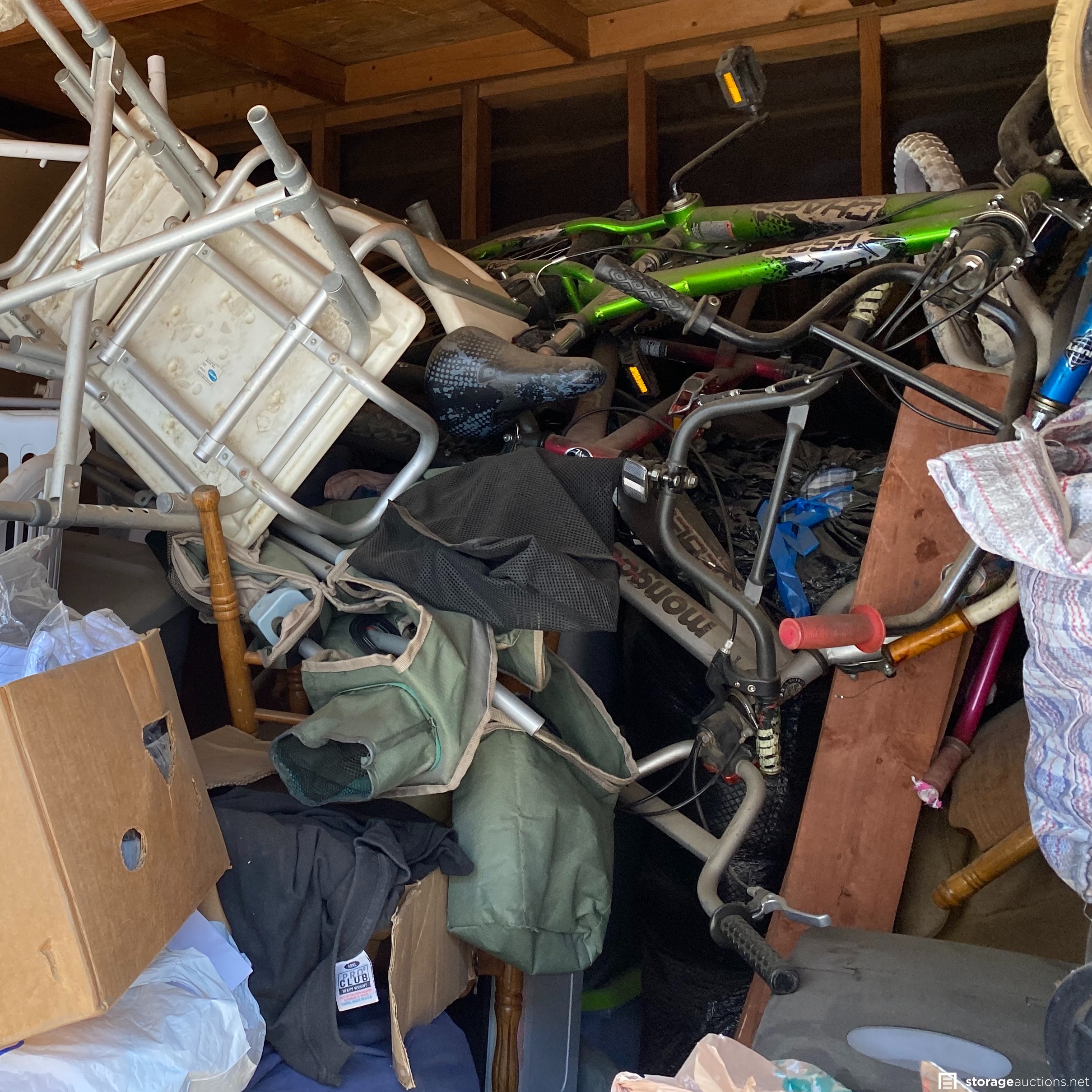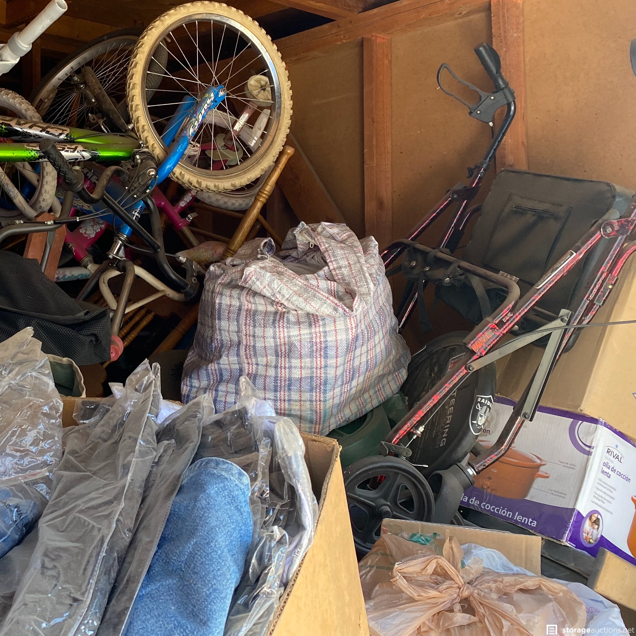 Boxes, bikes, table, chairs, walker, bags, dishes clothes, ladder, and miscellaneous.