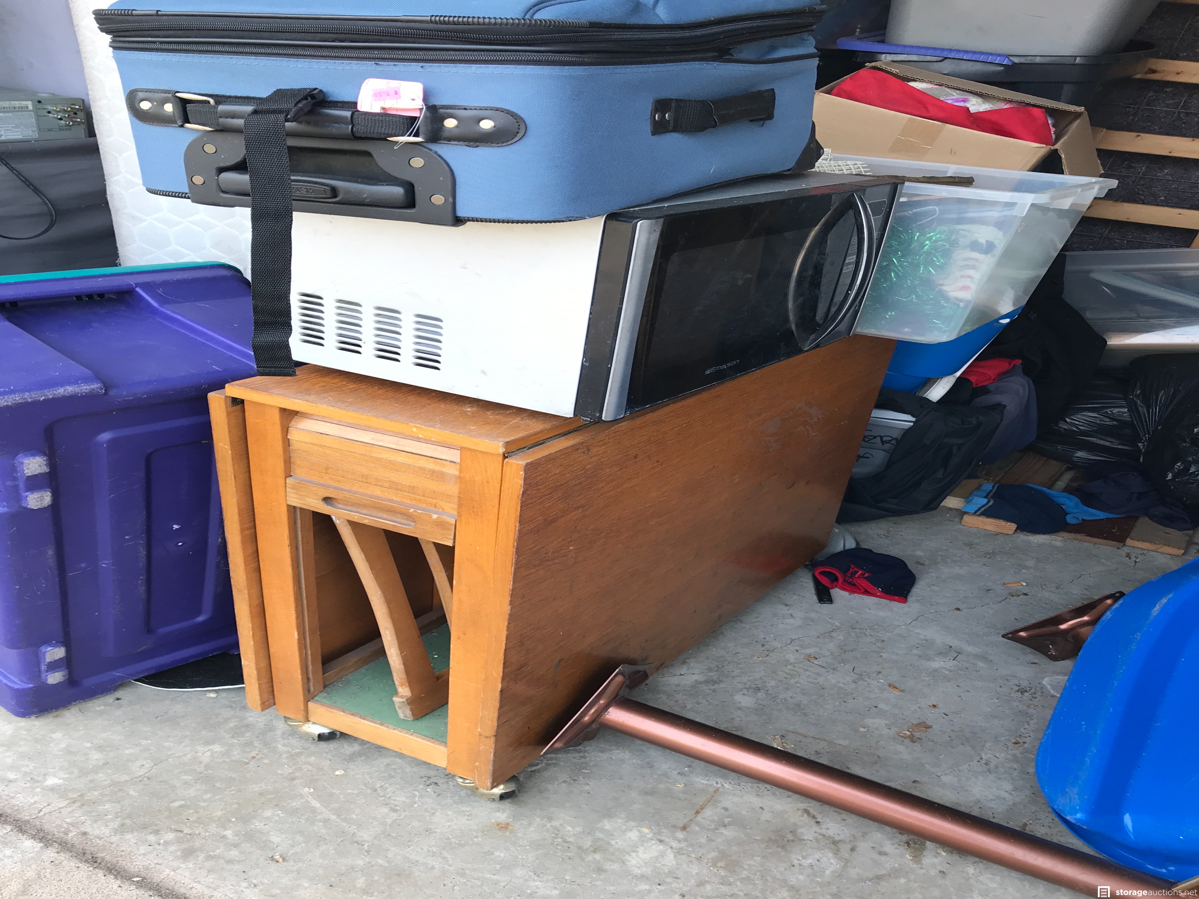 This unit appears to contain a wood table with folding capability, snowboard, wood toy chest, kitchen gadgets, microwave, tubs of miscellaneous, cooler, toys, side table with drawers