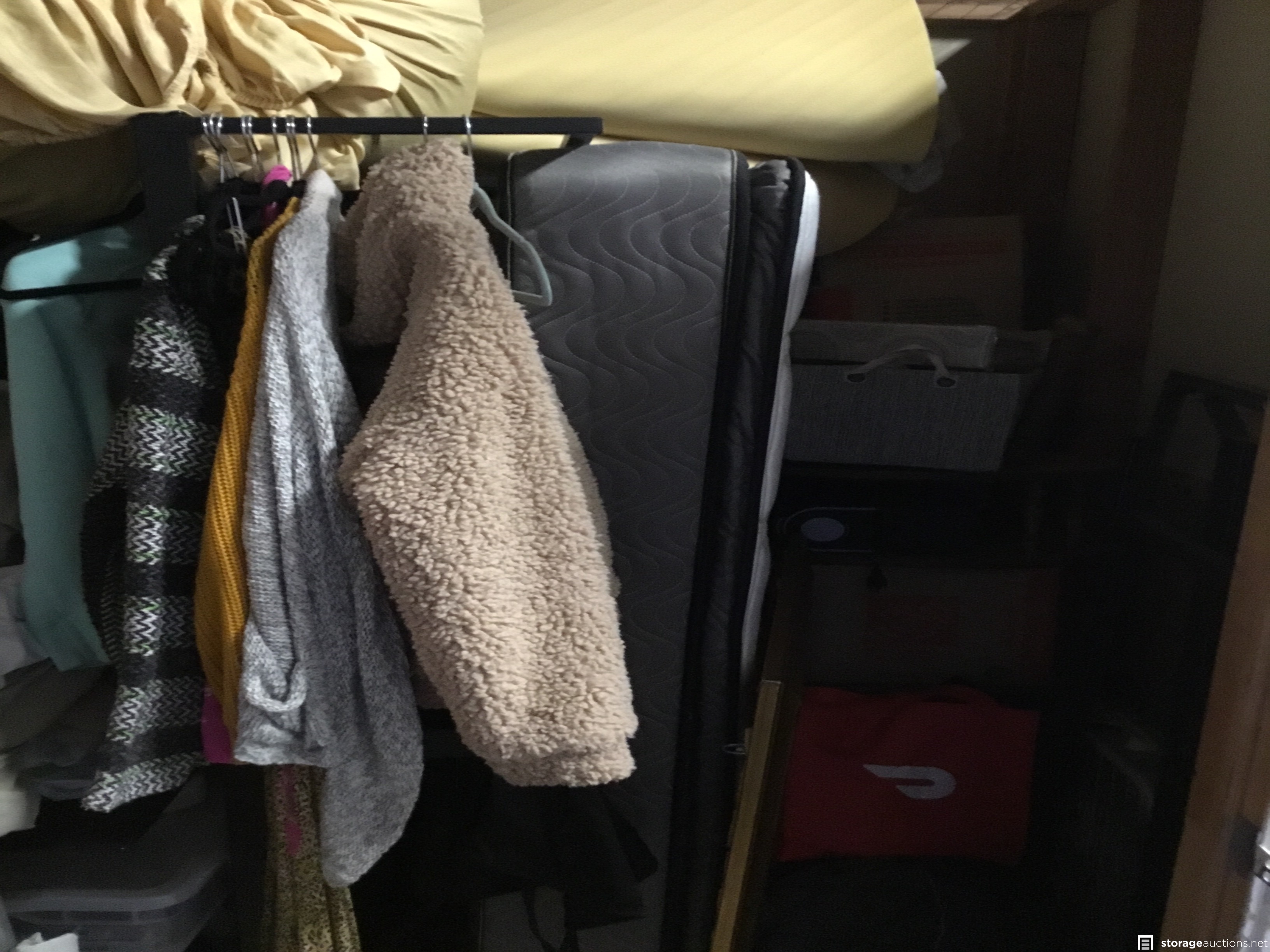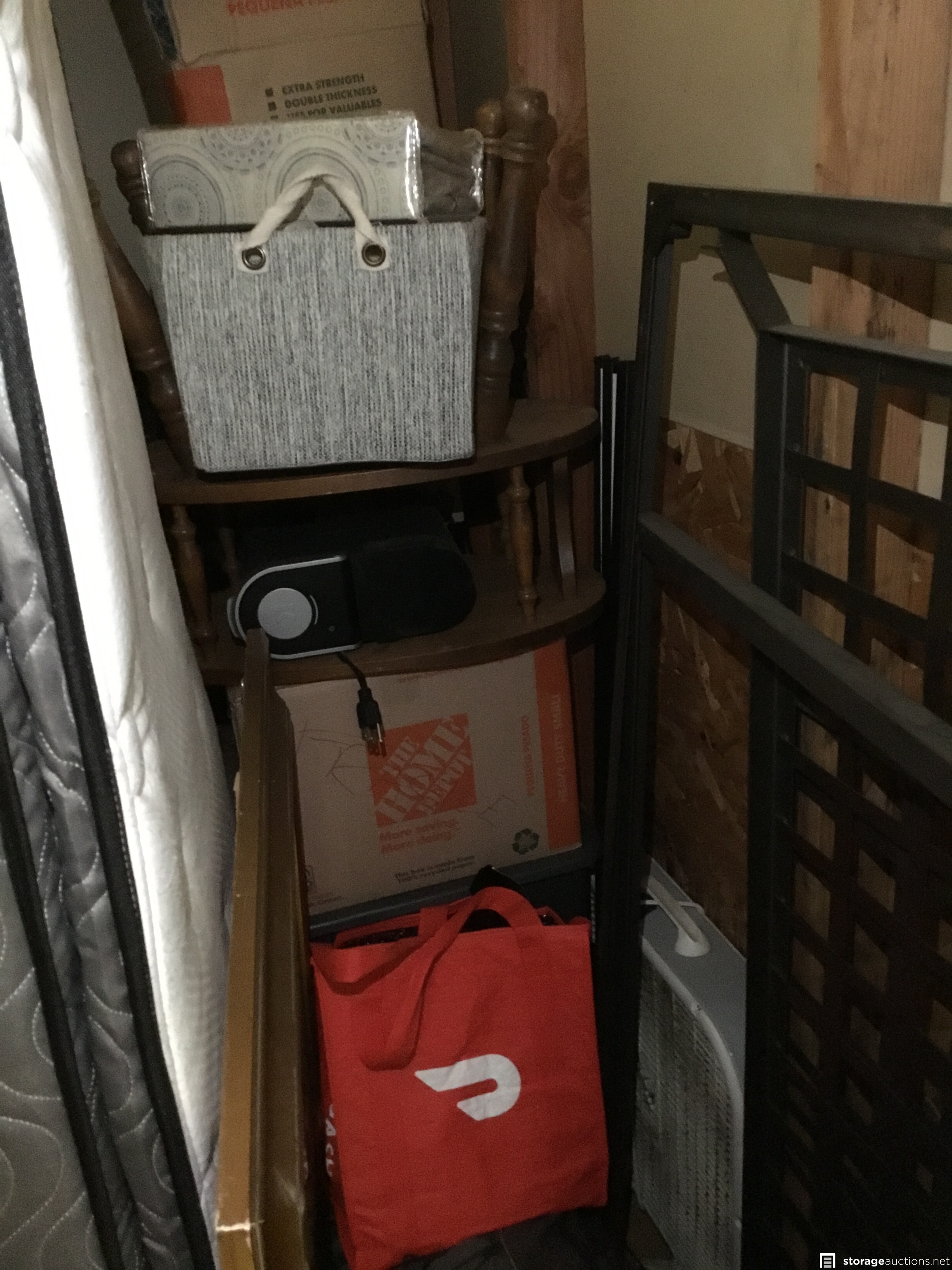 Mattress, boxes, clothing, fan, plastic tubs, suitcases