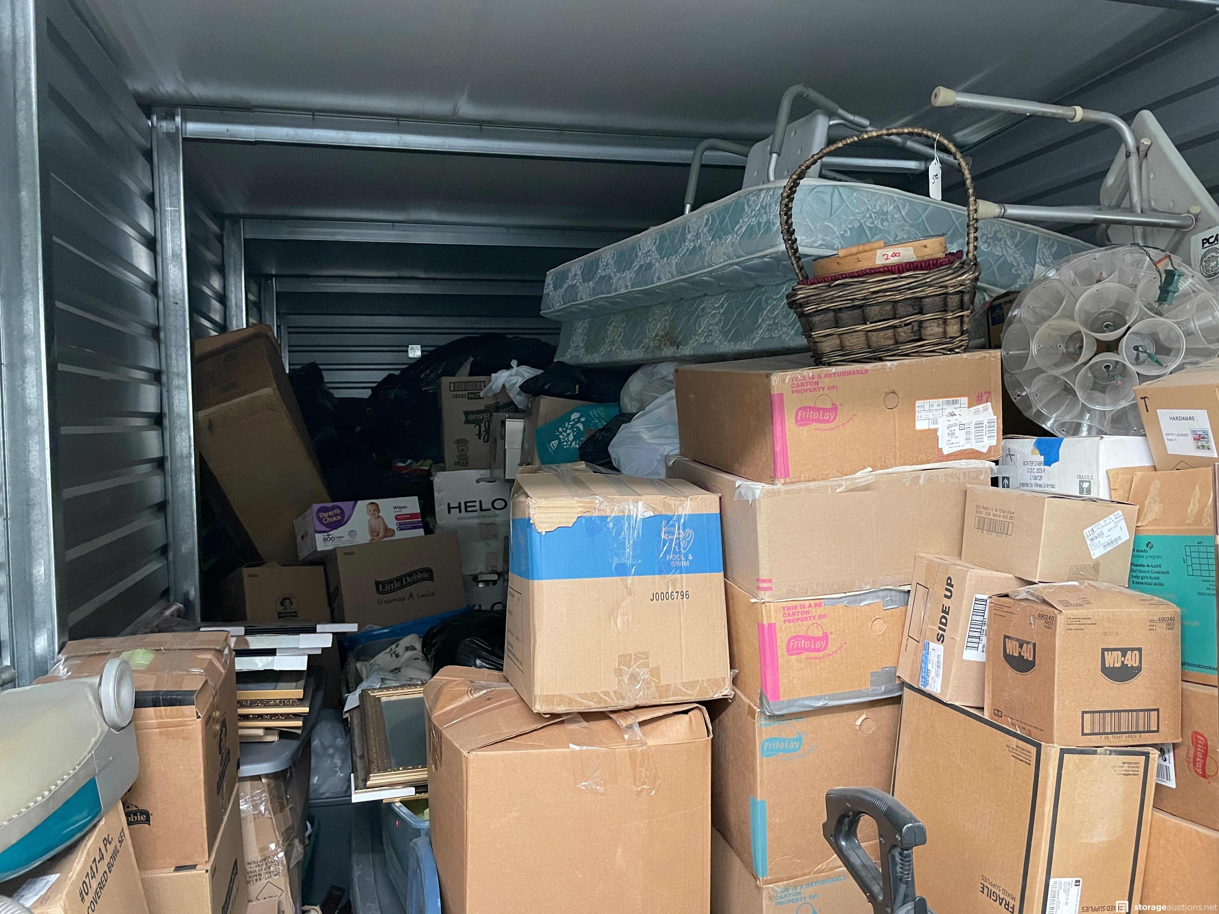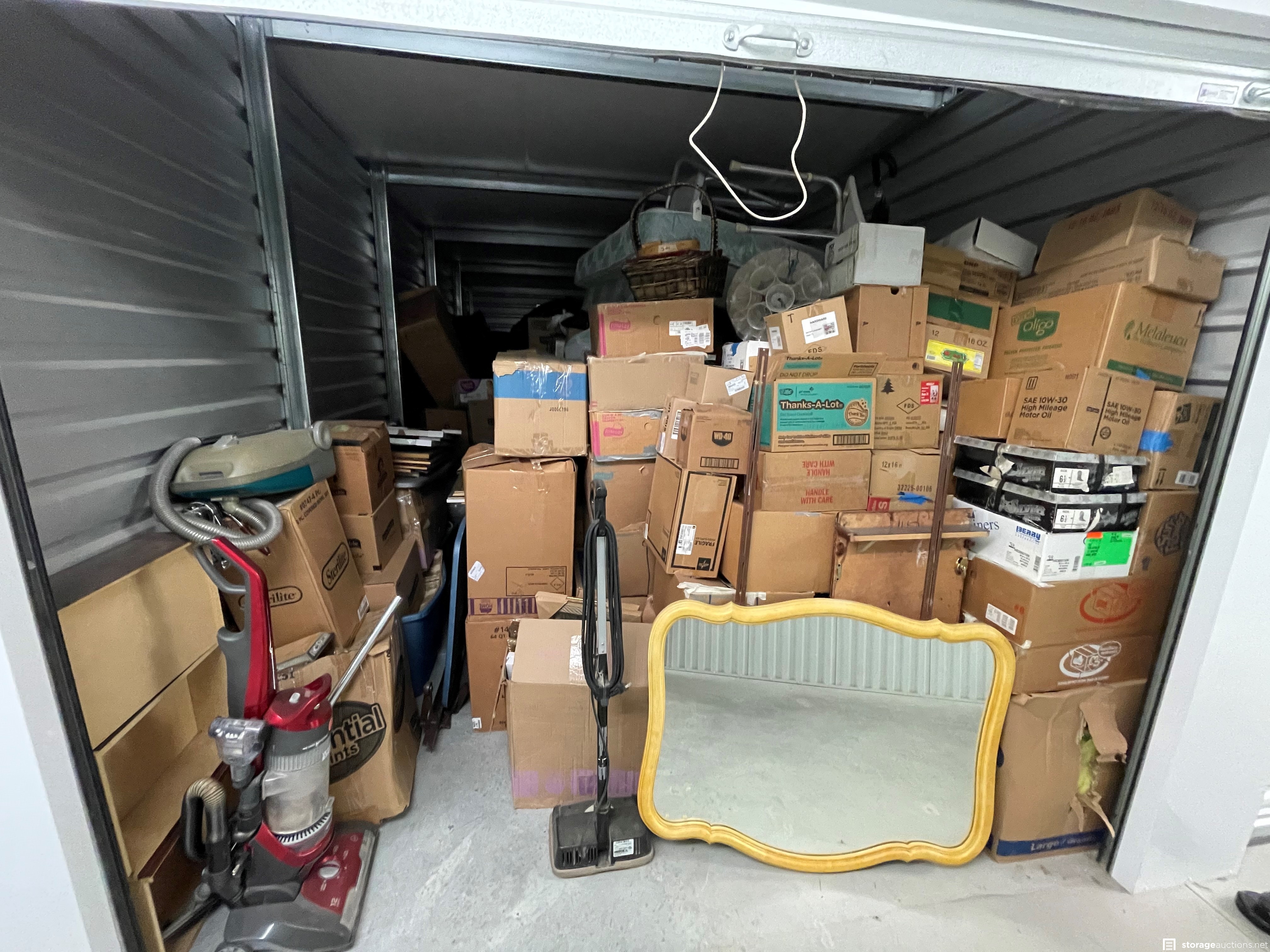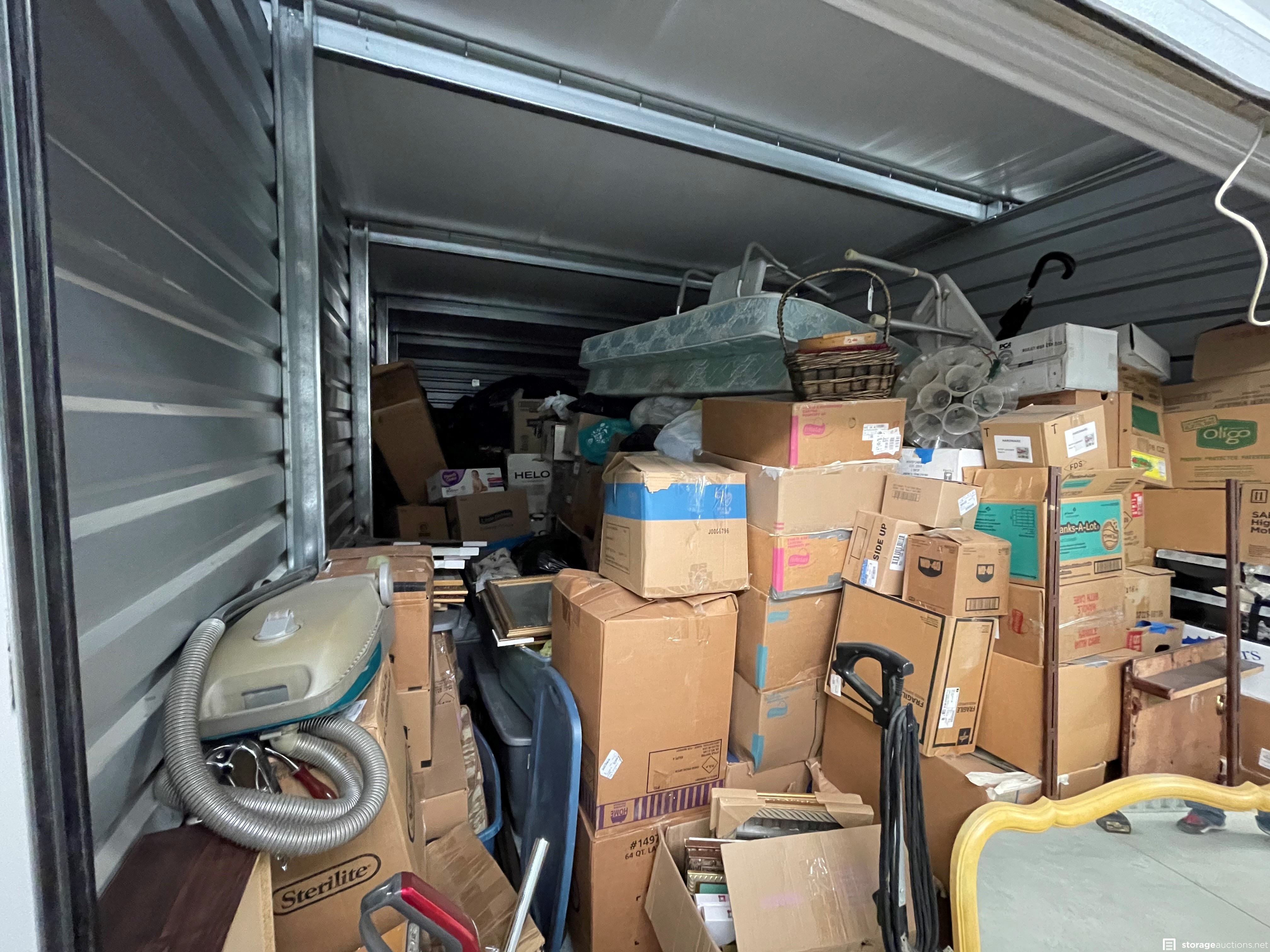 Unit appears to have plastic containers, clothing, misc. items, mattresses, box springs, dressers, vacuum, mirrors, pictures, house decor, misc. medical equipment.