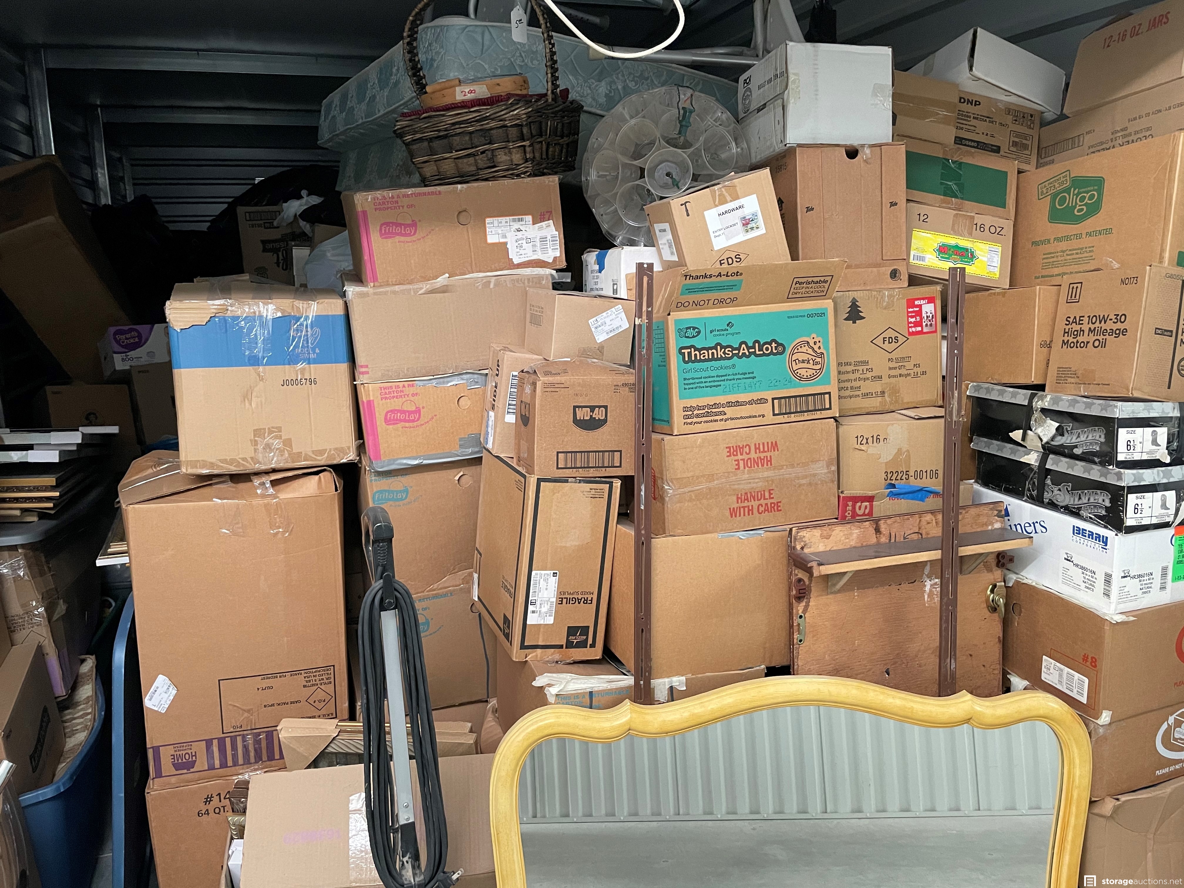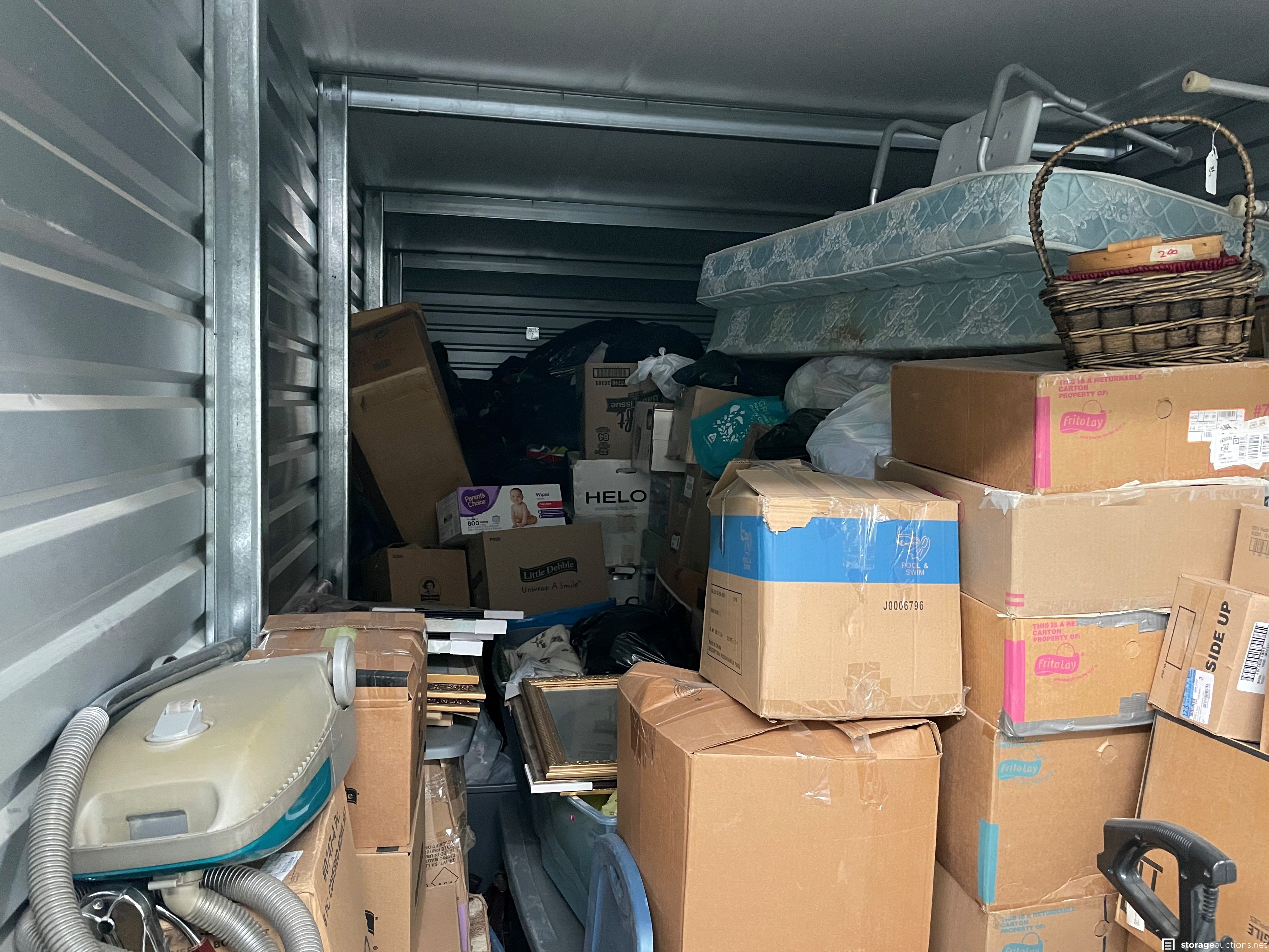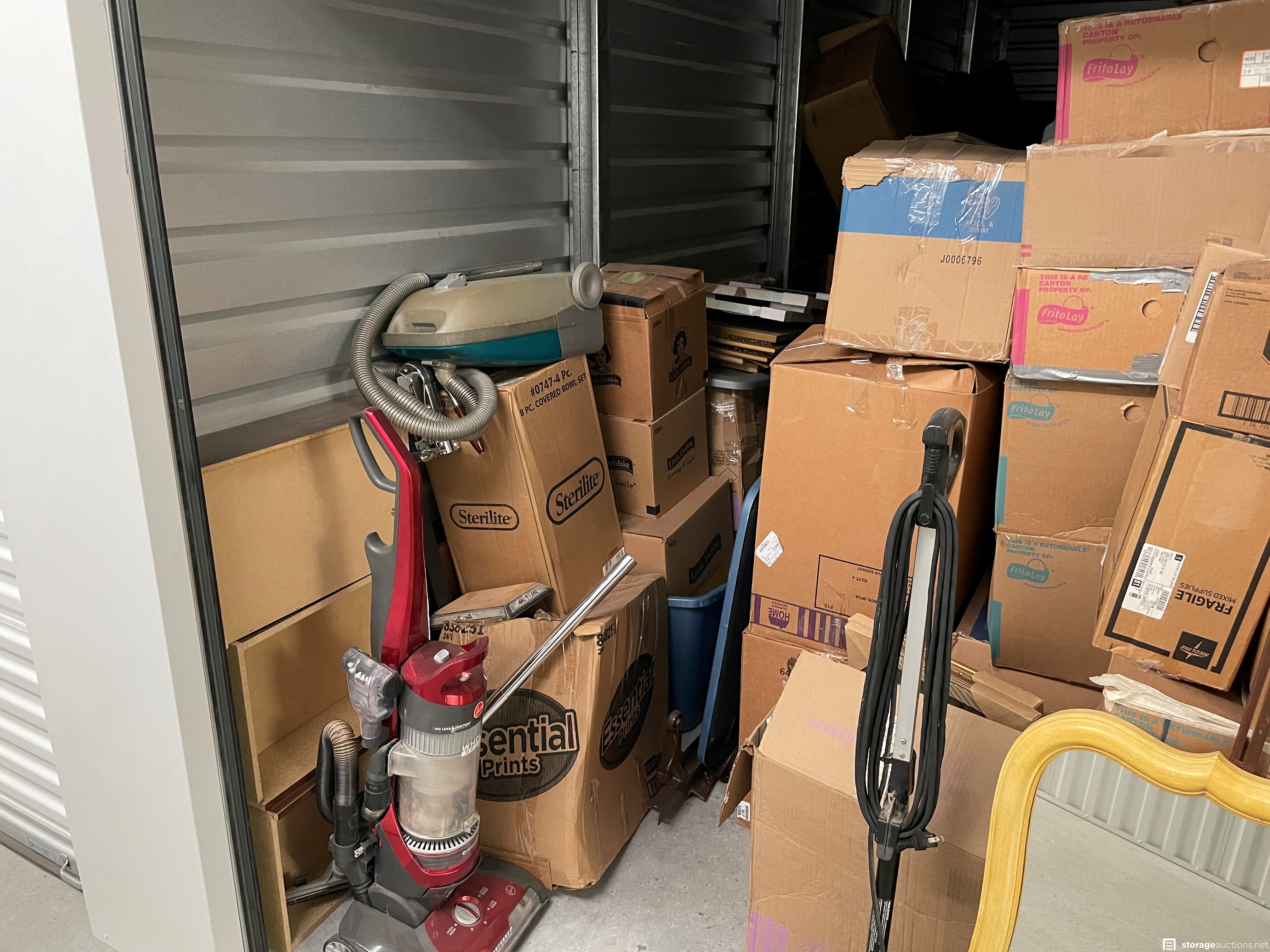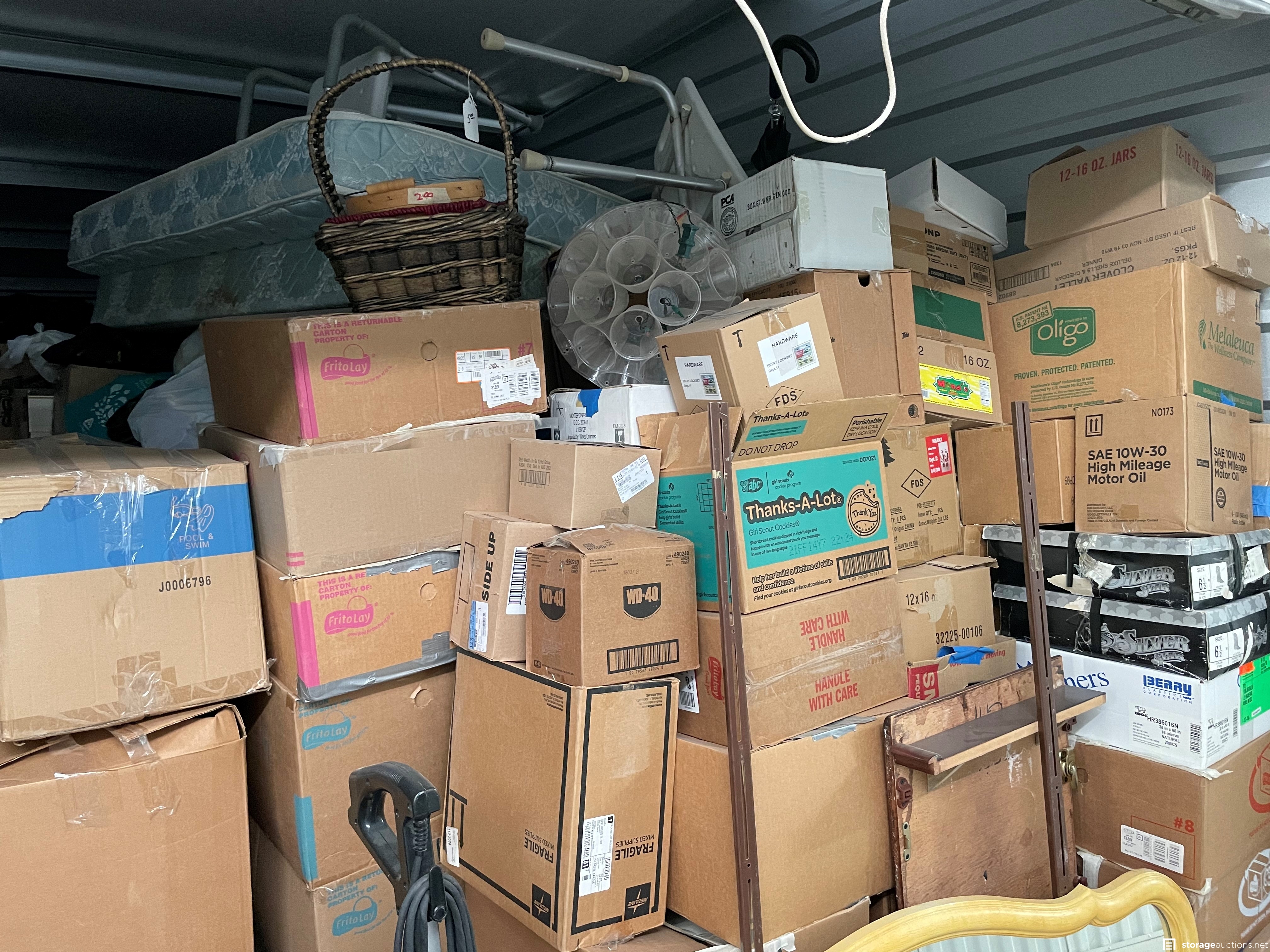 Unit appears to have plastic containers, clothing, misc. items, mattresses, box springs, dressers, vacuum, mirrors, pictures, house decor, misc. medical equipment.