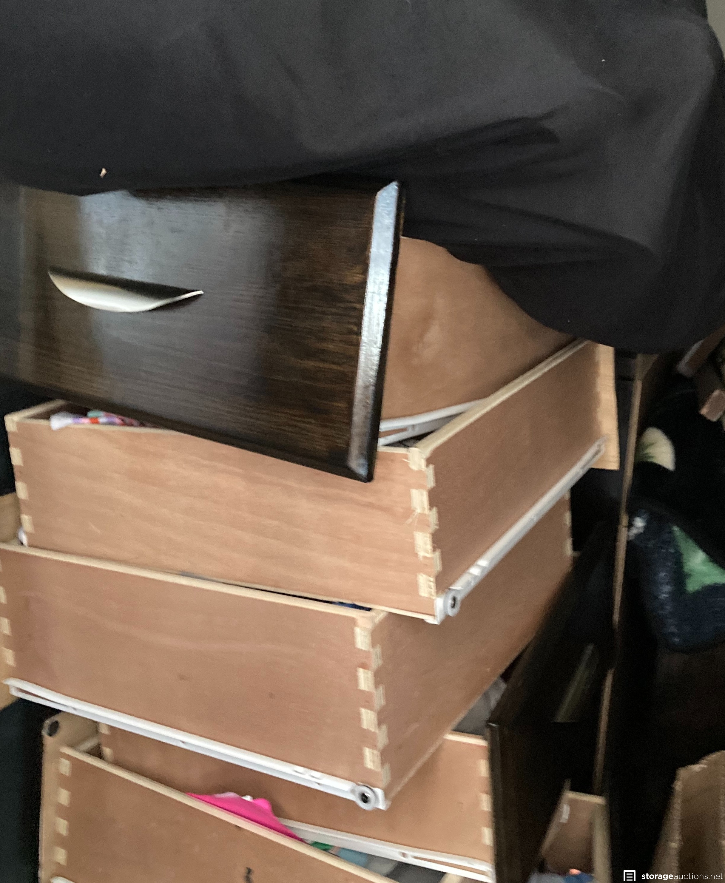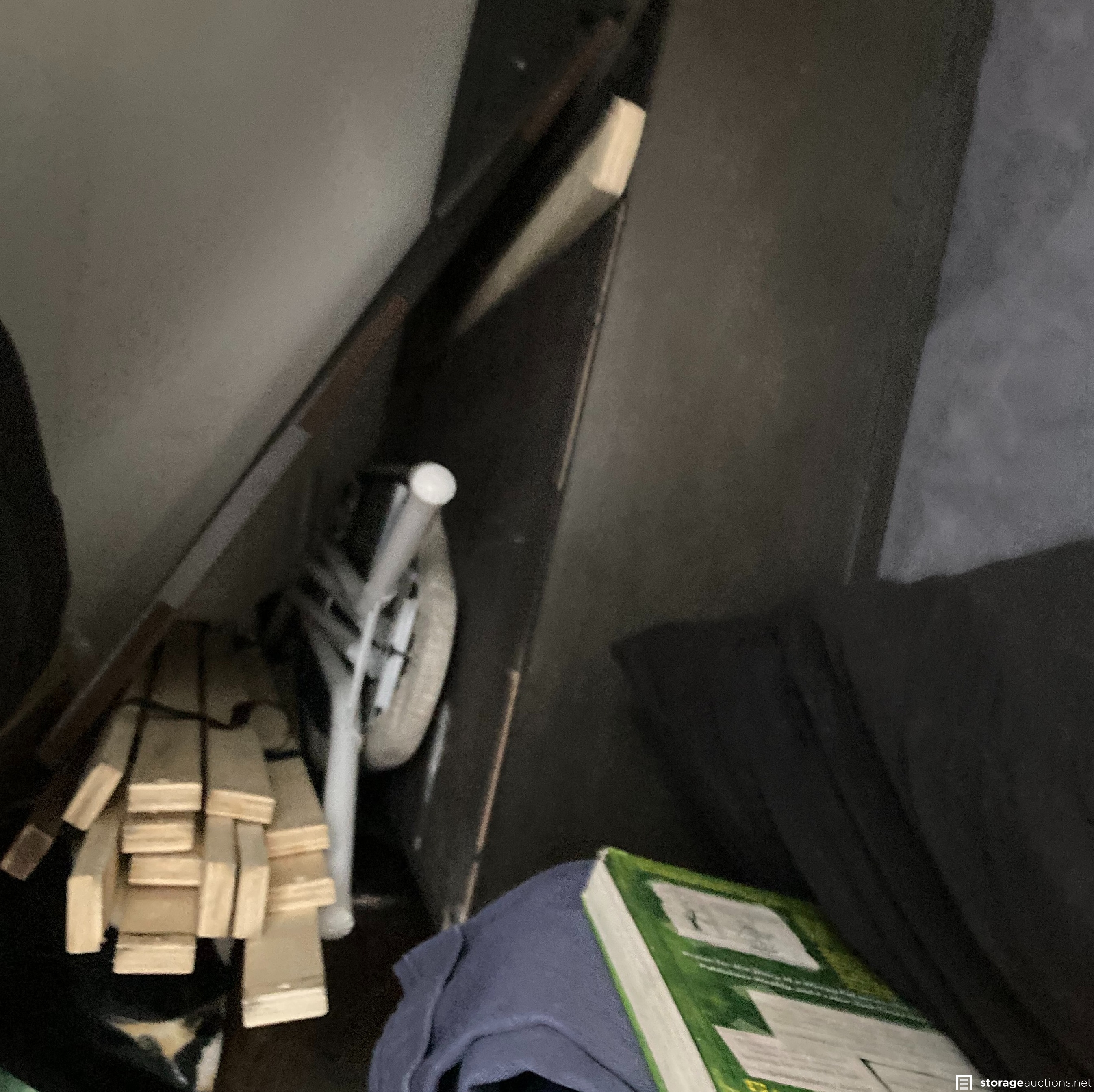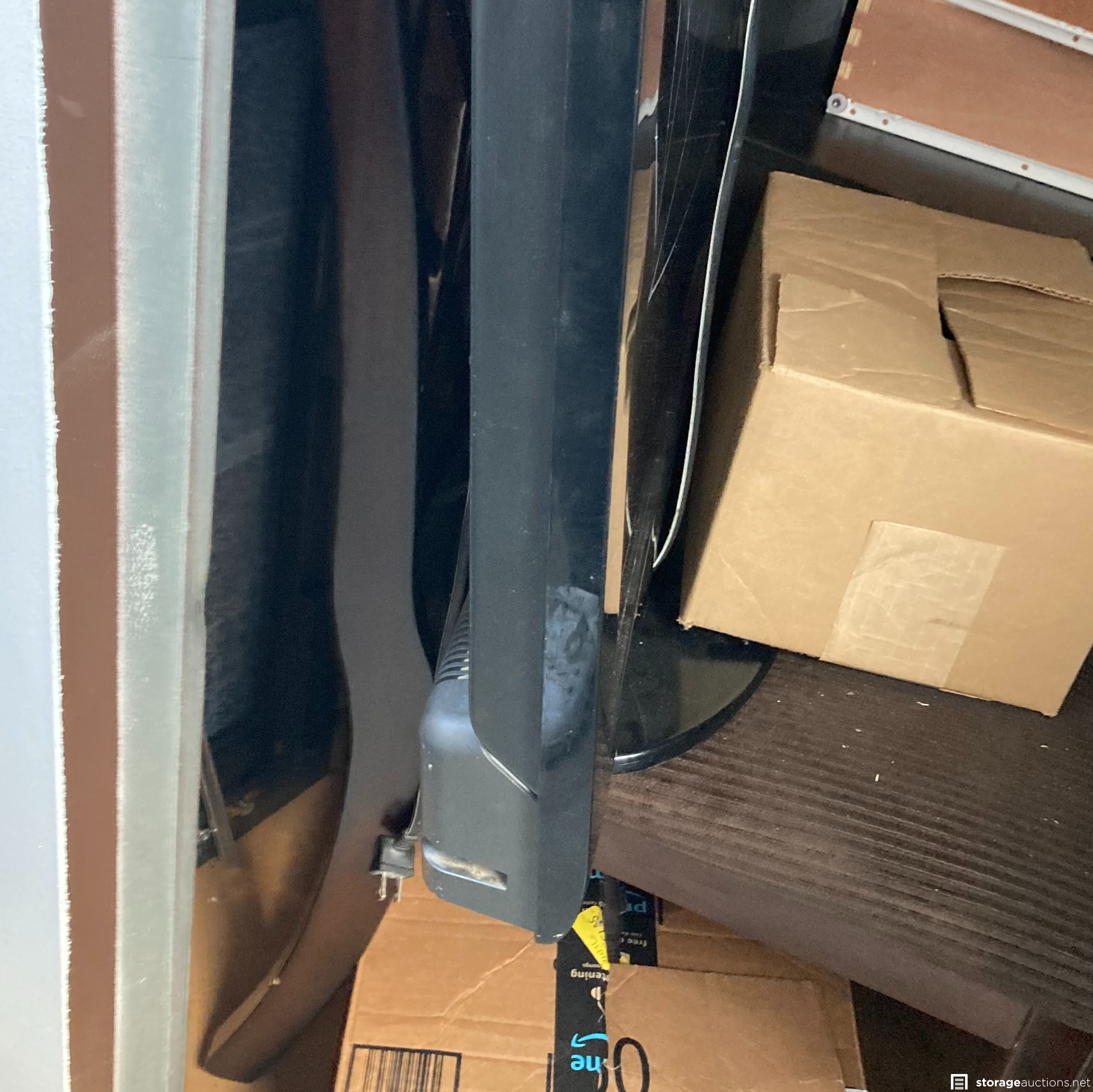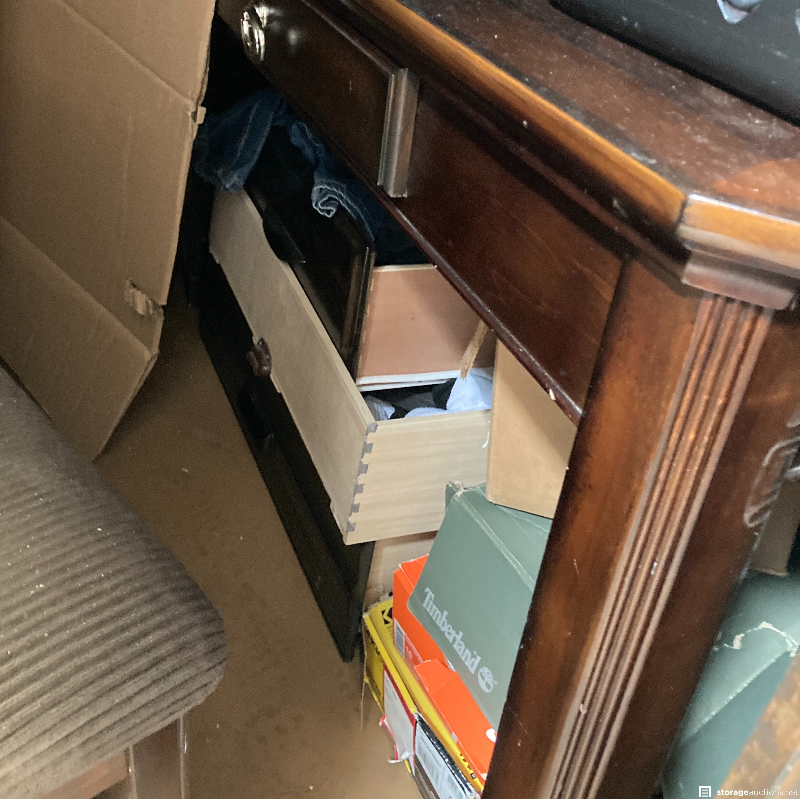 Computer desk and chair, small TV, drawers, dresser possibly, boxes, baskets appears as bed frame w/slates, ironing board