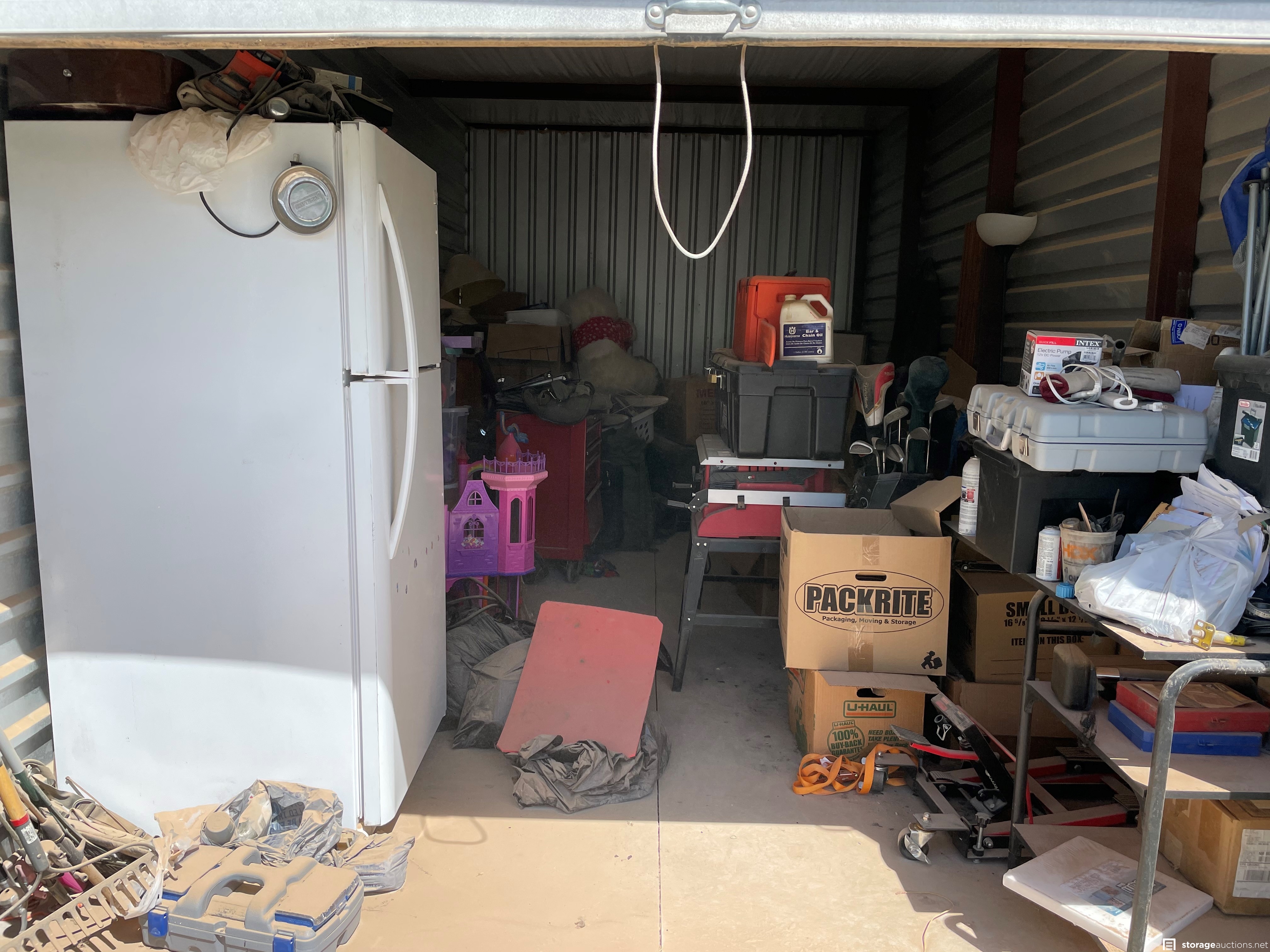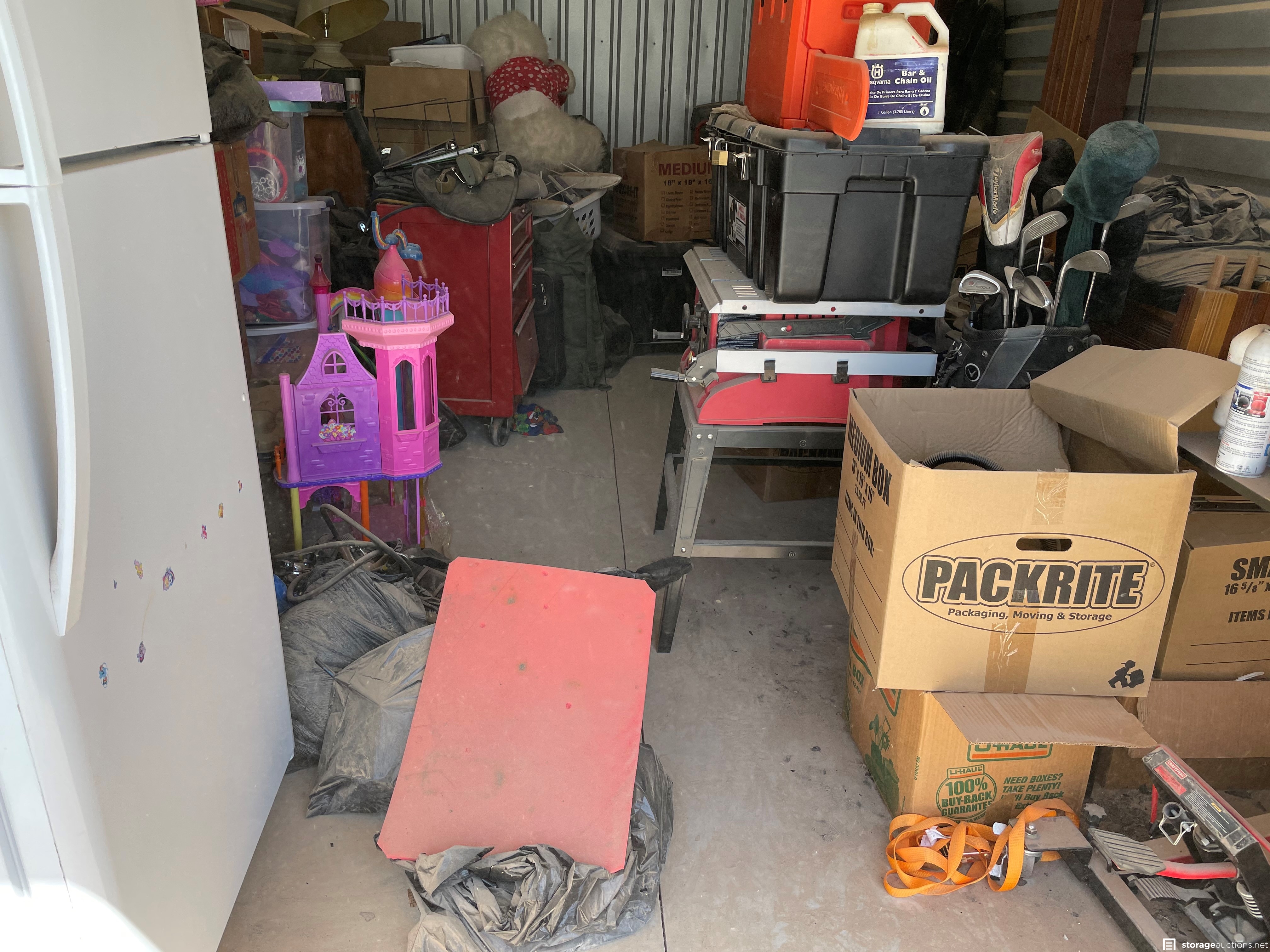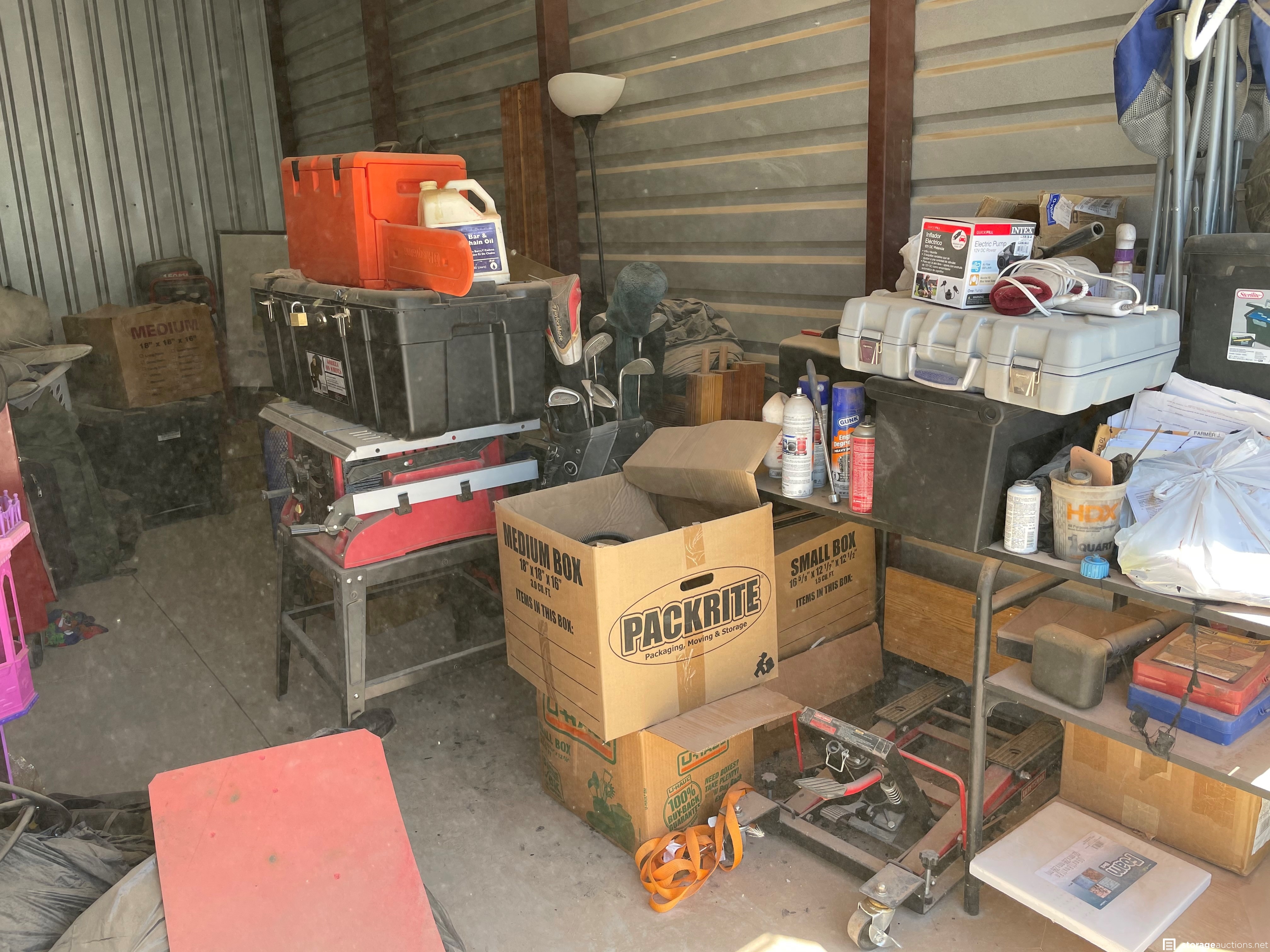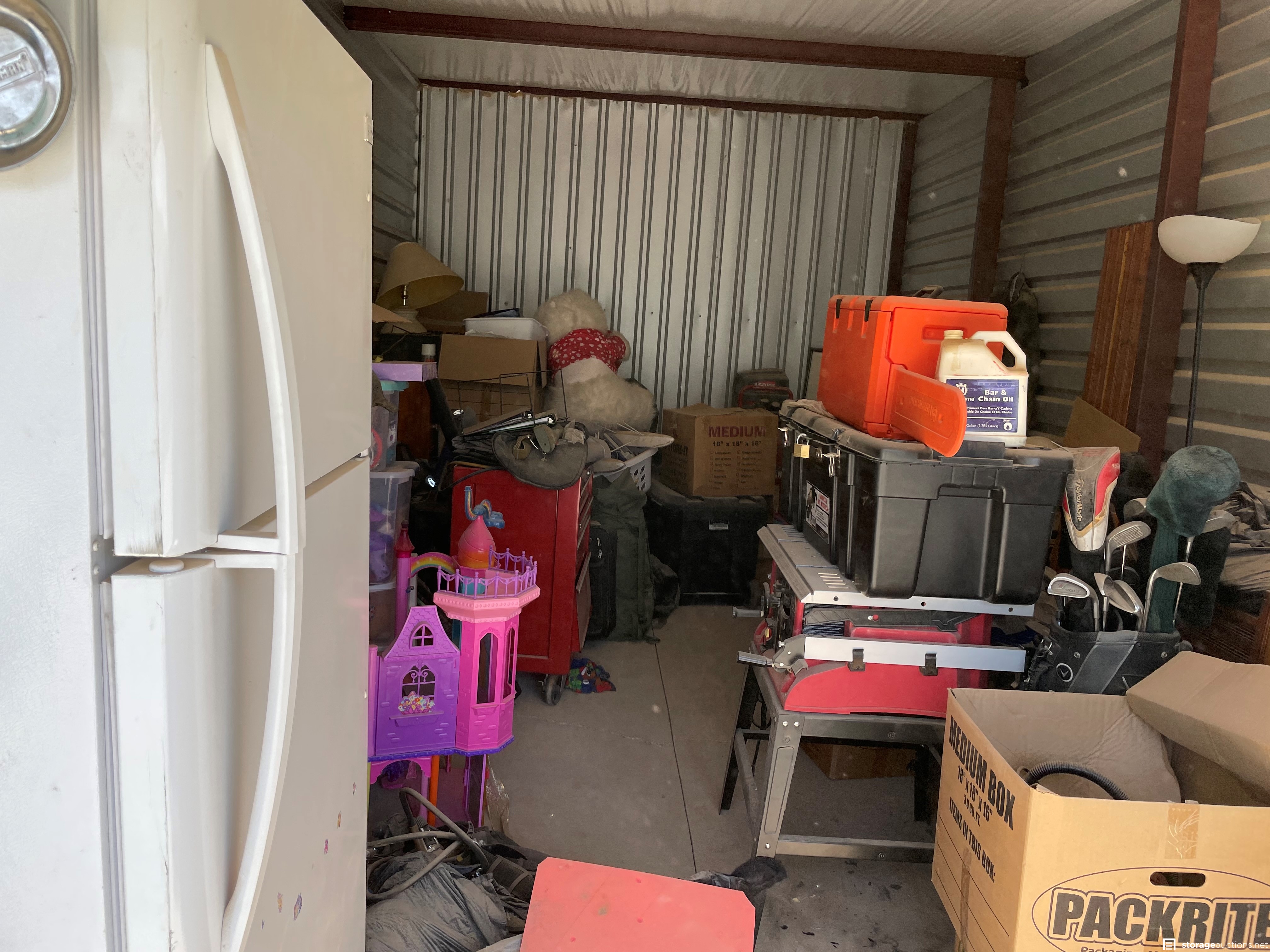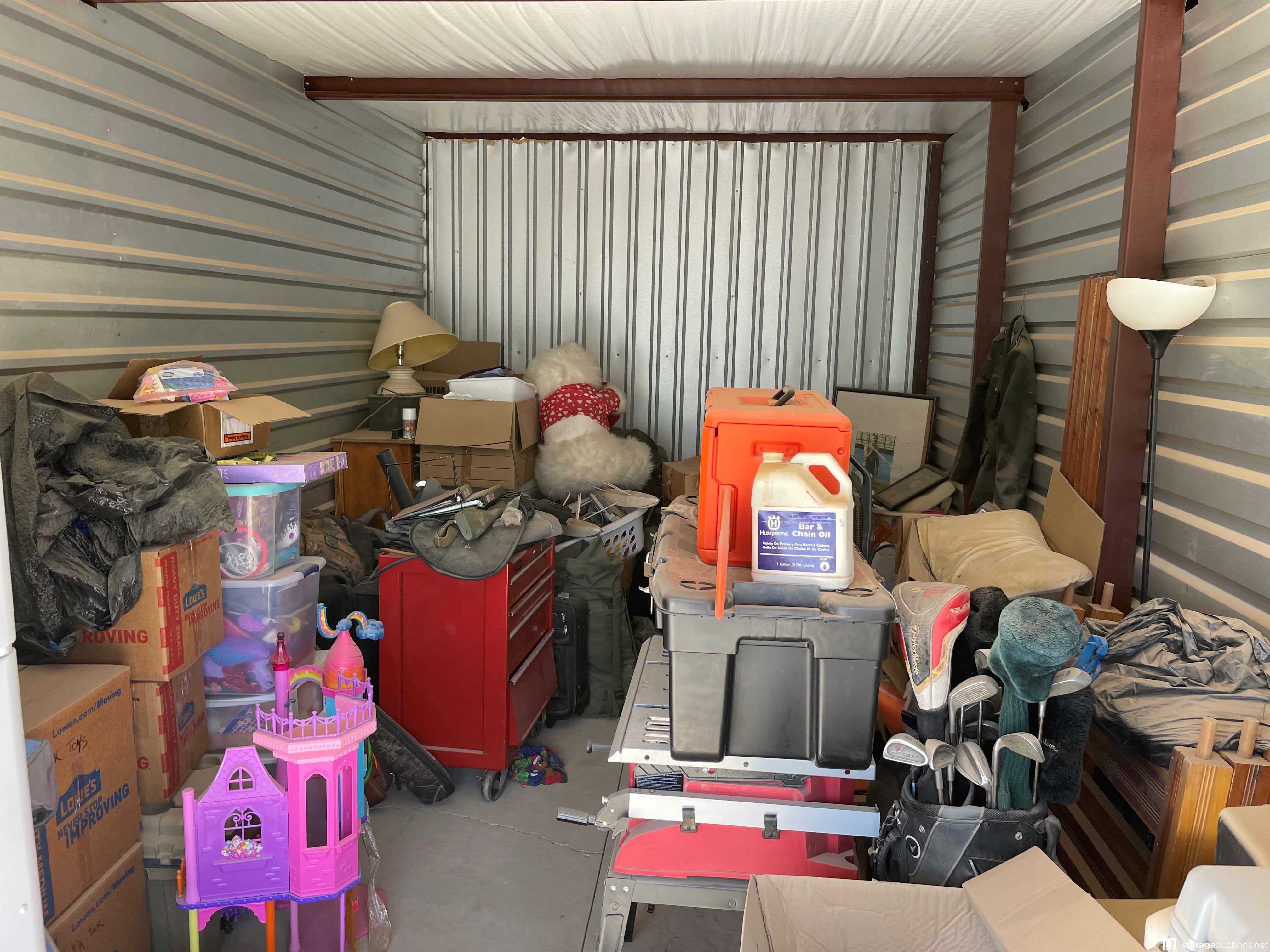 Unit appears to contain tools, power tools, misc box's, clothing. misc. items, refrigerator, office desk, lamps, and lawn equipment