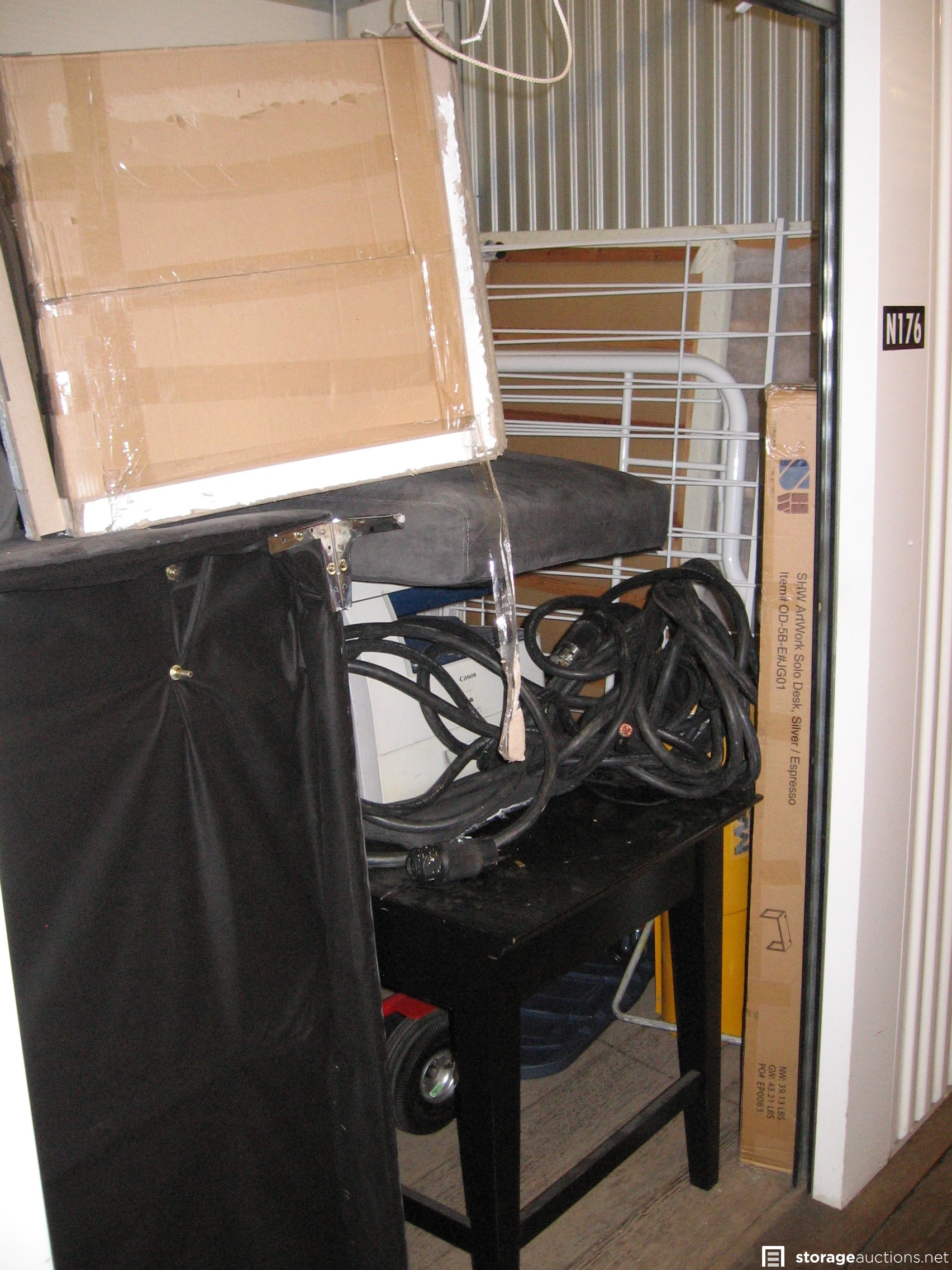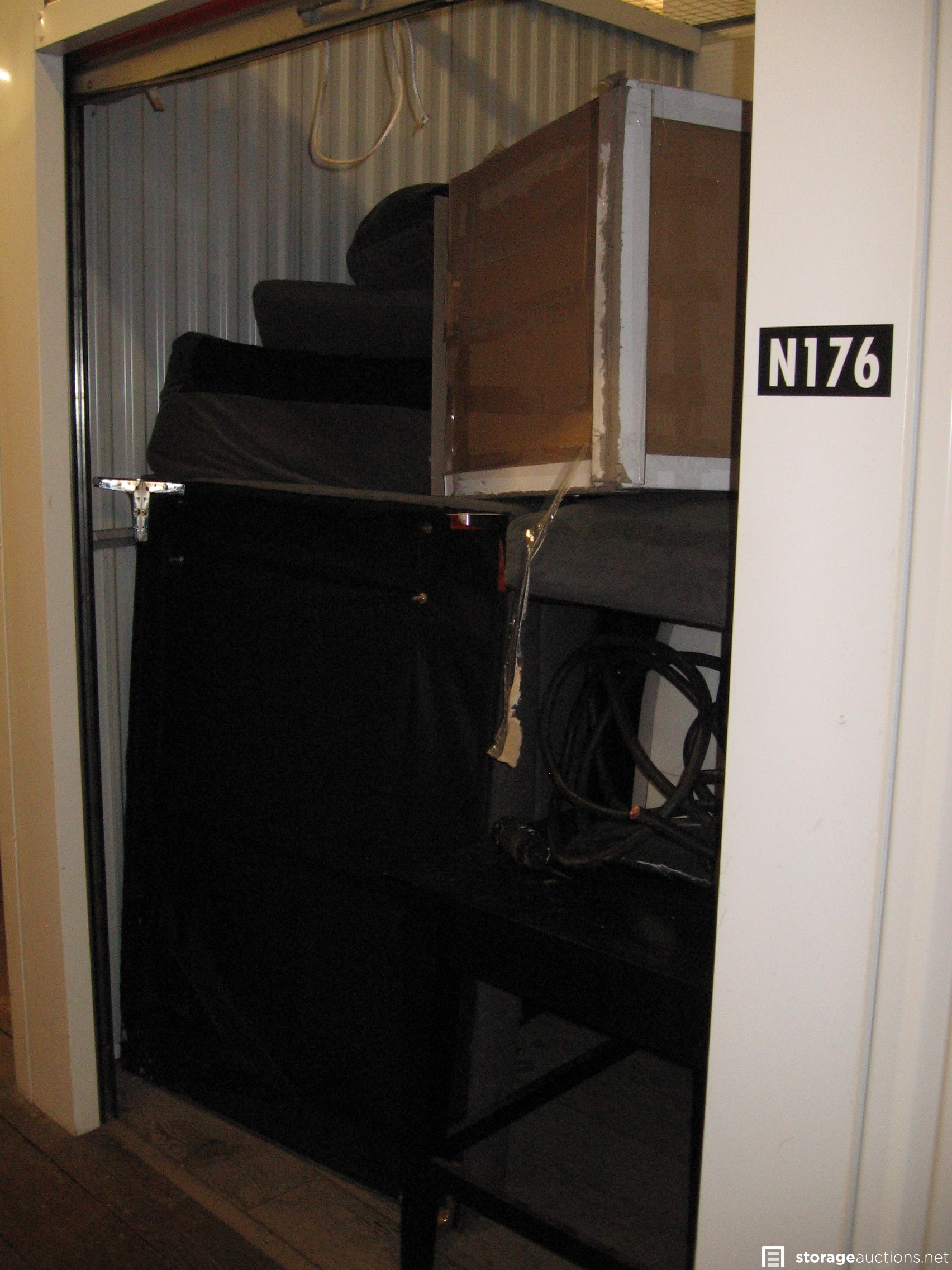 This auction is for unit N176. It measures 10 feet wide by 7.5 feet deep by 8 feet 8 inches high. It has a footprint of 75 square feet. This unit contains a man's belongings, including a sofa, bedframe, power tools, and misc items. See photos for more details. The last photo with the white gridlines is over the top of the unit to see what is in the back.