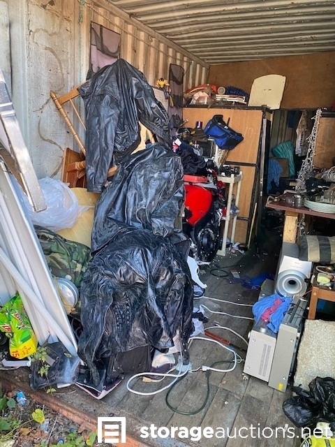 Unit #2 alum canoe, motorcycle and parts, tools, leather moto jackets, and furniture etc