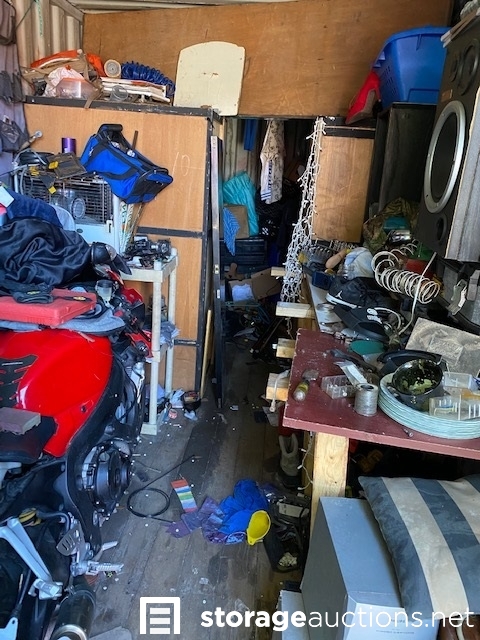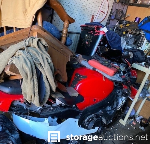 Unit #2 alum canoe, motorcycle and parts, tools, leather moto jackets, and furniture etc