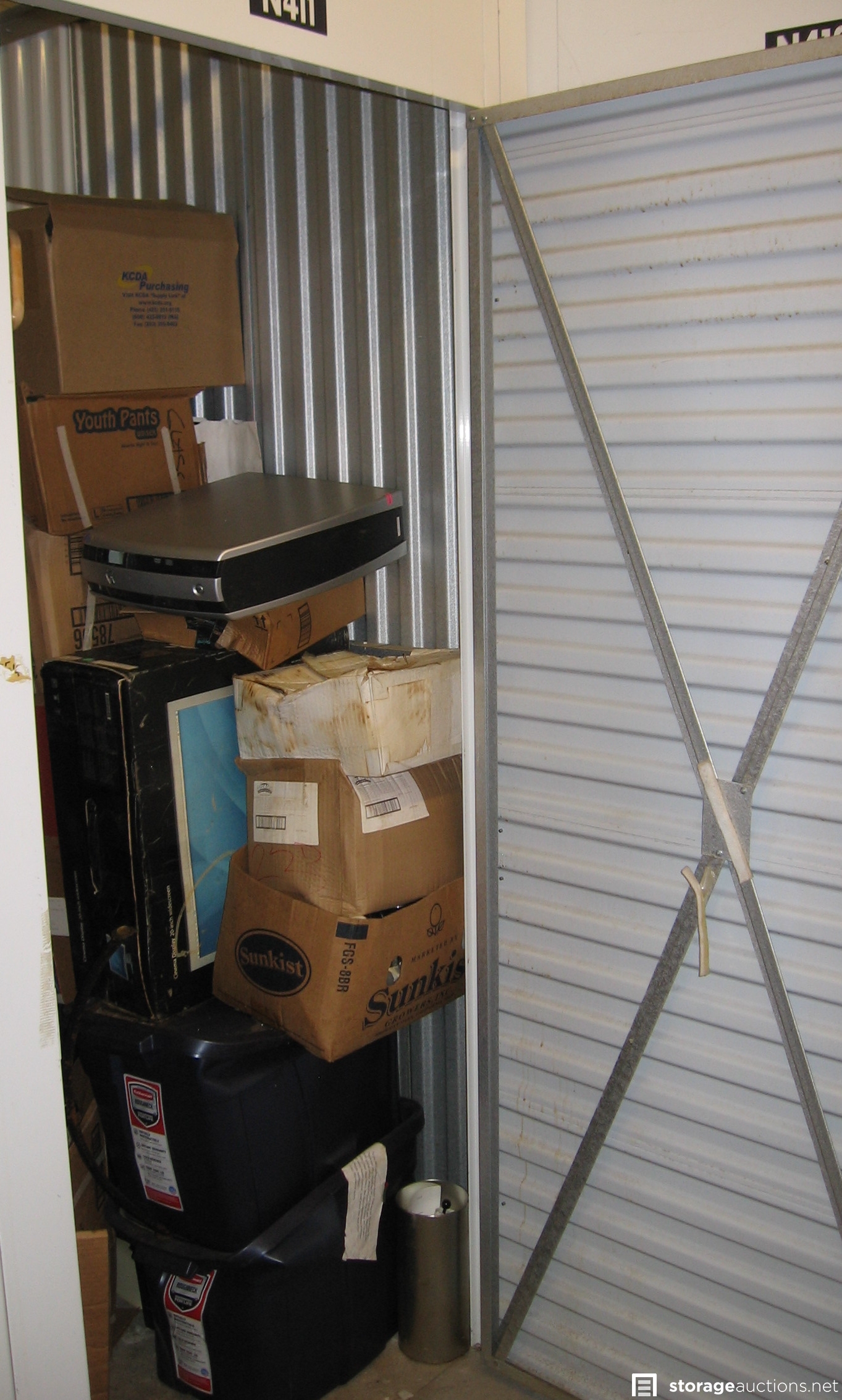 Unit N411 is a small full height unit. Actual measurements are 5.3 feet wide by 5.5 feet deep by 8 feet 8 inches high. The footprint is 29 square feet. Contents include a computer, boxes, bins, personal items, other bags, misc.