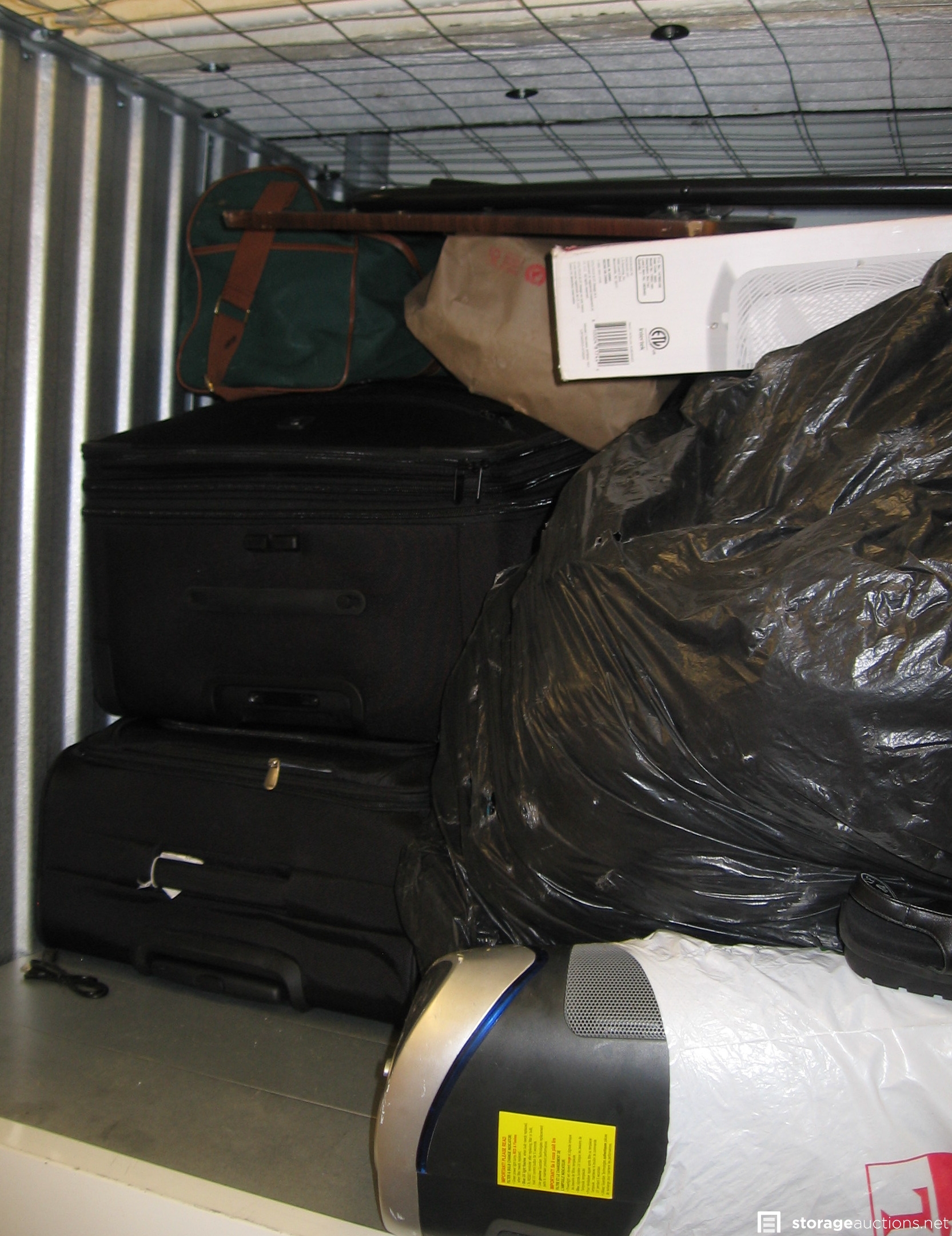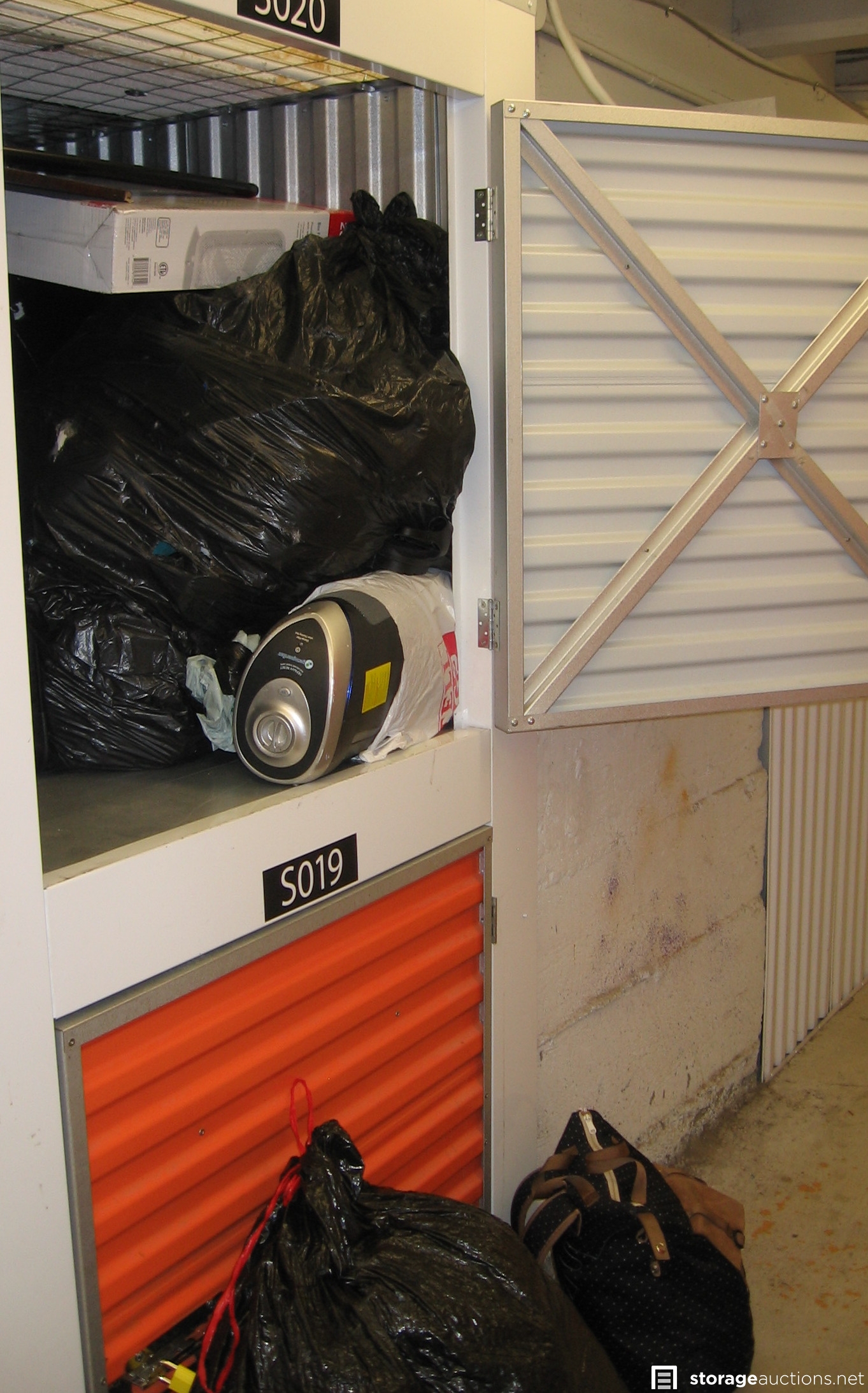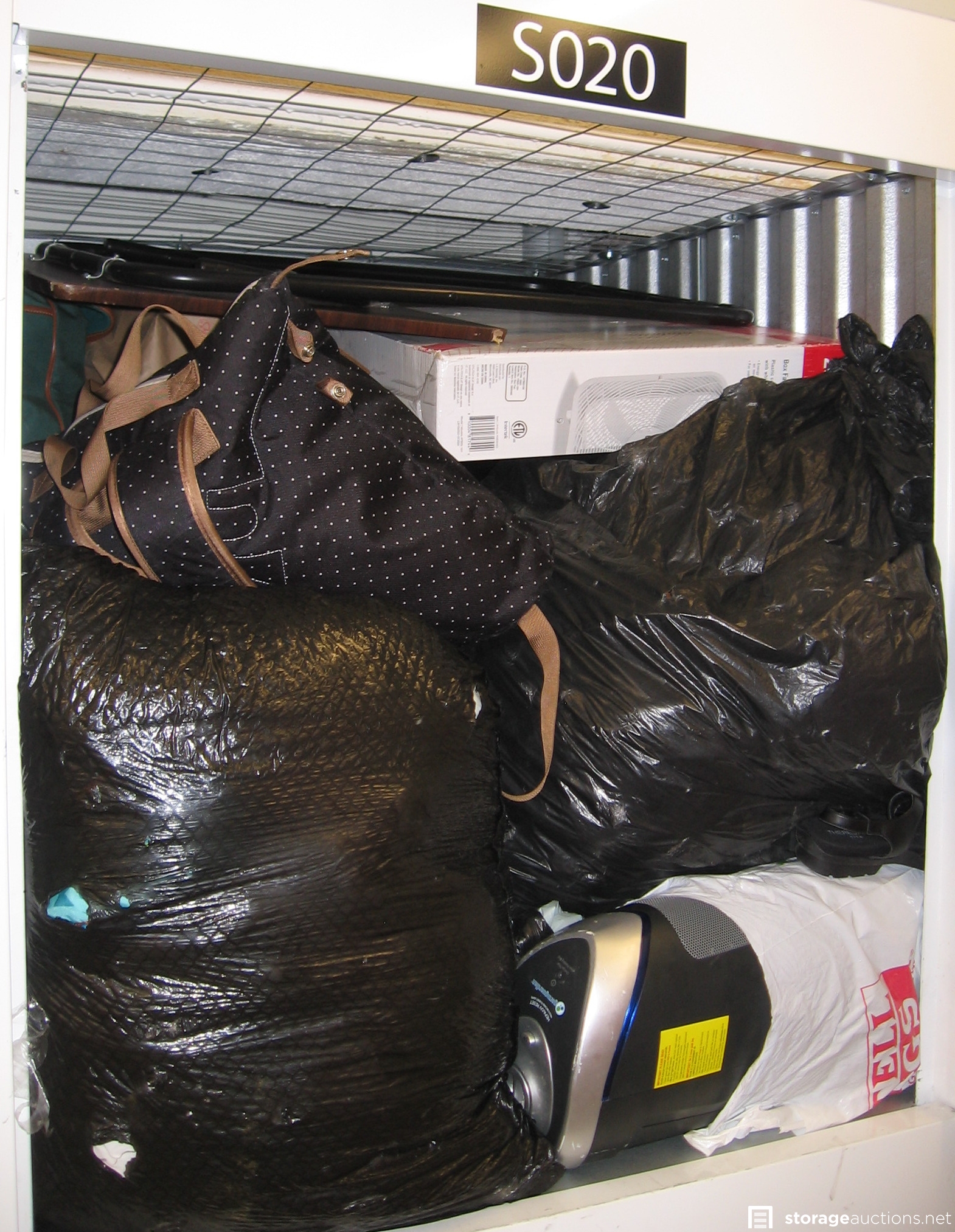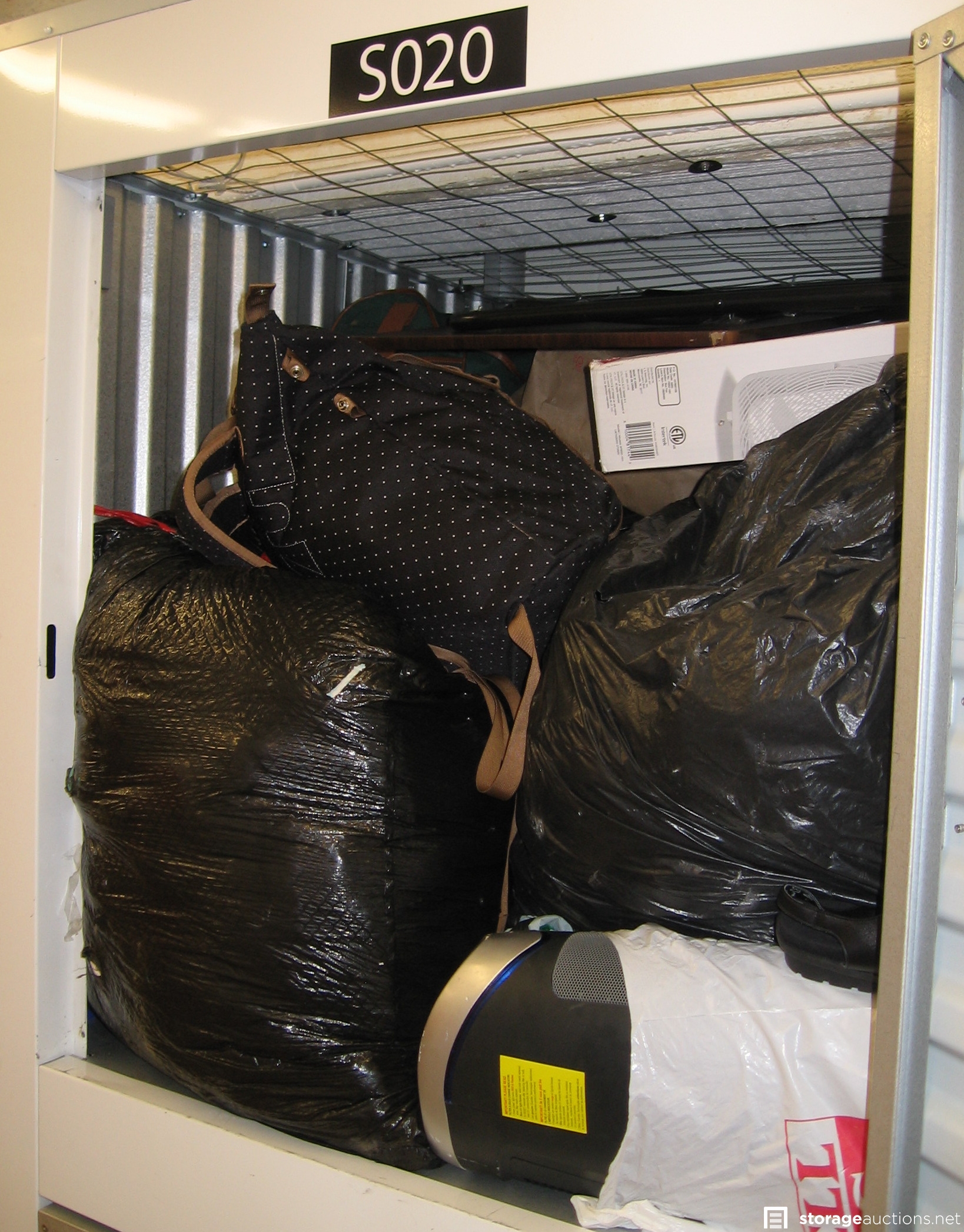 Unit S020 is an upper locker unit packed full with a woman's personal belongings. Actual measurements are 3.5 feet wide by 3.75 feet deep by 3.75 feet high. The footprint is 13 square feet. Contents include 2 suitcases, backpack, full garbage bags, box fan, other bags, misc.