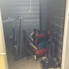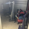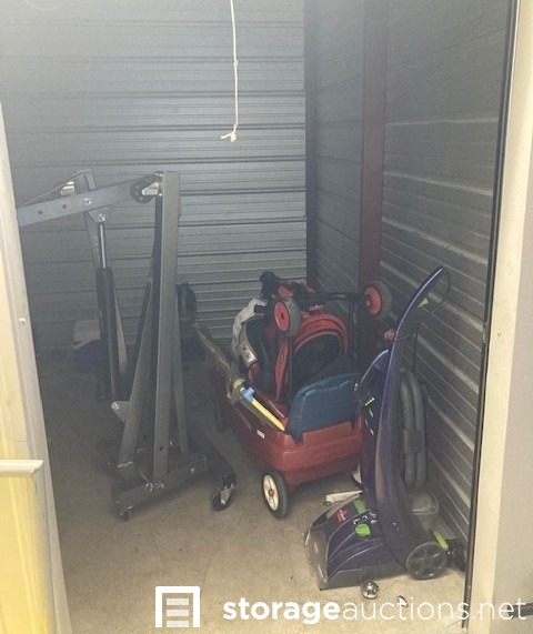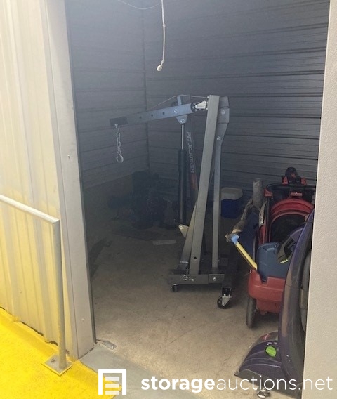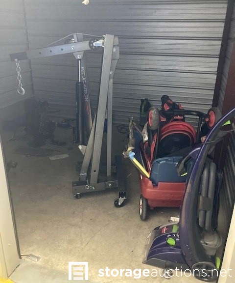 The contents of the unit visibly include but are not limited to: a hydraulic engine hoist, a vacuum cleaner, a kid wagon, etc.