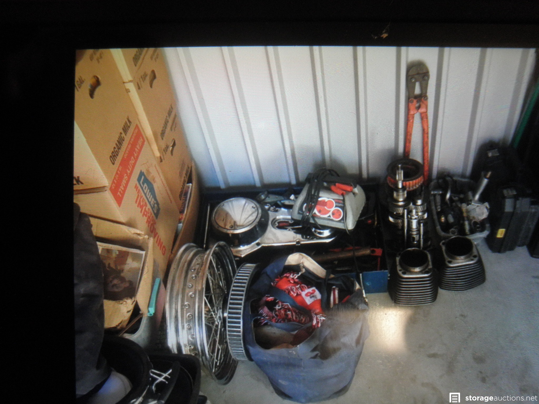 Tire, hand tools,tool bag, fan, misc tools, saddle bags, Motorcycle parts, boxes unopened, household items,step stool, welding helmet
