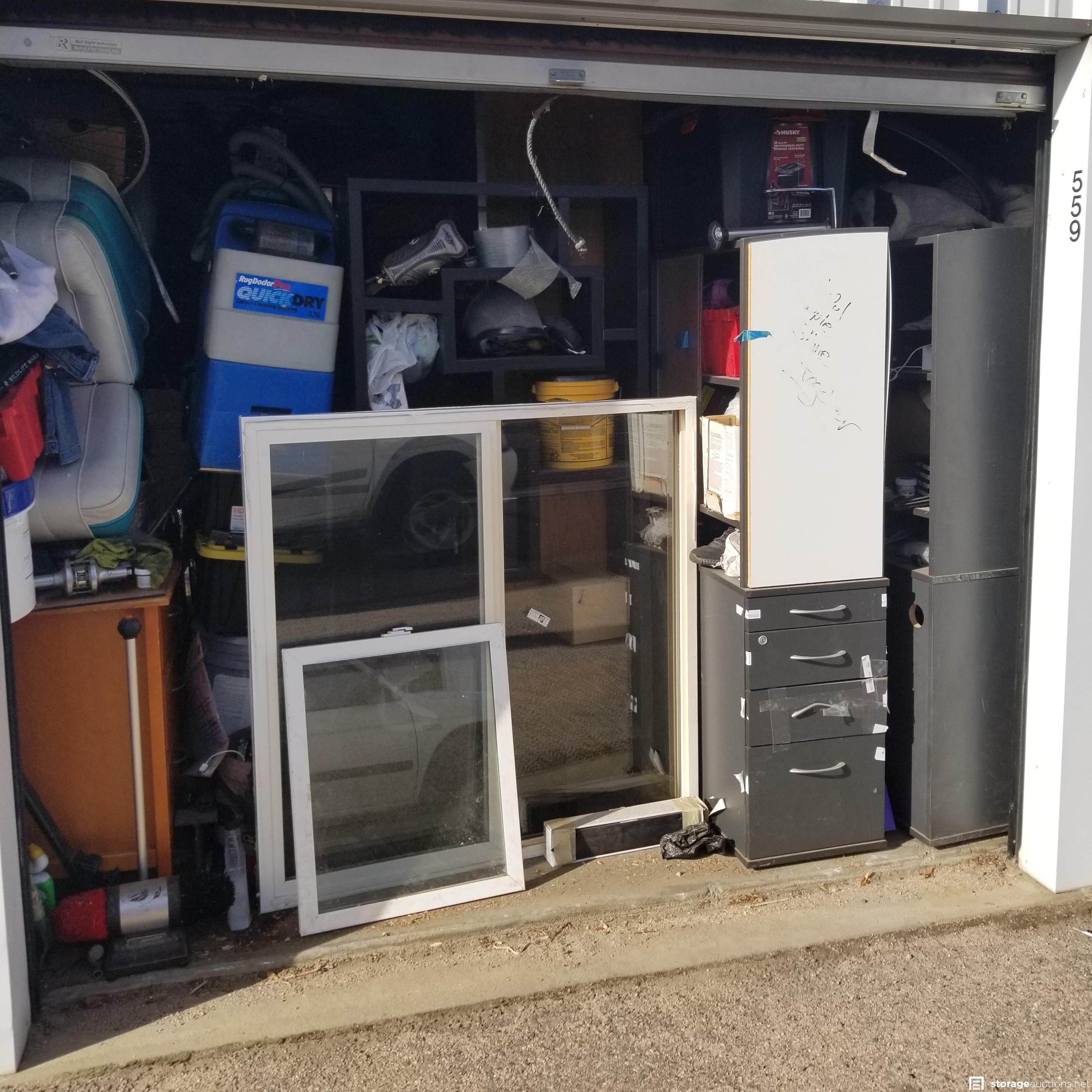 dresser, bookcase, filing cabinet, furniture, carpet cleaning machine, hand tools, mountain bikes, windows, many unopened boxes and tubs