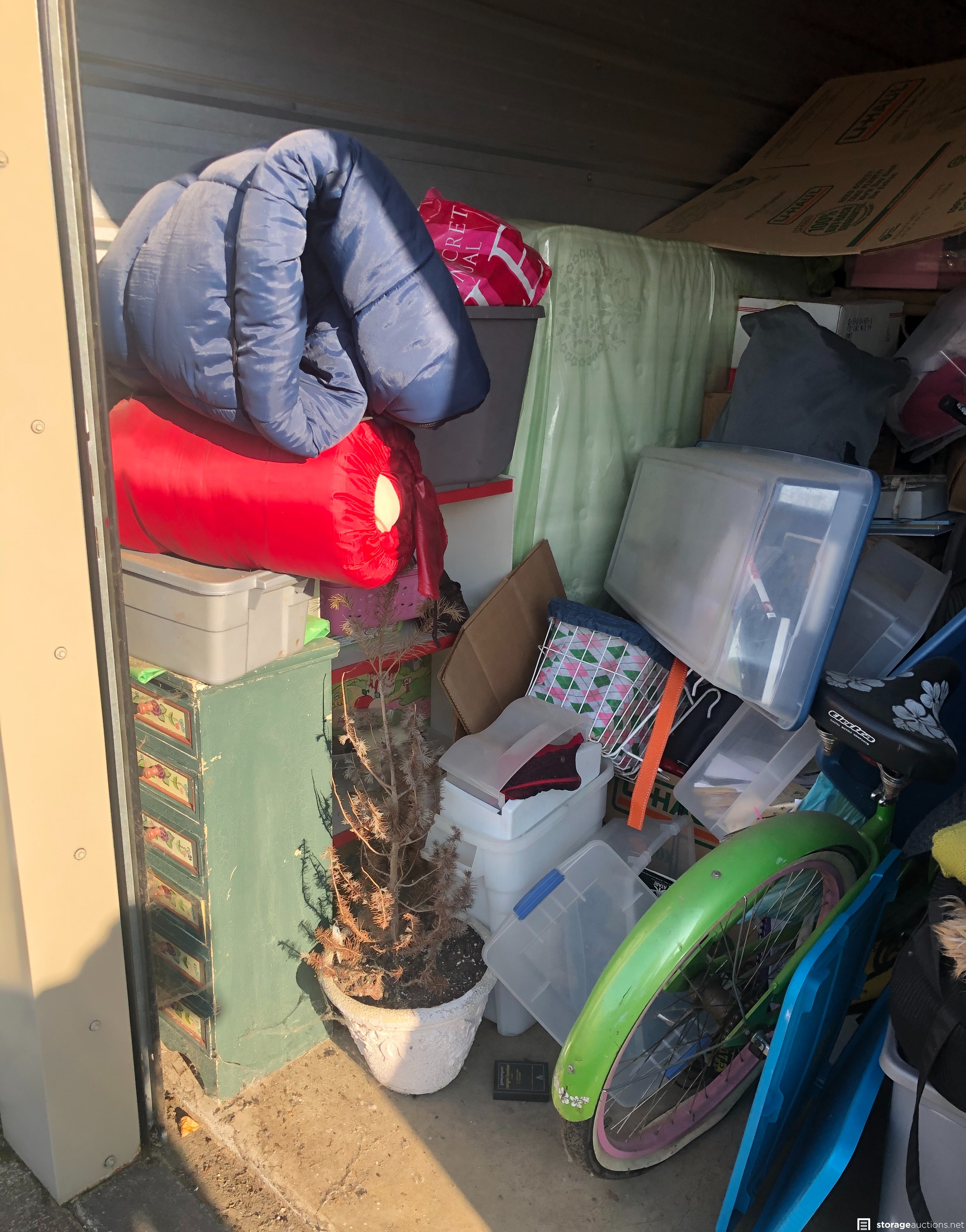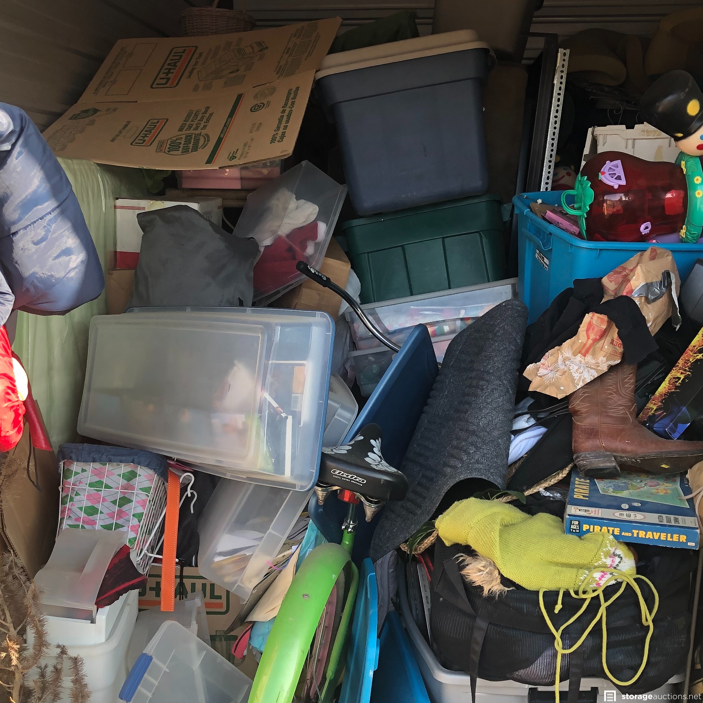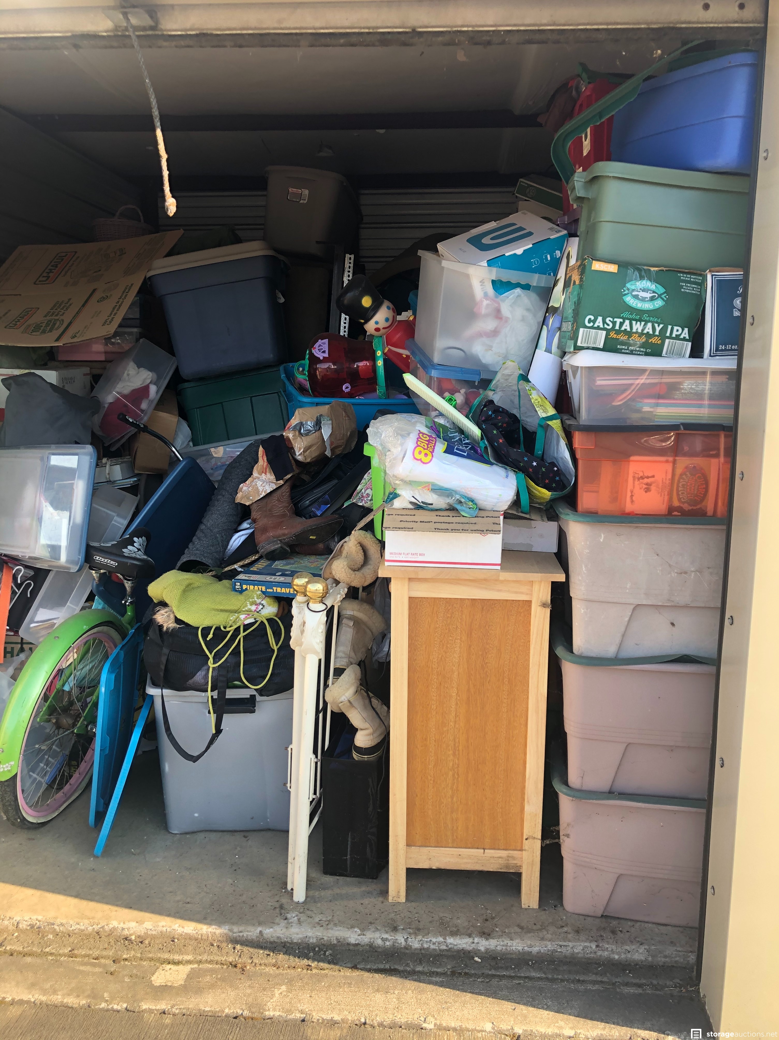 There appears to be a bed frame, a vintage bicycle, mattress, dressers, books, video camera, book shelf, furniture, lots of boxes, Atari games, DVD's, some vintage toys, wall art, tennis rackets, sleeping bags, lots of totes, kids toys, VHS Tapes, craft supplies, and other misc. items