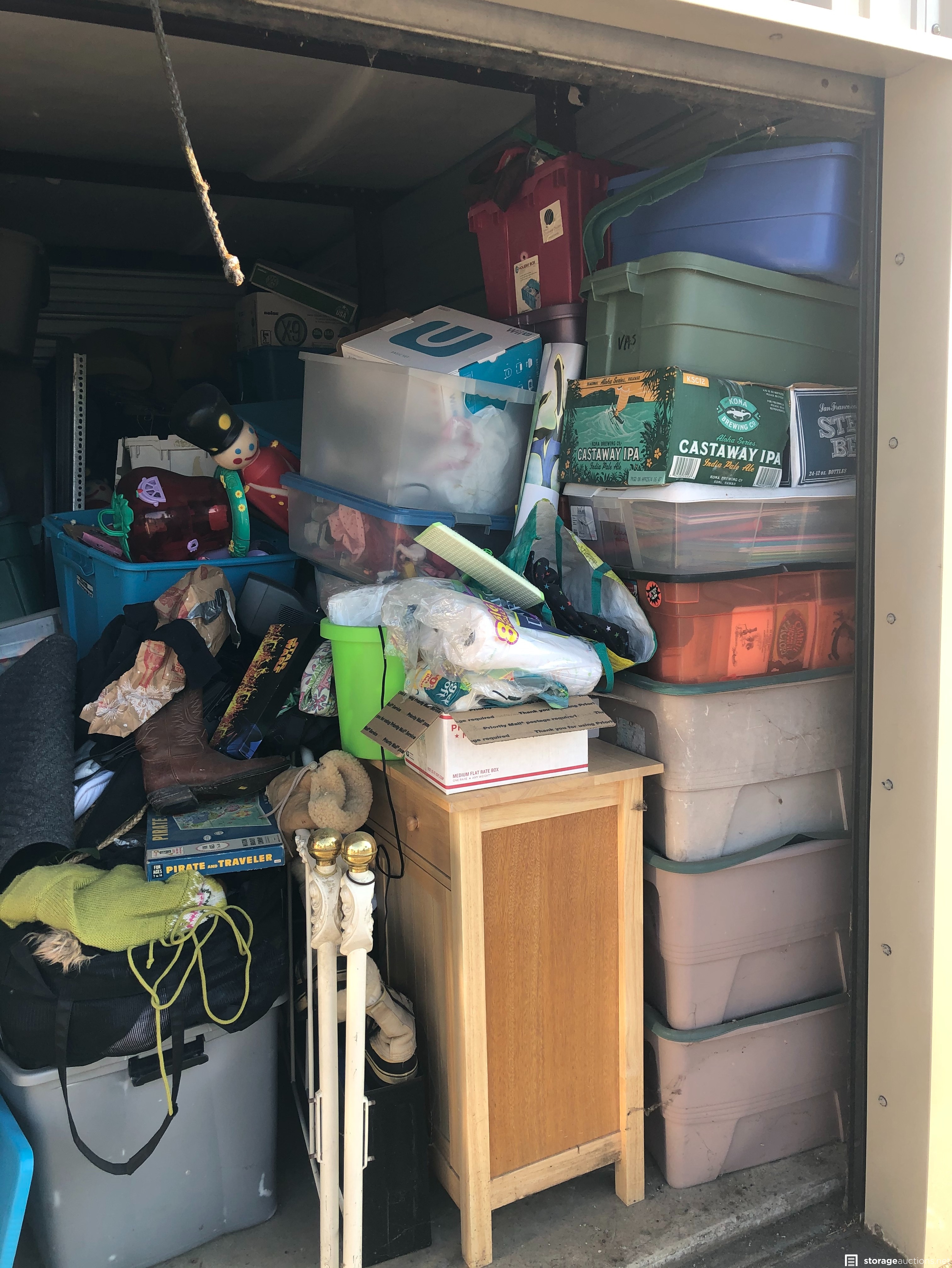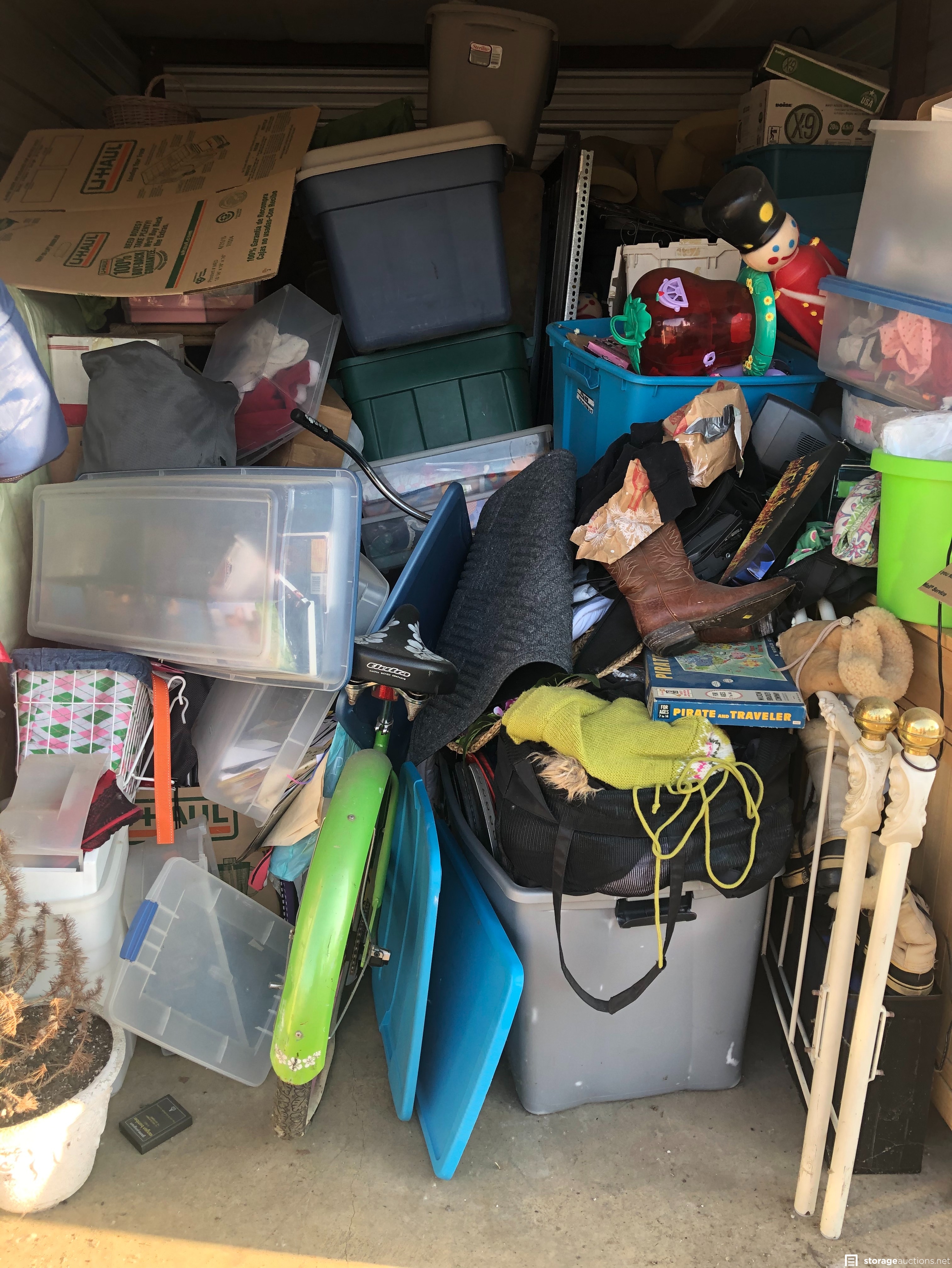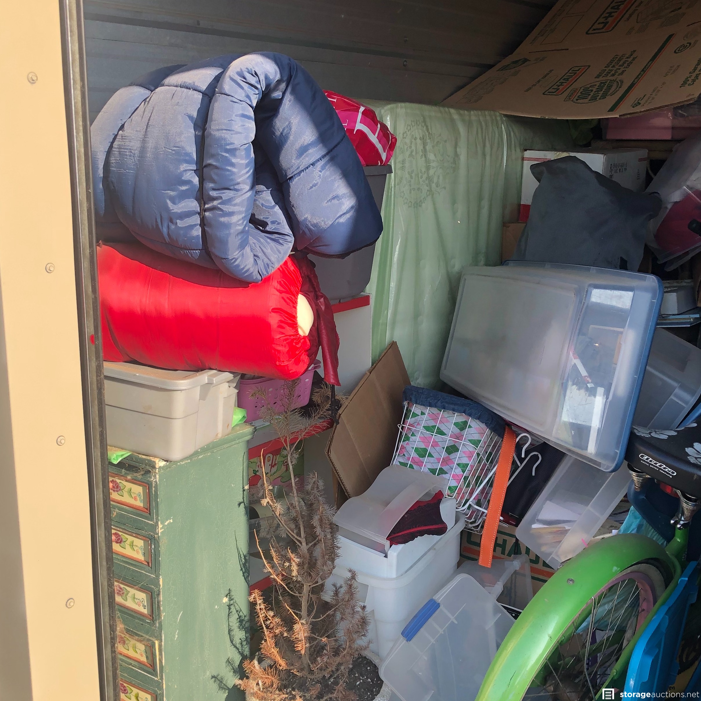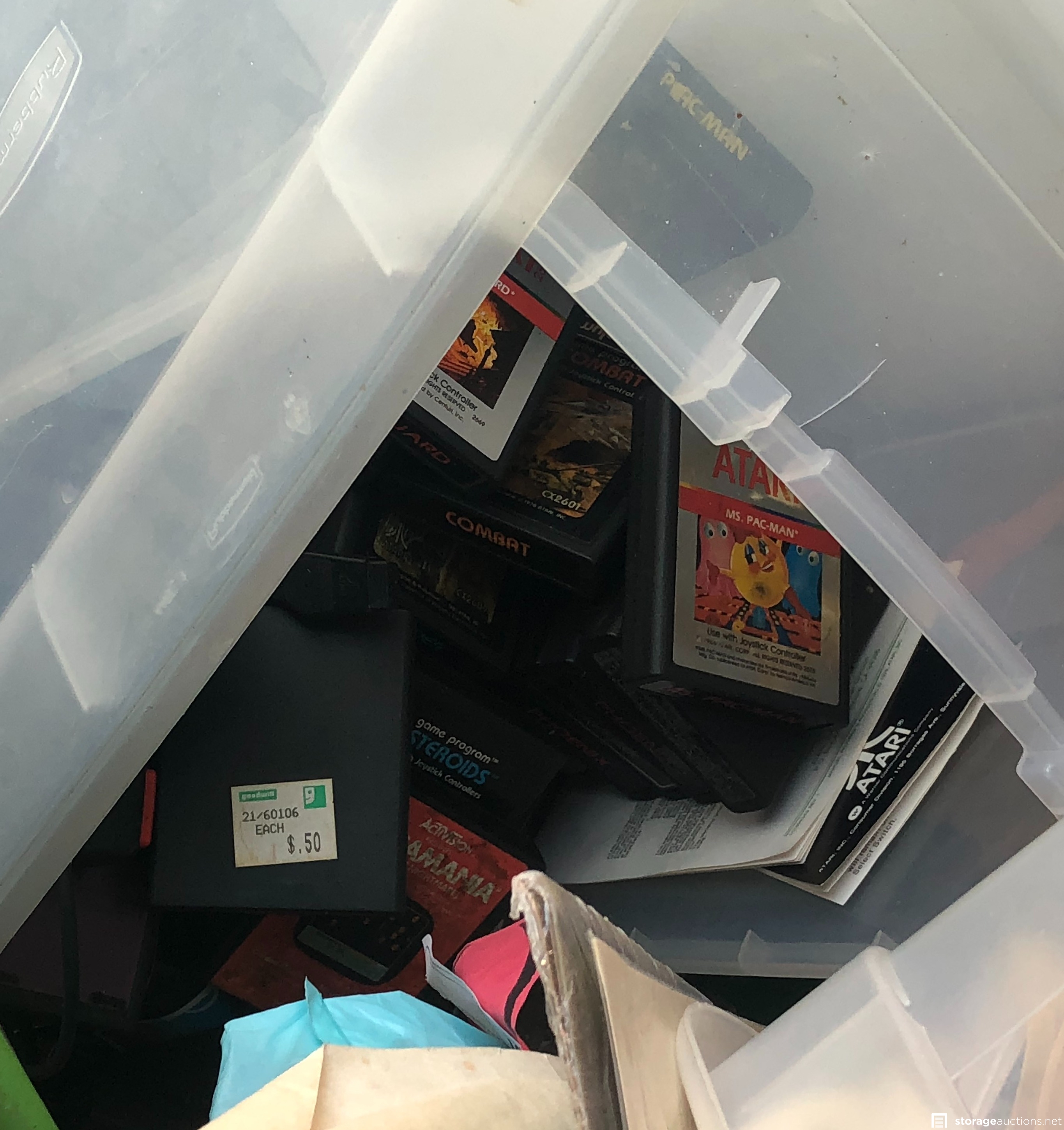 There appears to be a bed frame, a vintage bicycle, mattress, dressers, books, video camera, book shelf, furniture, lots of boxes, Atari games, DVD's, some vintage toys, wall art, tennis rackets, sleeping bags, lots of totes, kids toys, VHS Tapes, craft supplies, and other misc. items