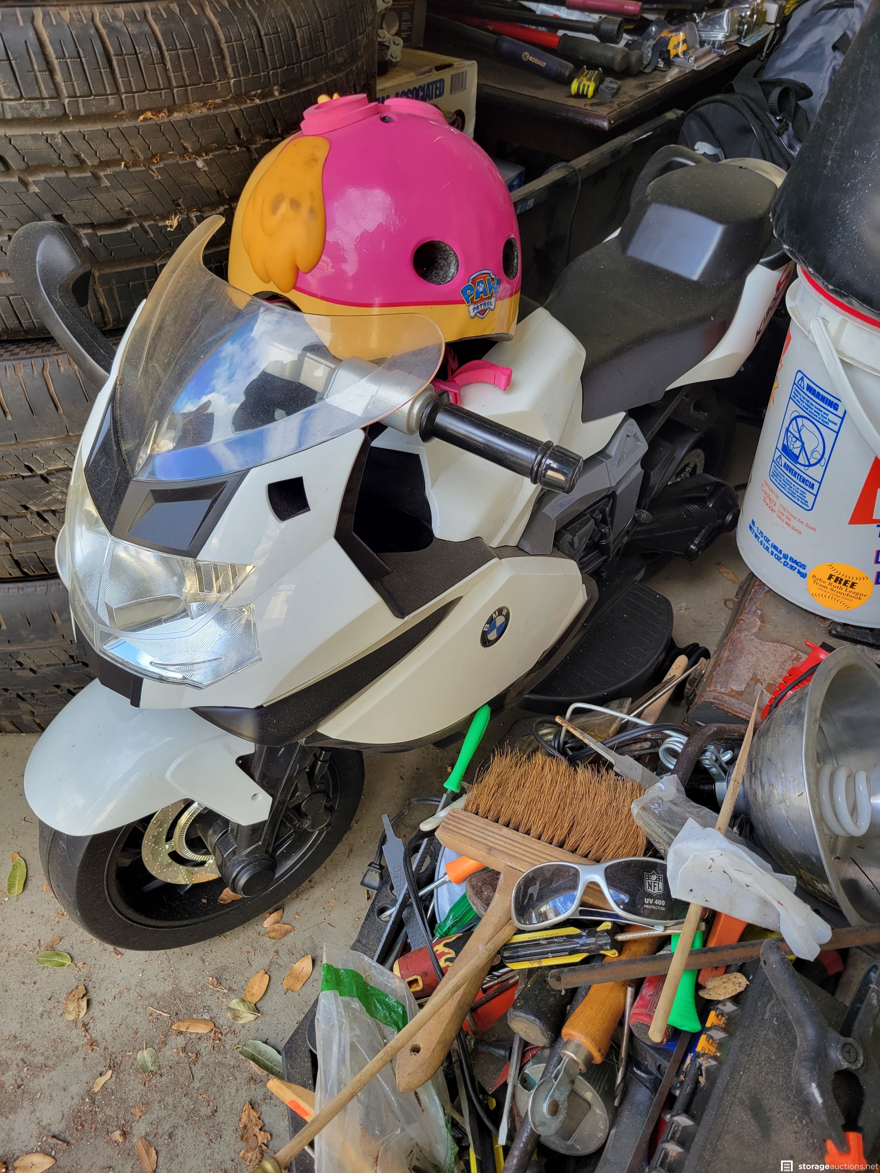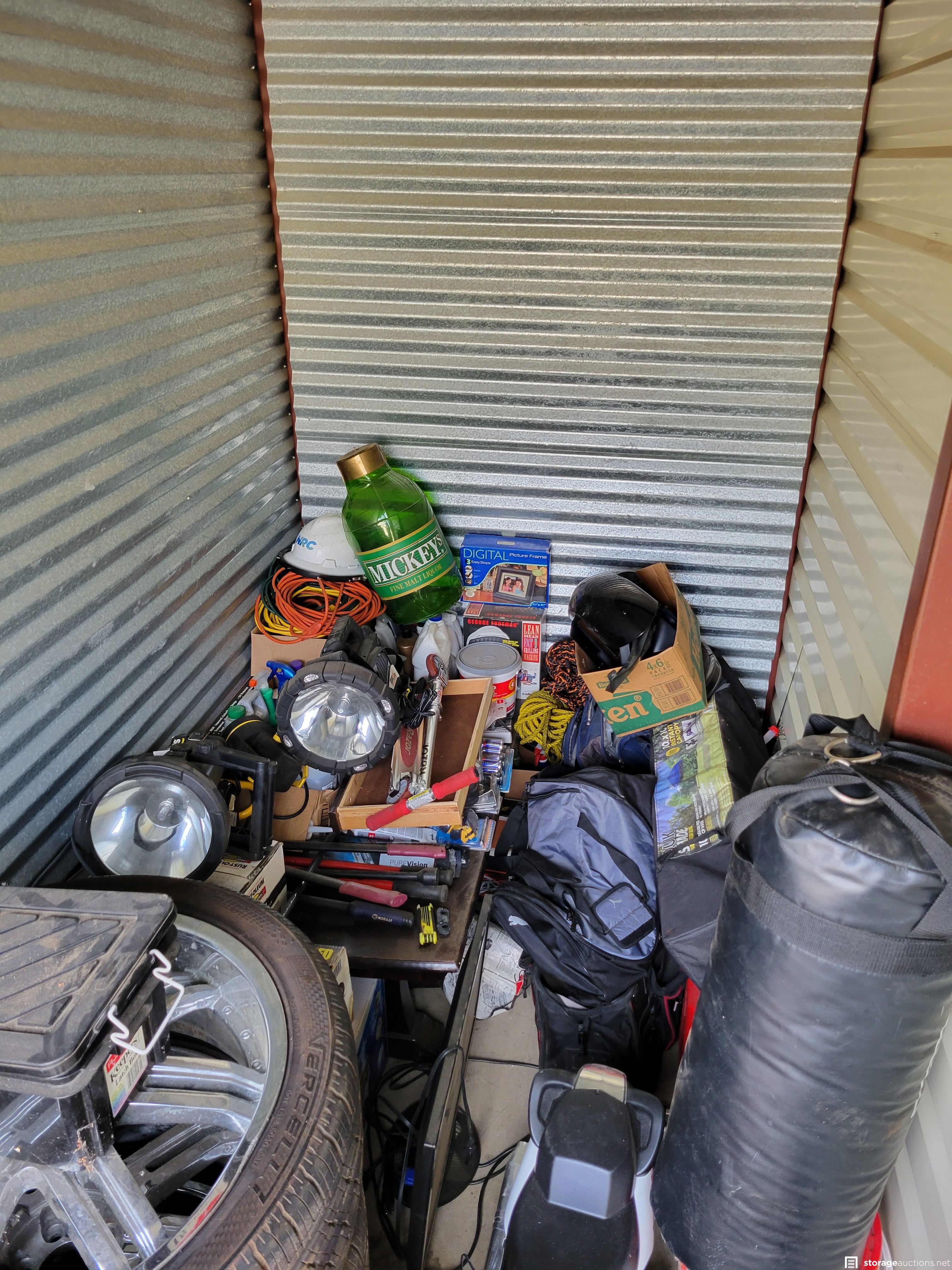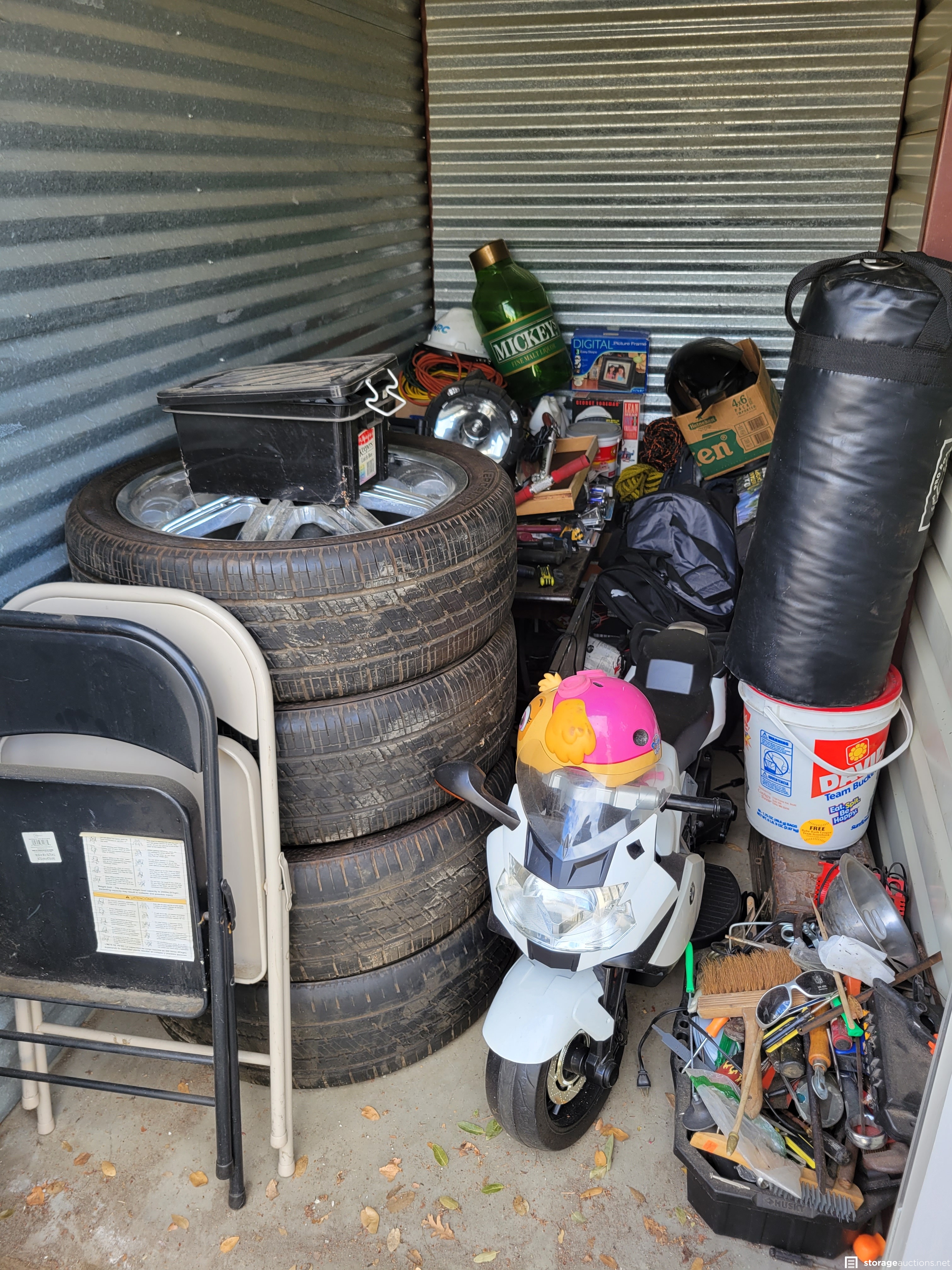 Punching bag, kids' electric motorcycle, monitor, four tires and rims, pop up canopy, misc. tools, George Foreman grill, two metal folding chairs, spotlight, razor scooter, coffee table, red gas cans and other misc. assorted items.