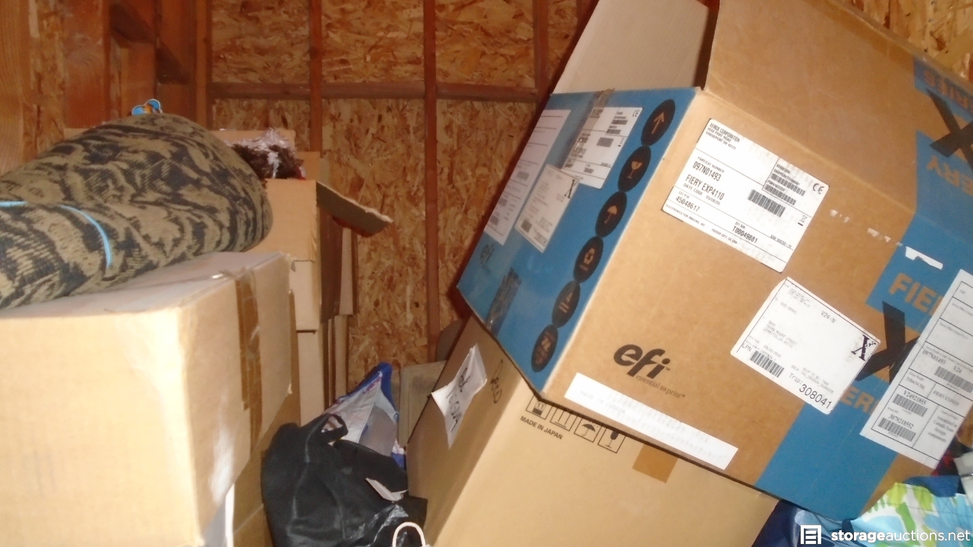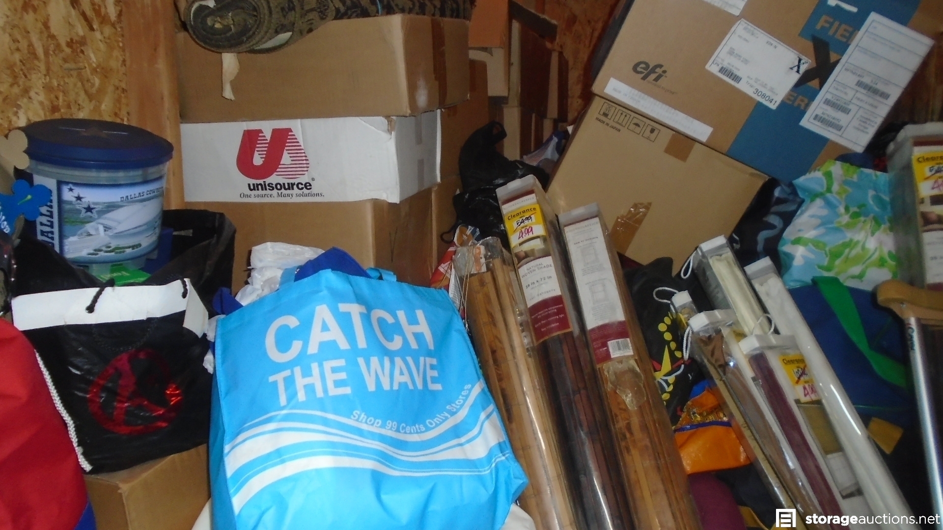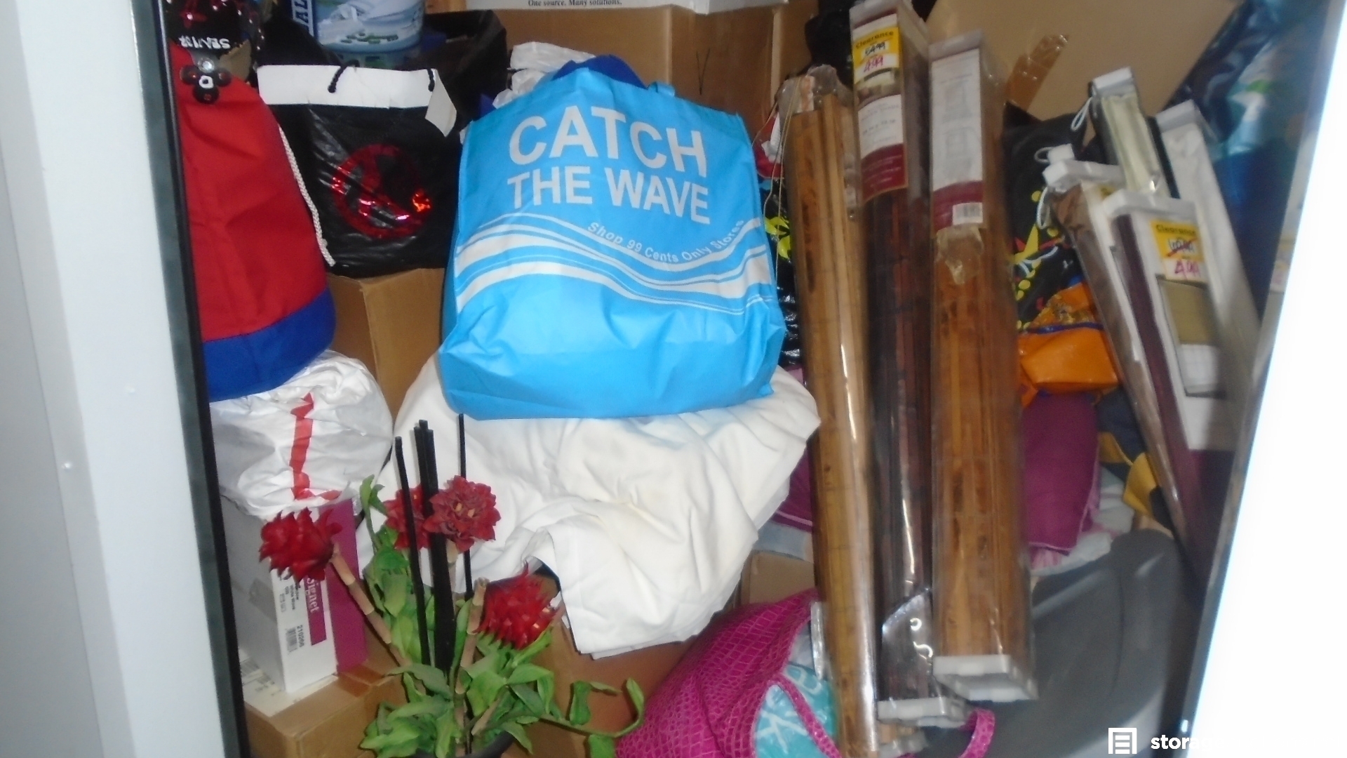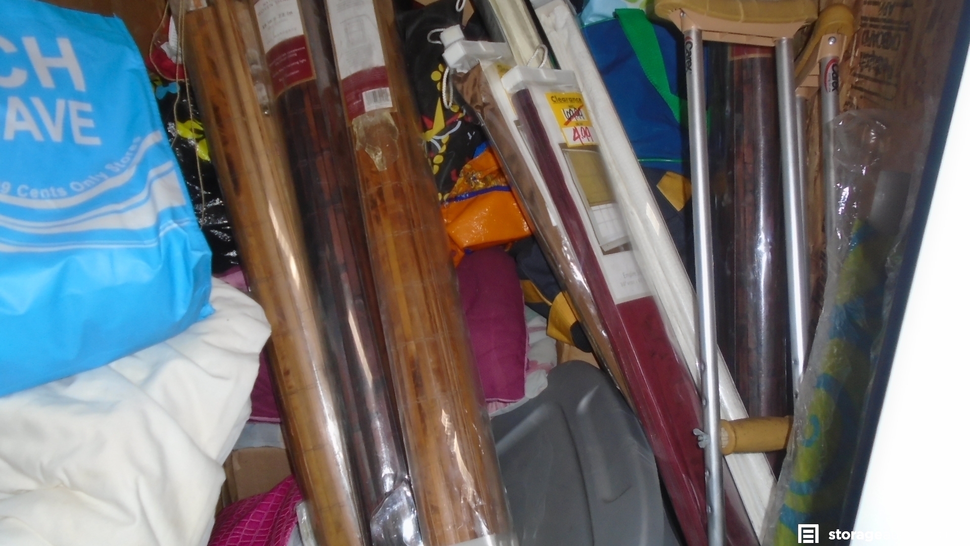 Unit appears to have; 30-40 boxes, wooden window blinds, curtains, beach umbrella and misc. items.