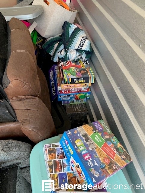 Leather reclyner, Grey reclyner, Boxes, Totes, Cooler, Board Games, blankets, fabric basket, Lamp, Plastic basket, hamper, fablic tote, suit case, christmas tree, portable tray, clothes