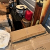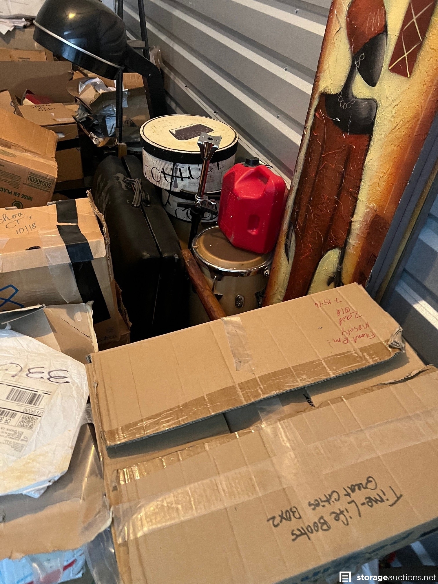 Unit appears to have wash or dryer, Drums, wall art, many boxes and odds and ends