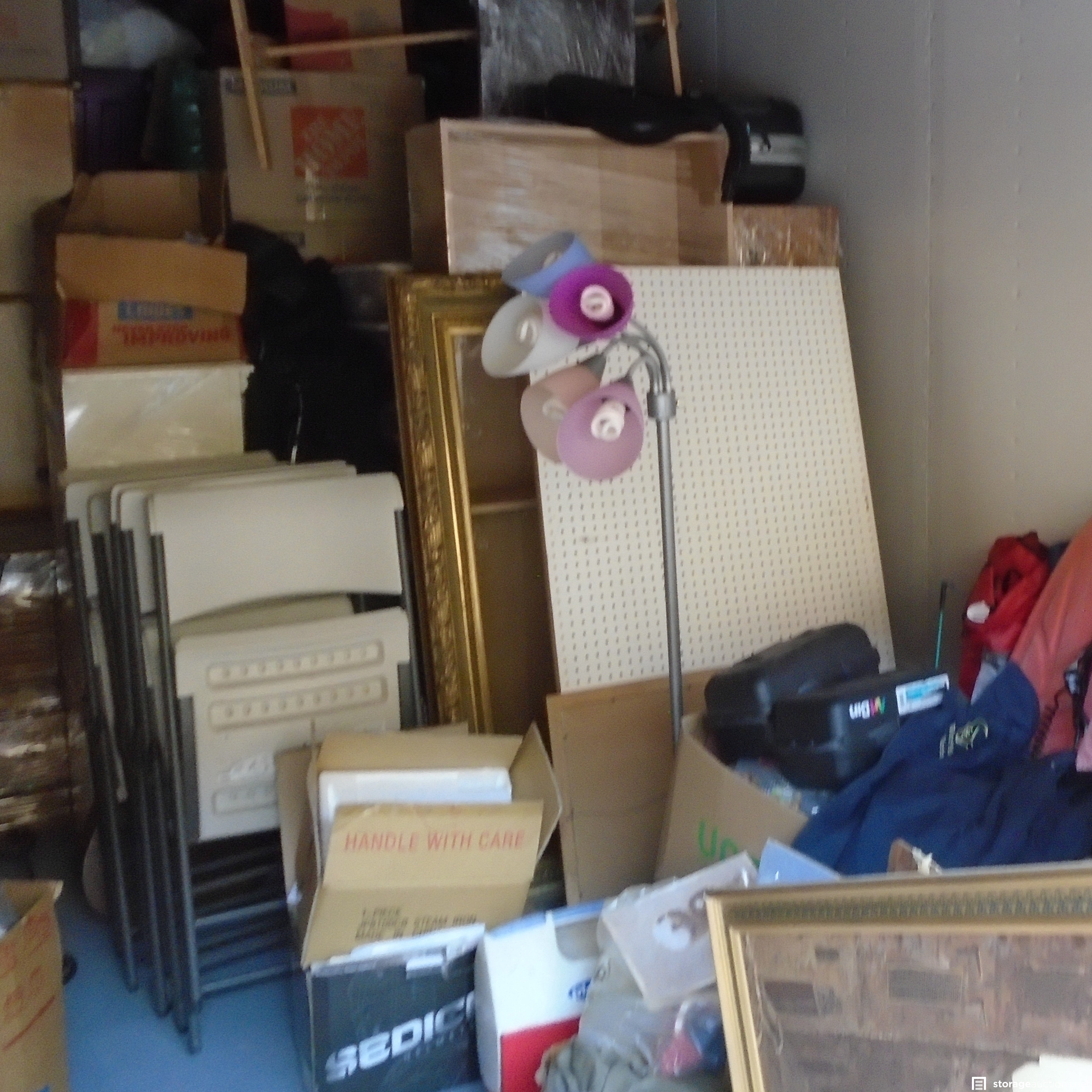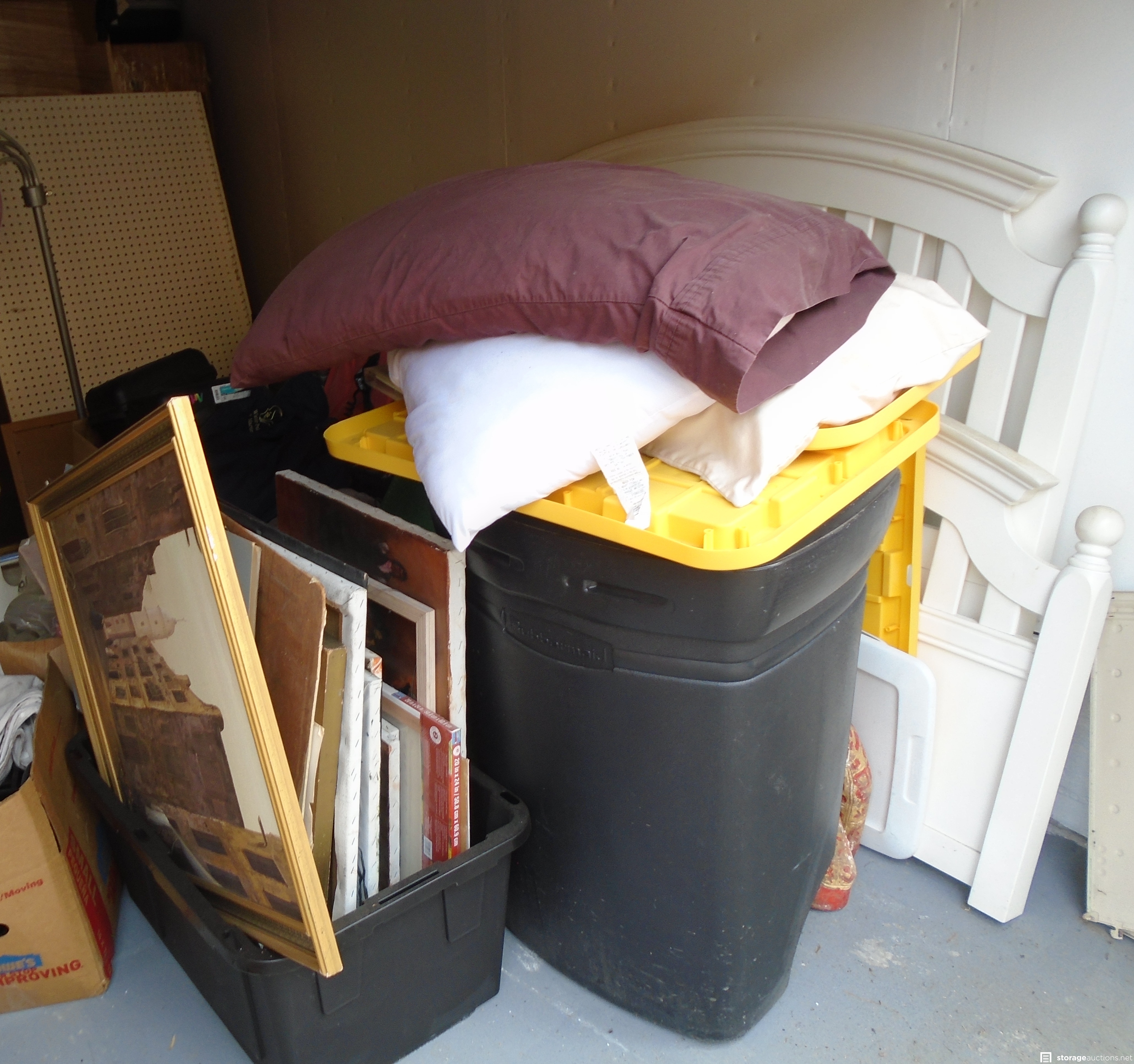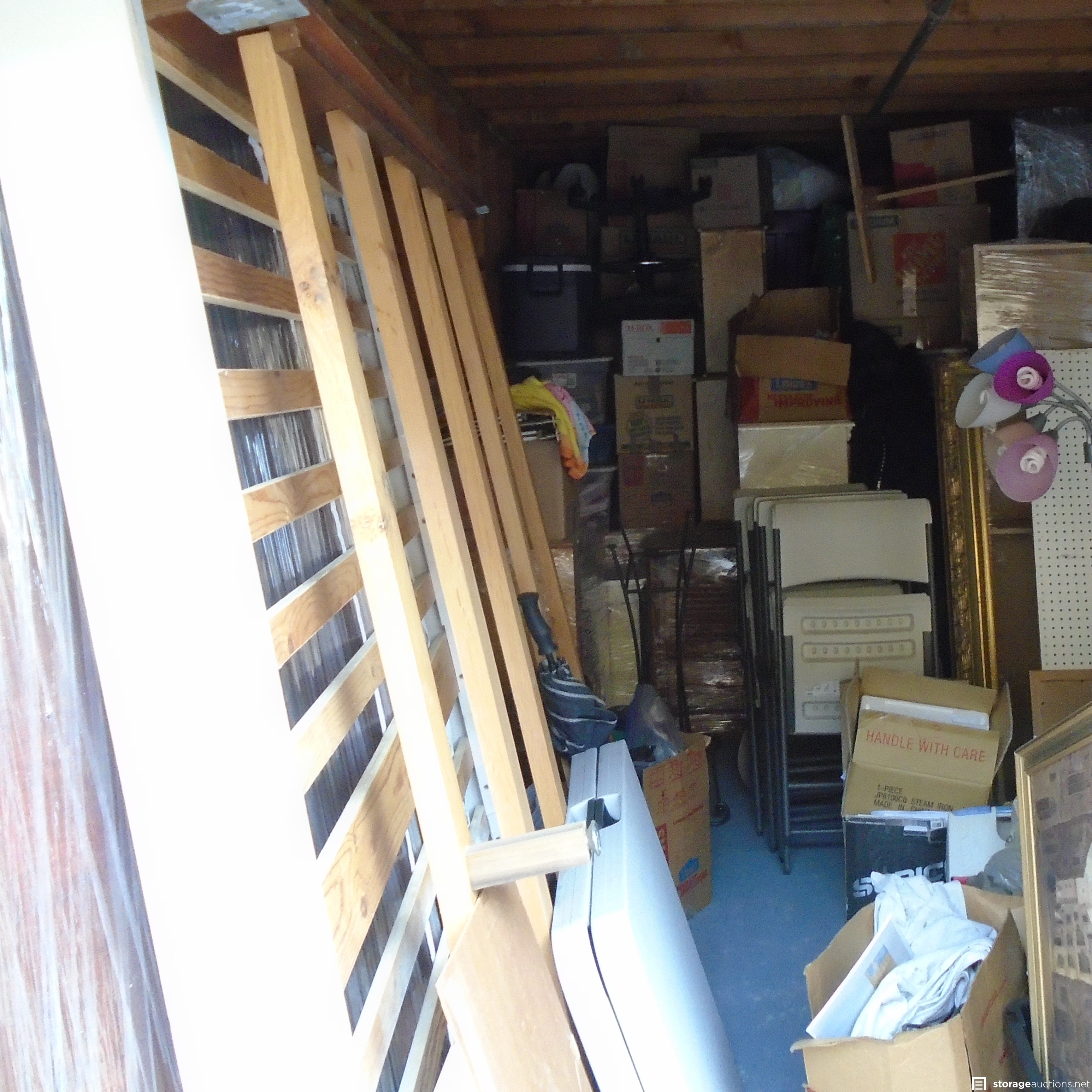 Unit Appears to contain: headboard/footboard, floor lamp, paintings, cabinet, chairs, beach umbrellas, boxes and totes.