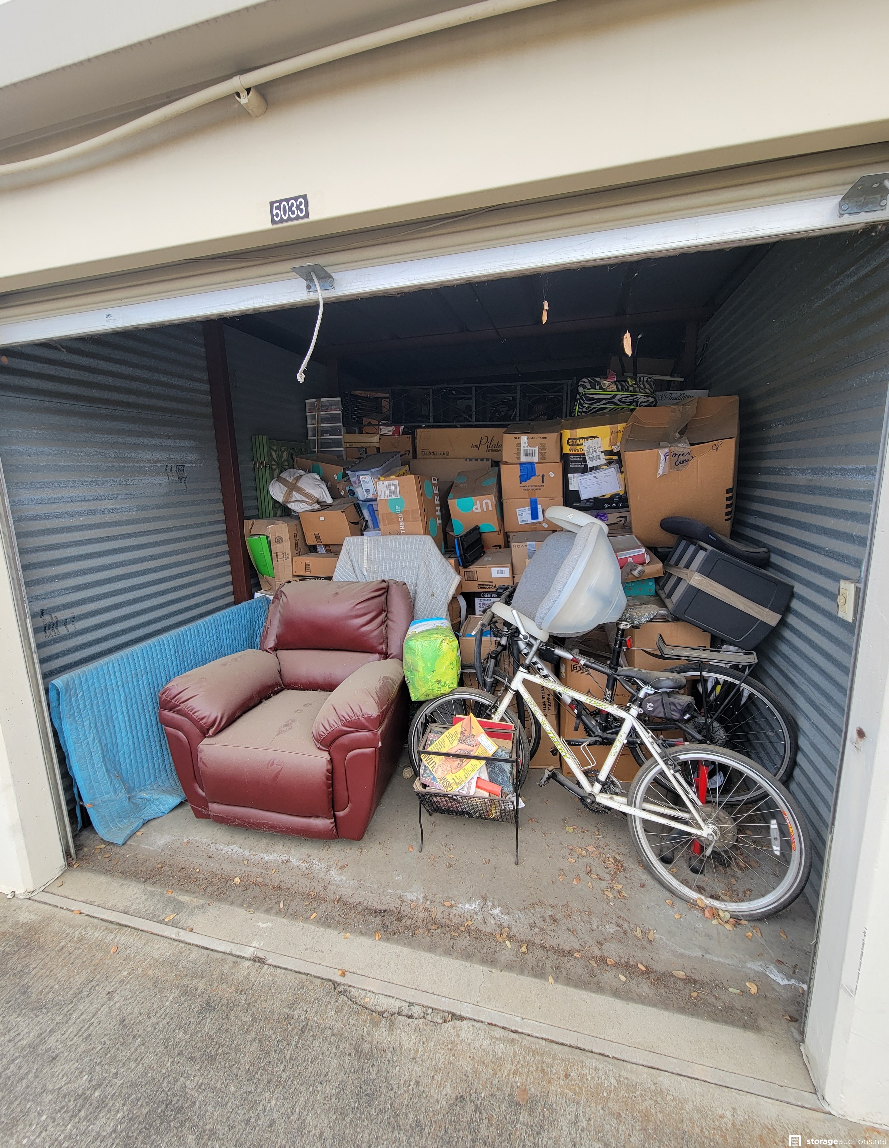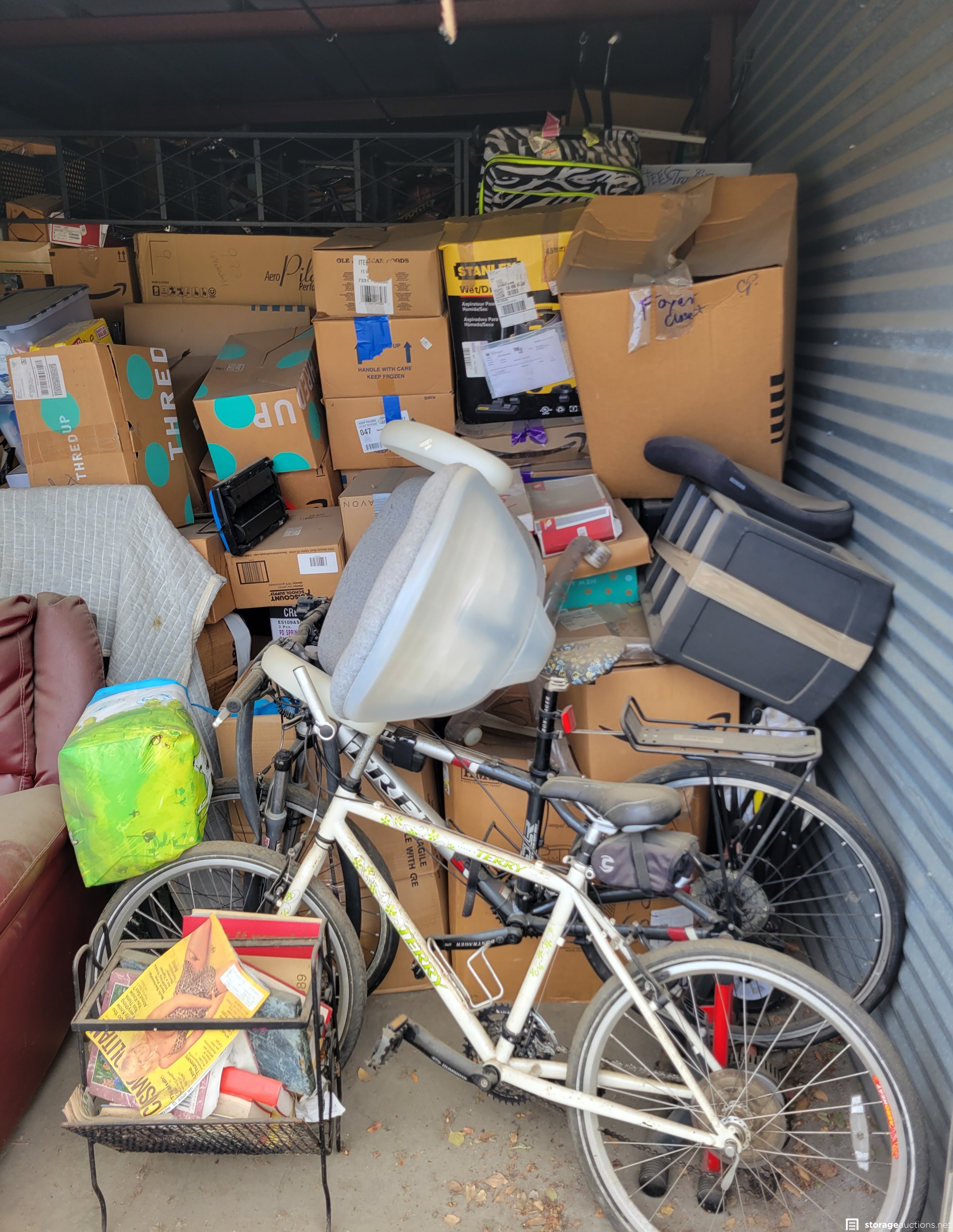 Unit contains boxes, bicycles, chairs, tv, shelves, room divider, and other miscellaneous items.