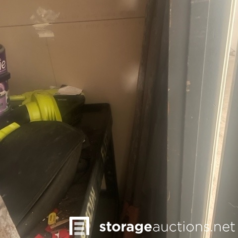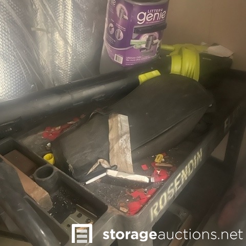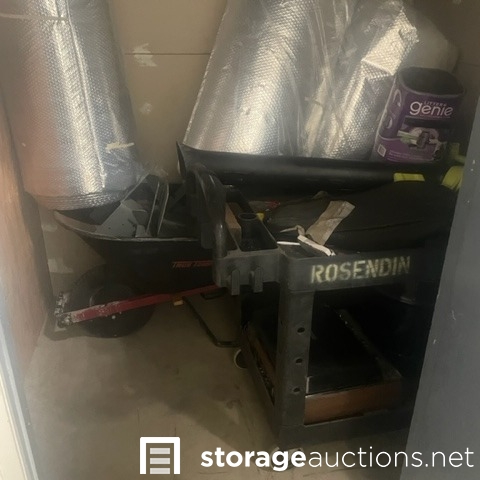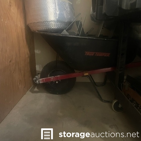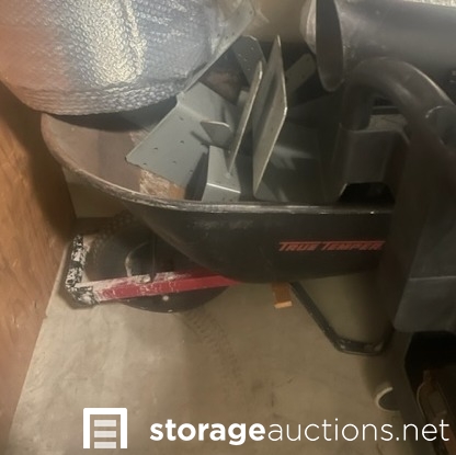 This unit appears to contain, wheel barrel, bubble wrap, cart, leaf blower, gardening tools, misc items.