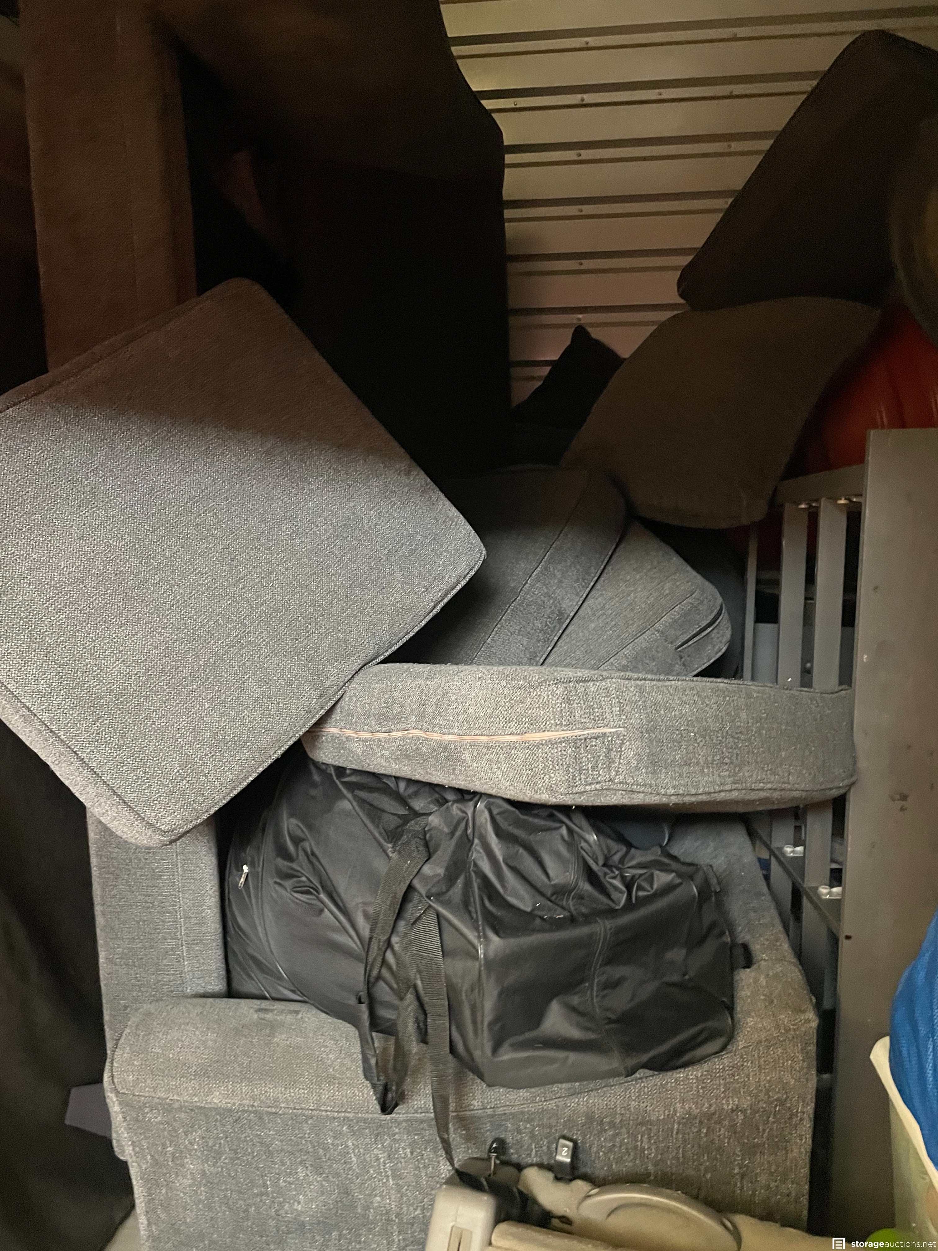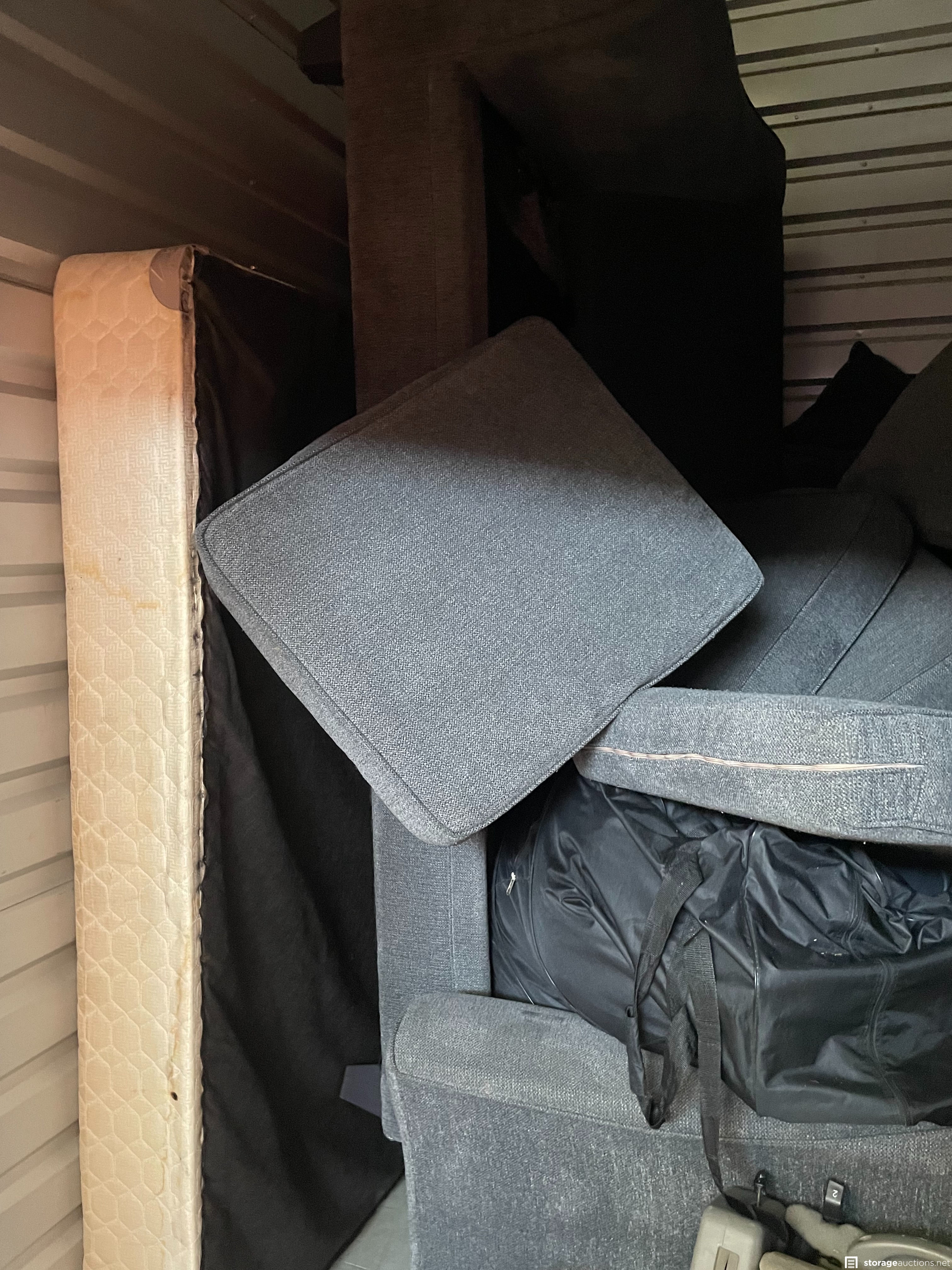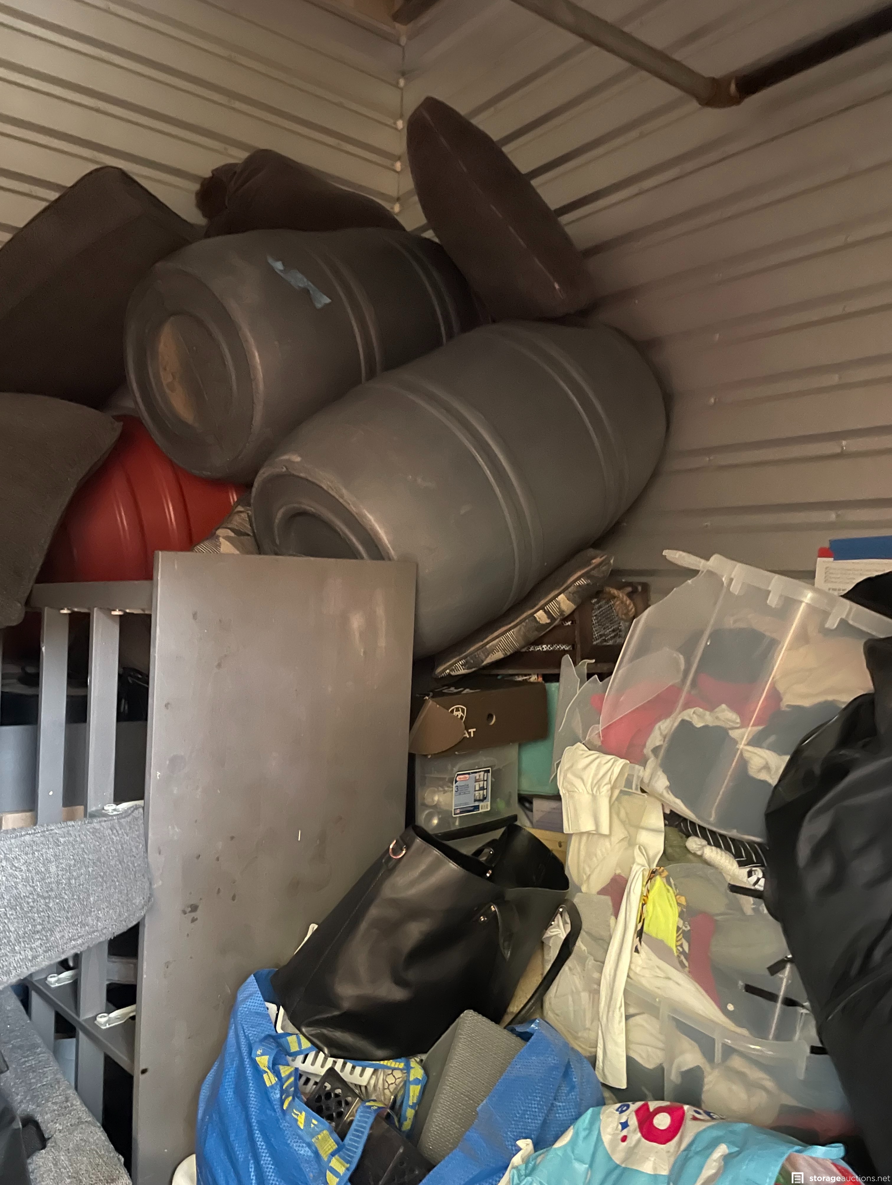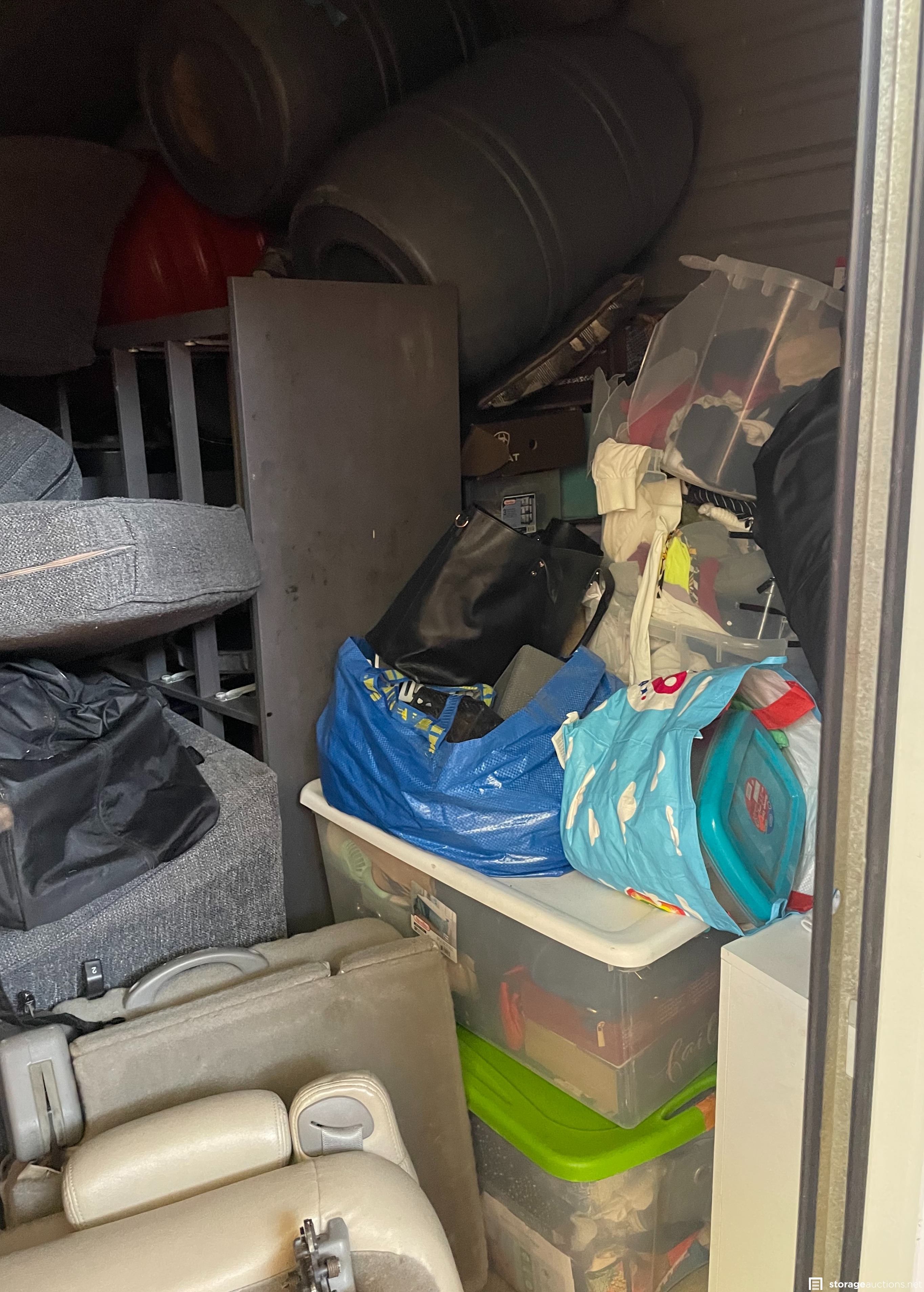 Unit contents are, 5 totes, mattress, dresser, couch, gallon tubes, car seats, bags