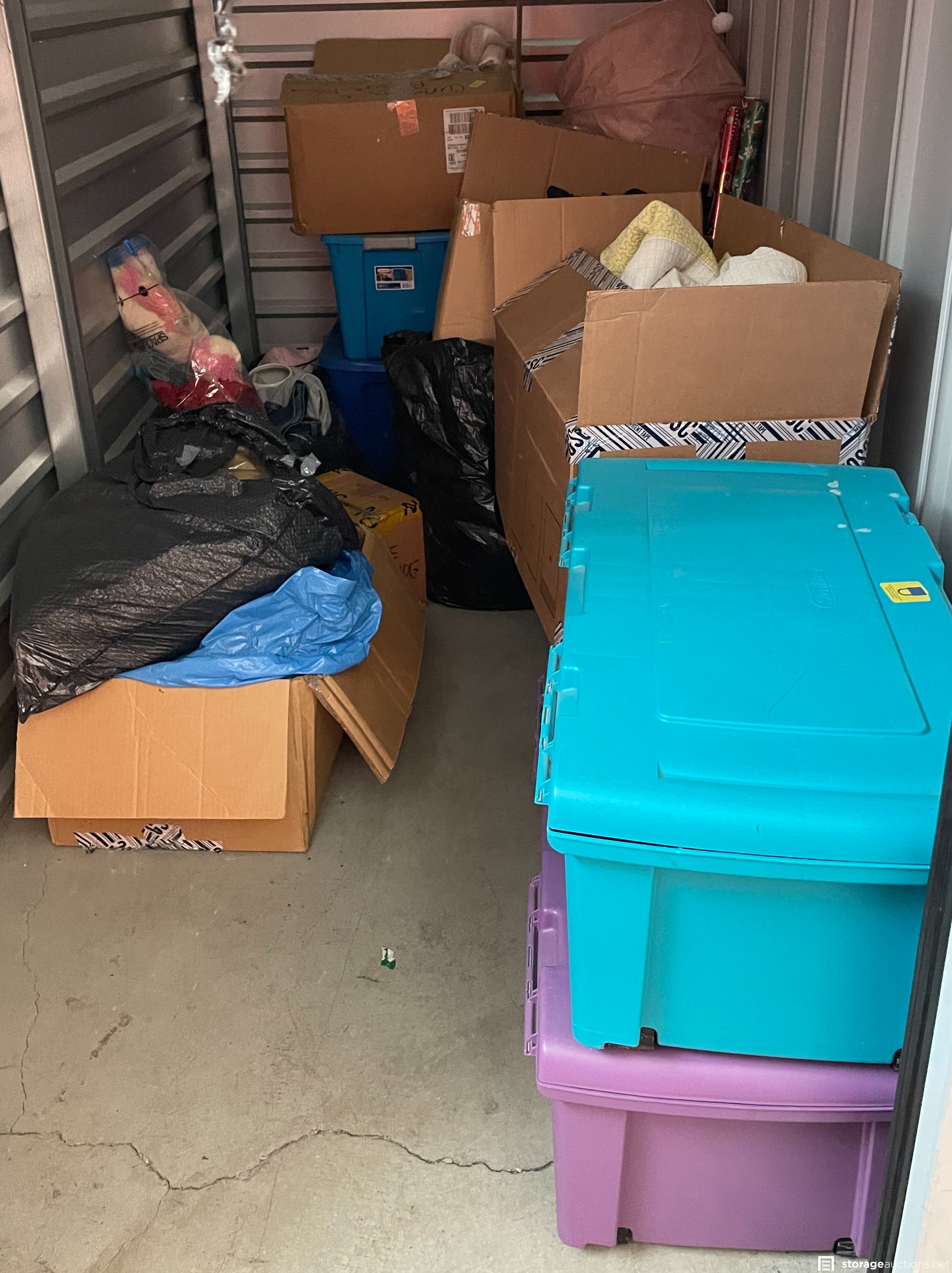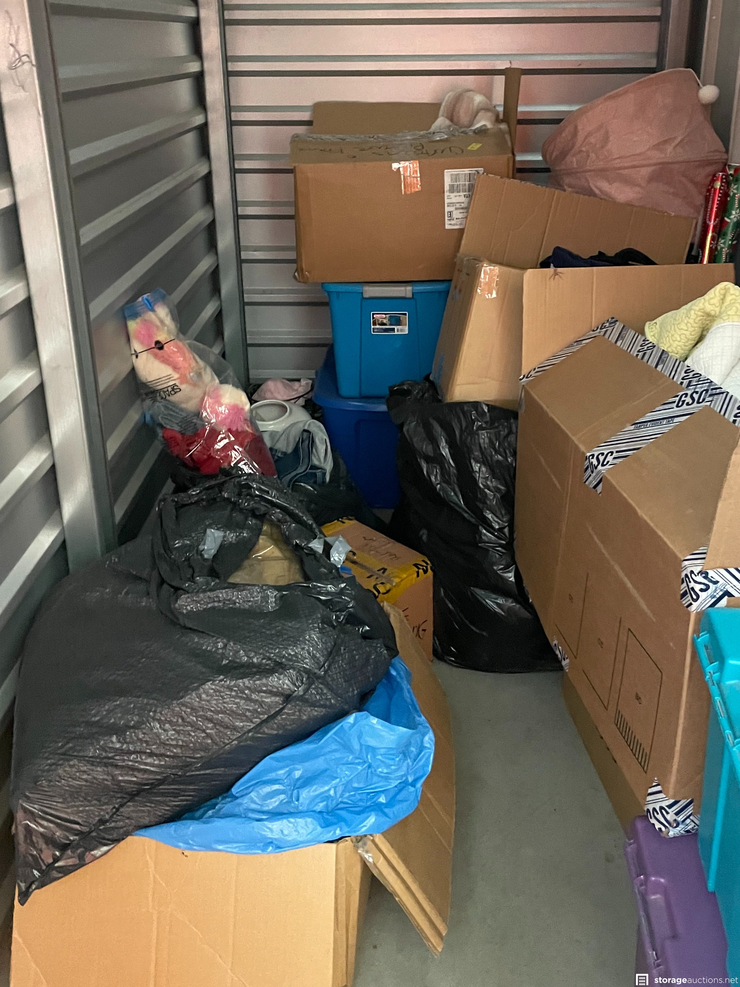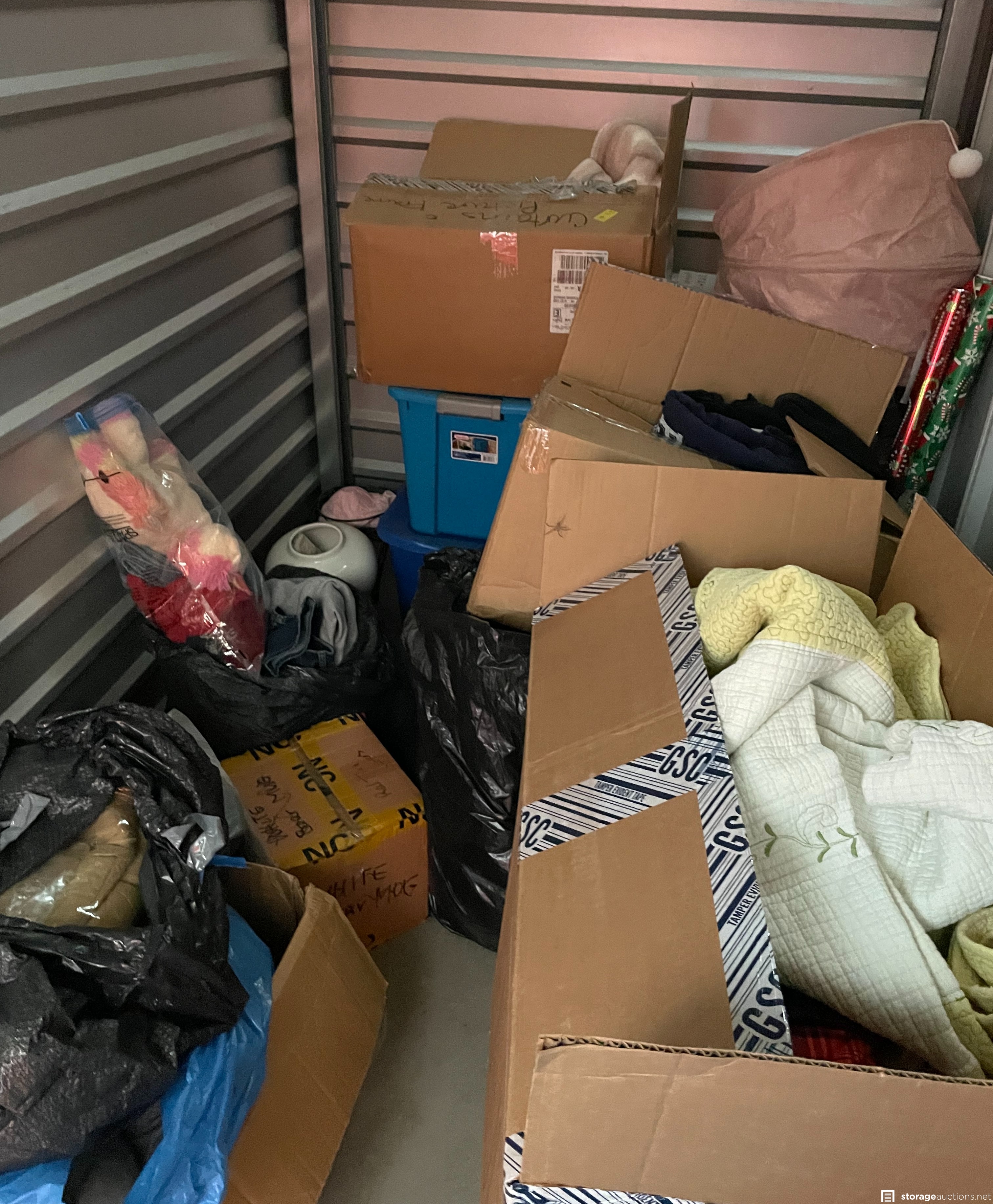 This unit contents are. 4 plastic totes, 3 bags, vase, blankets