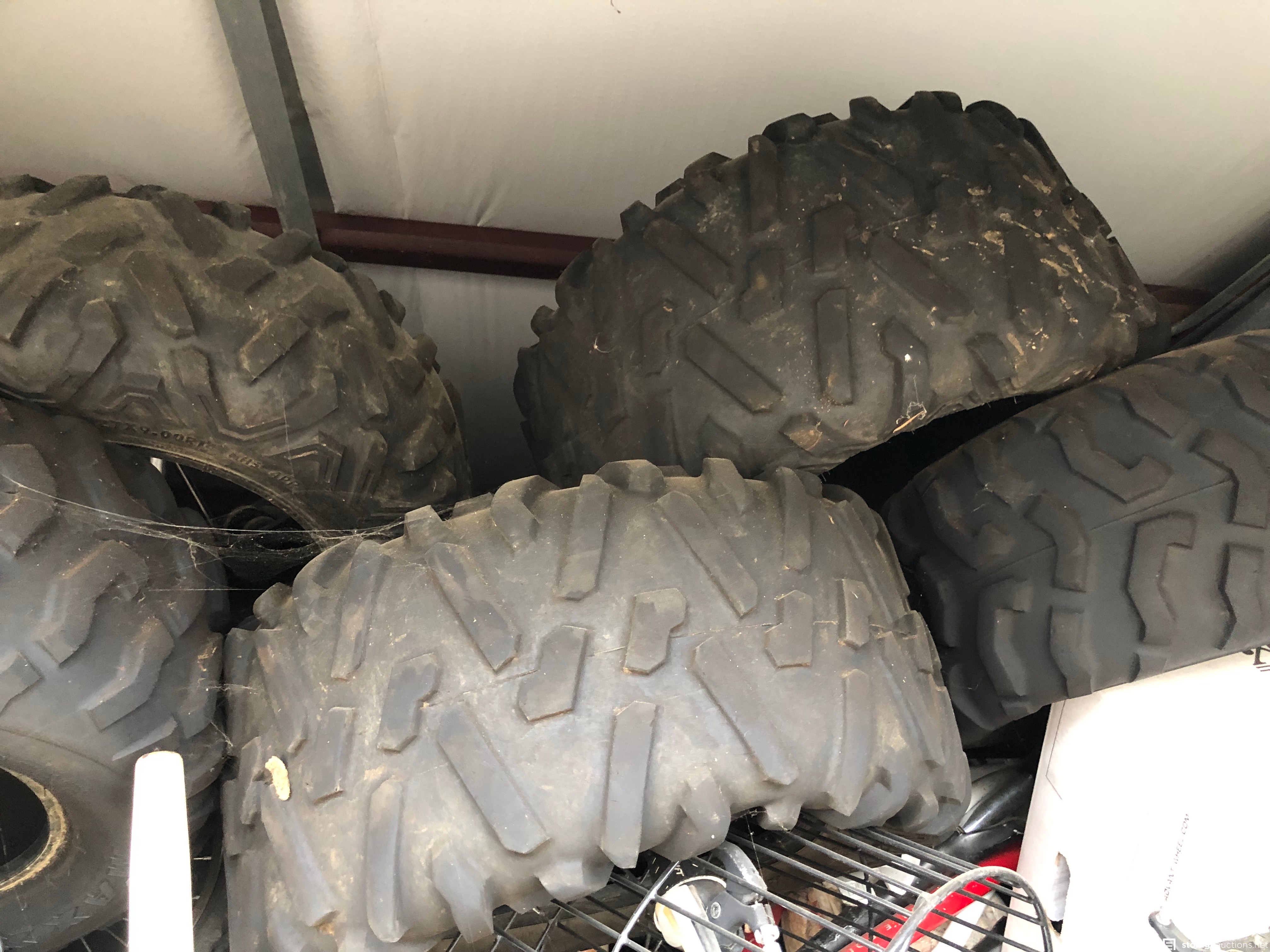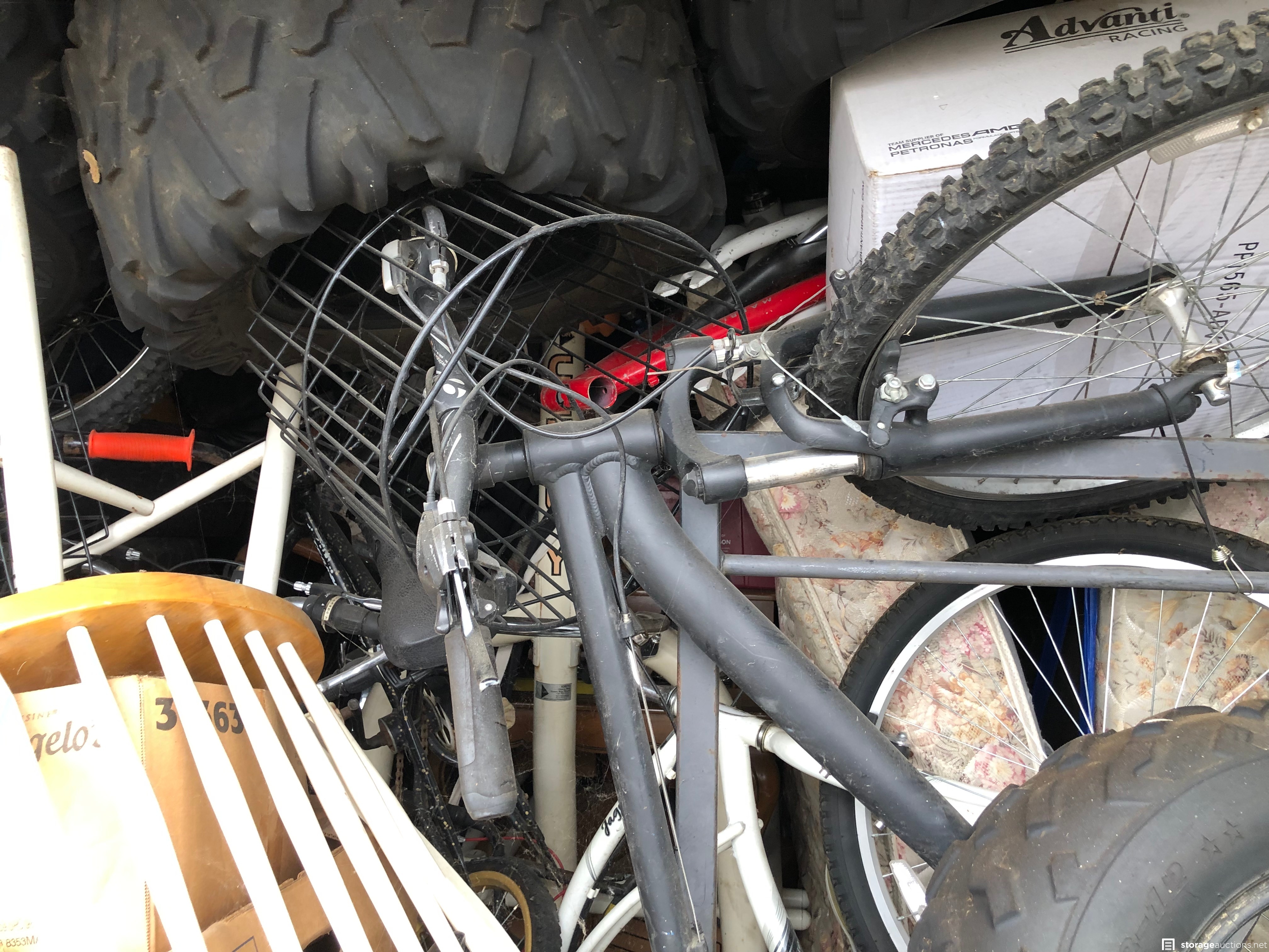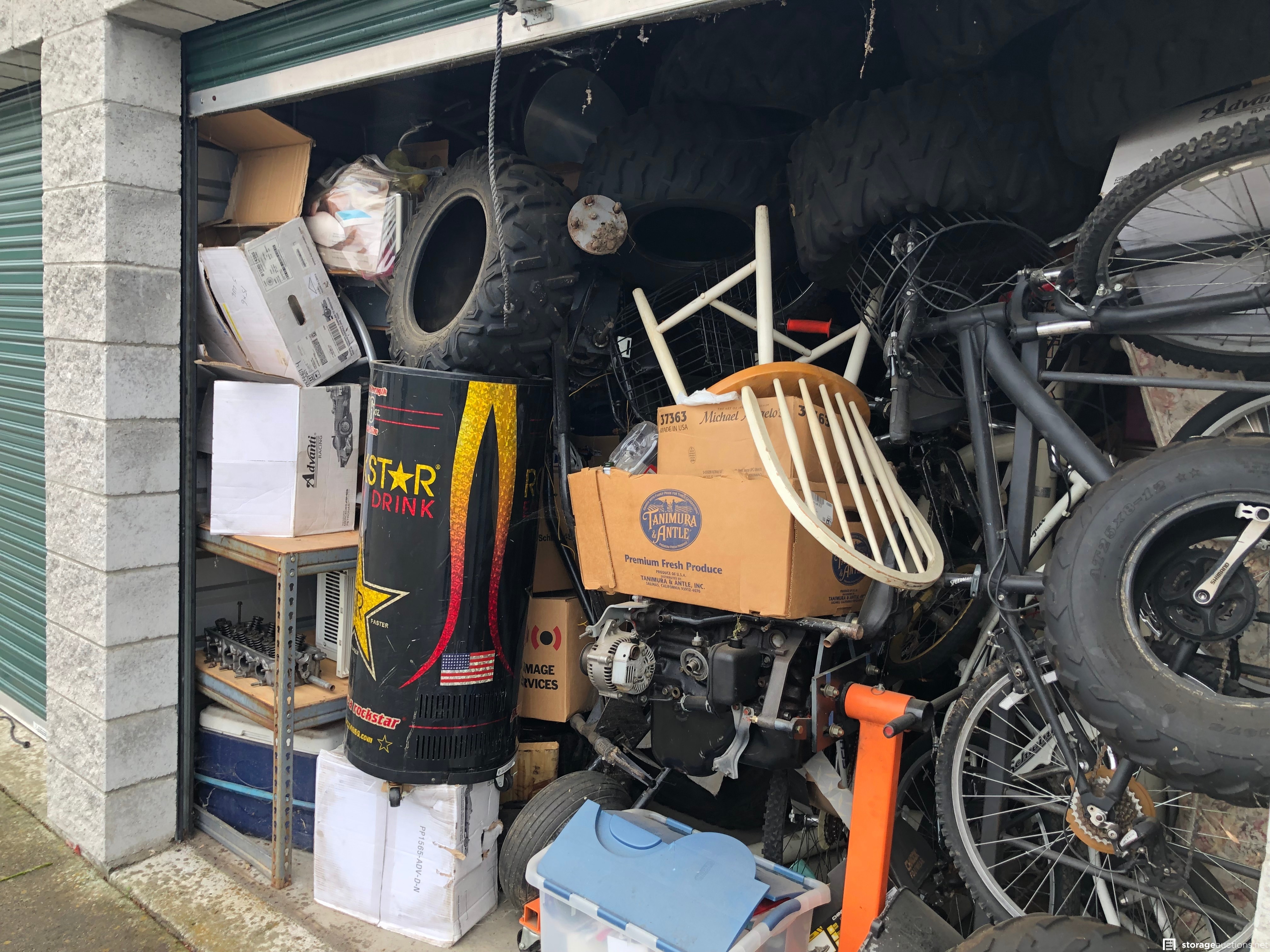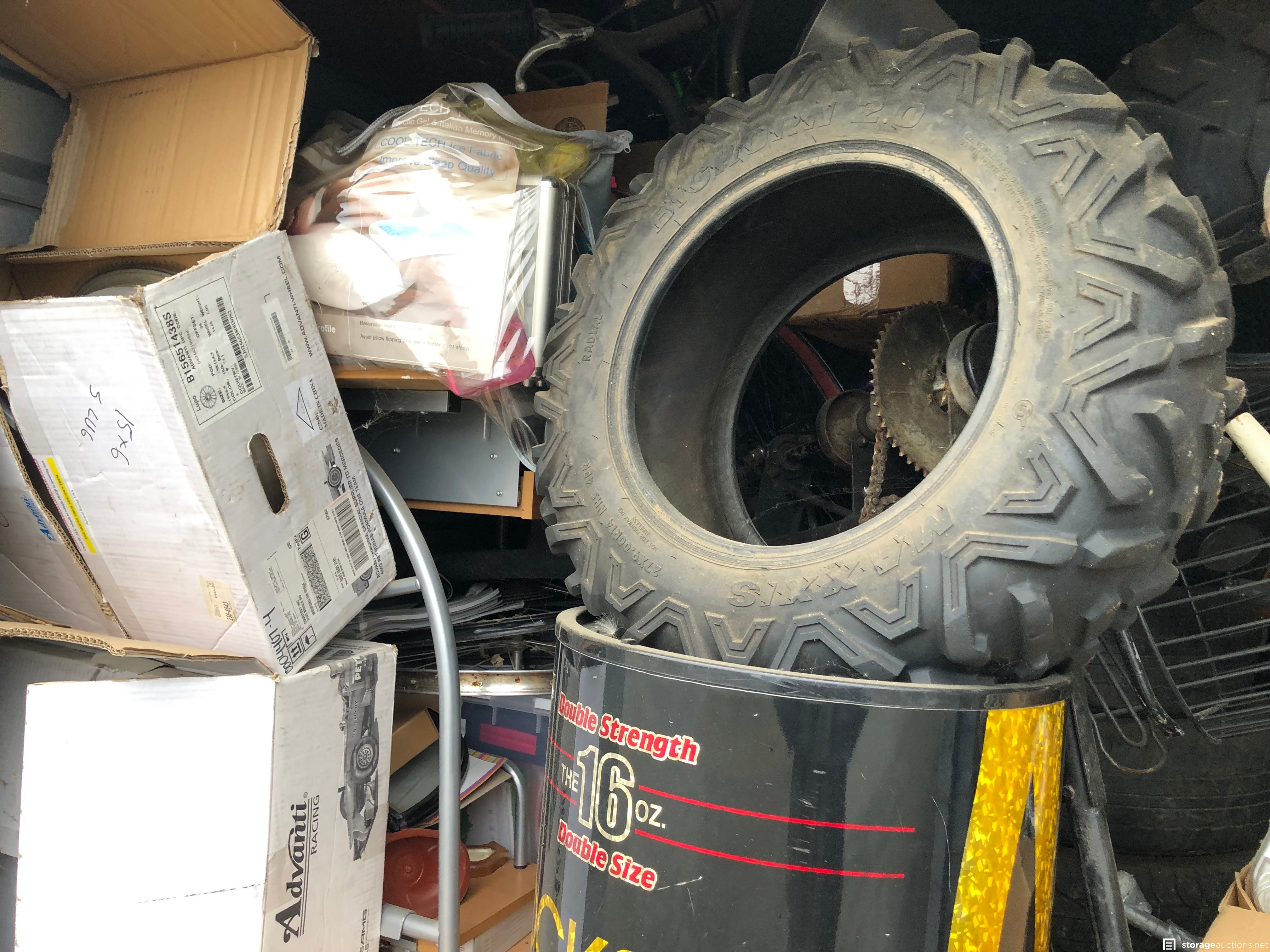 Seen from doorway: multiple pieces and tires for bicycles, ATV/quad tires, motor, rims, etc. We are requiring a higher cleaning deposit on this unit due to the high volume of included goods.