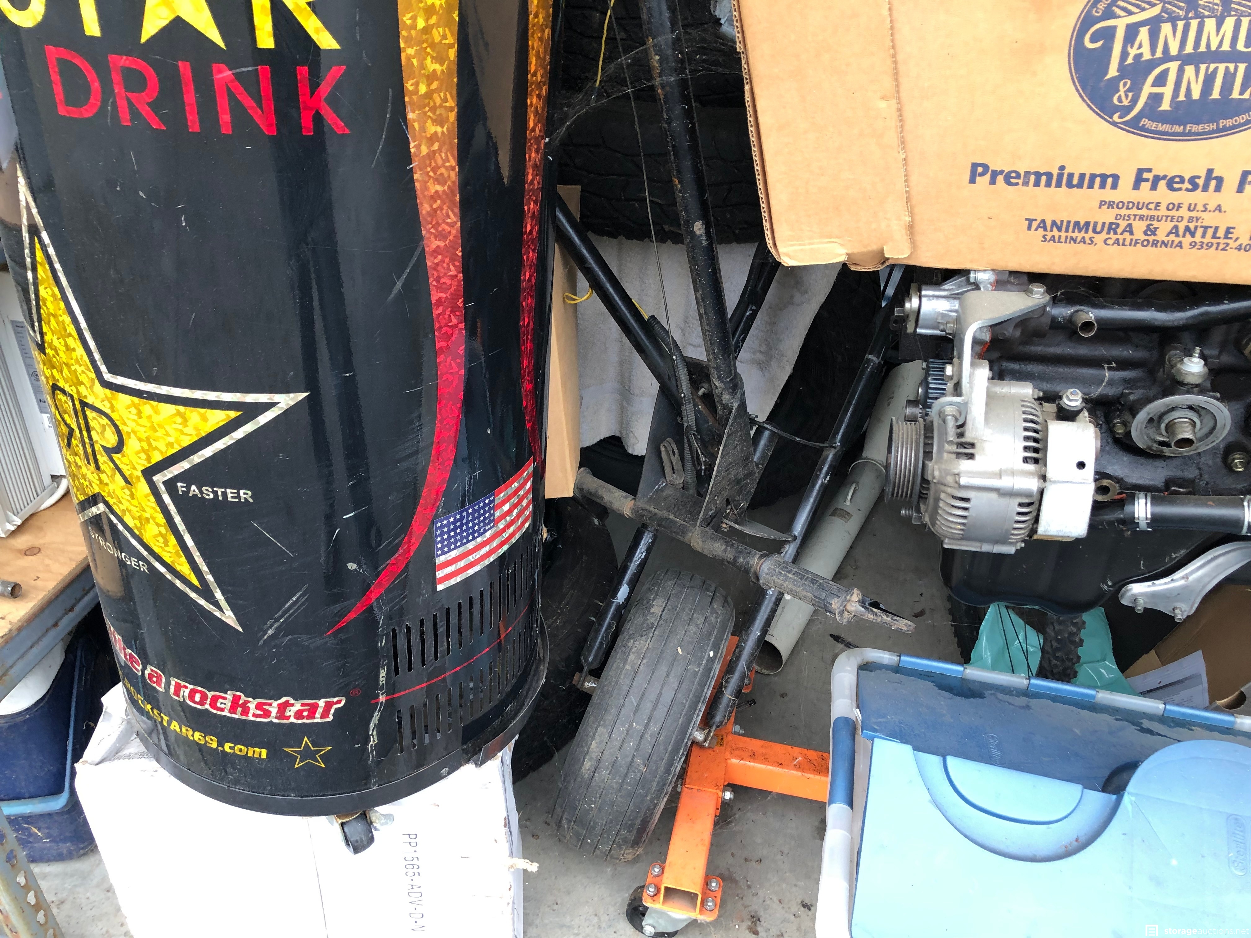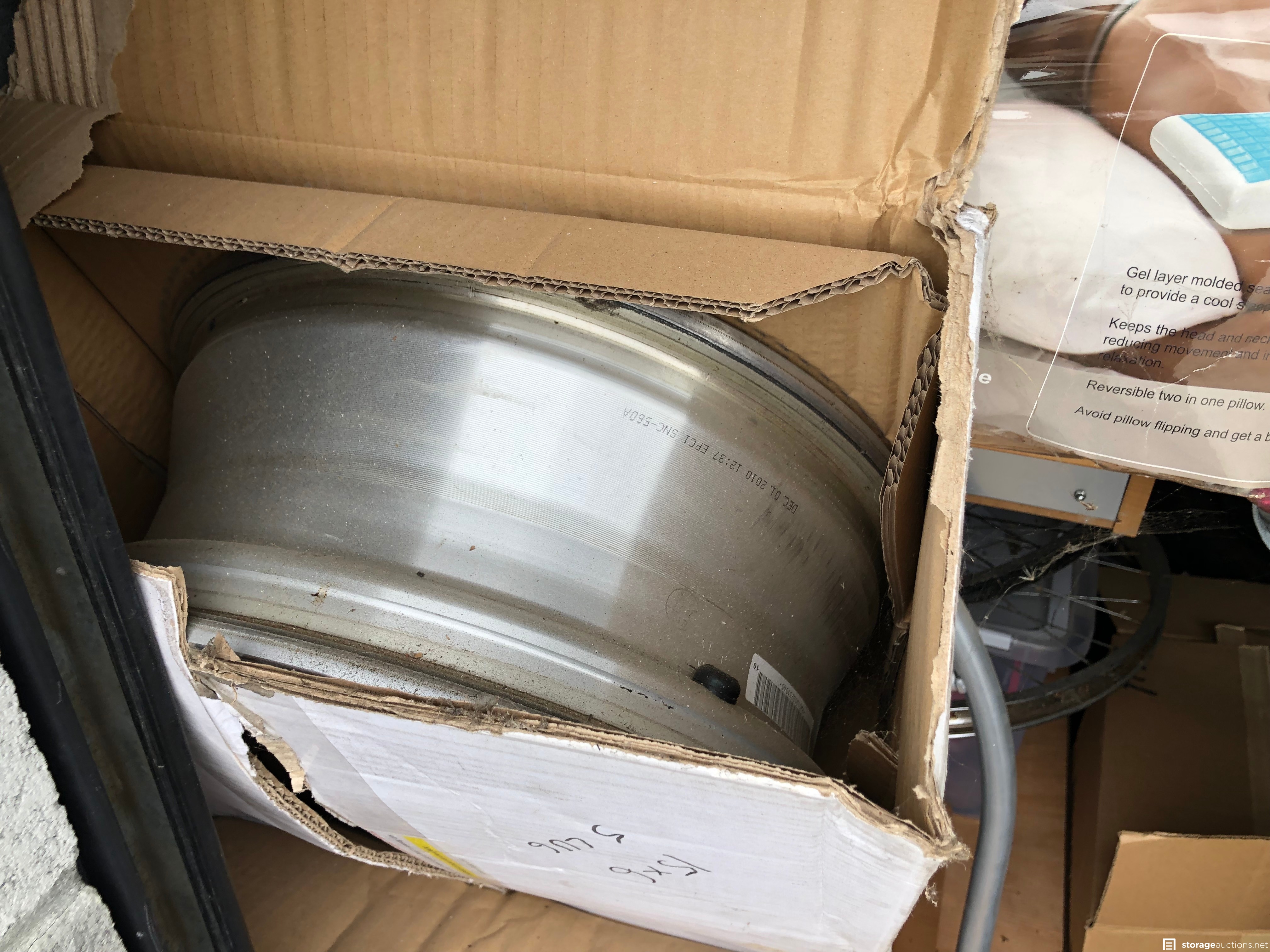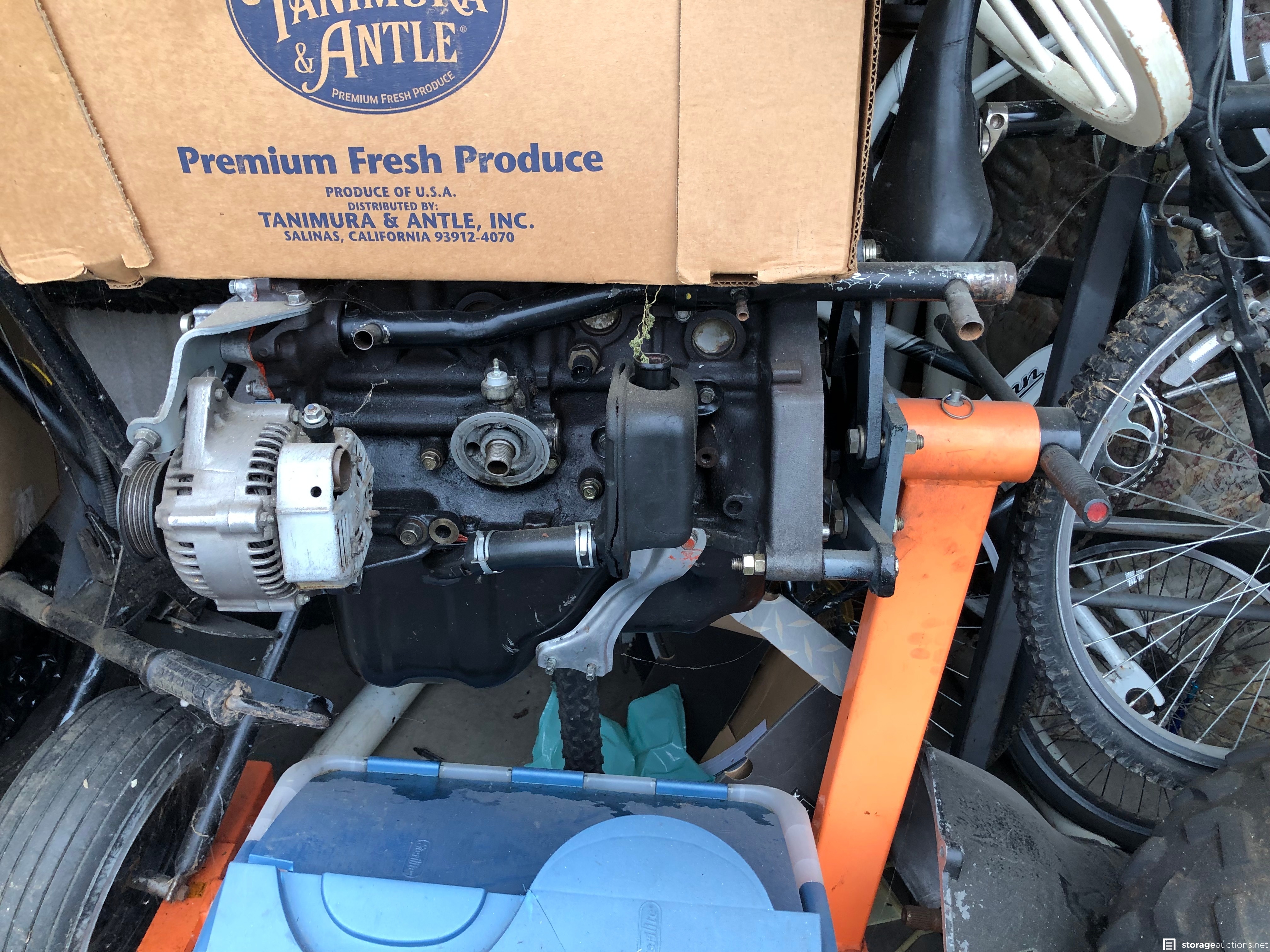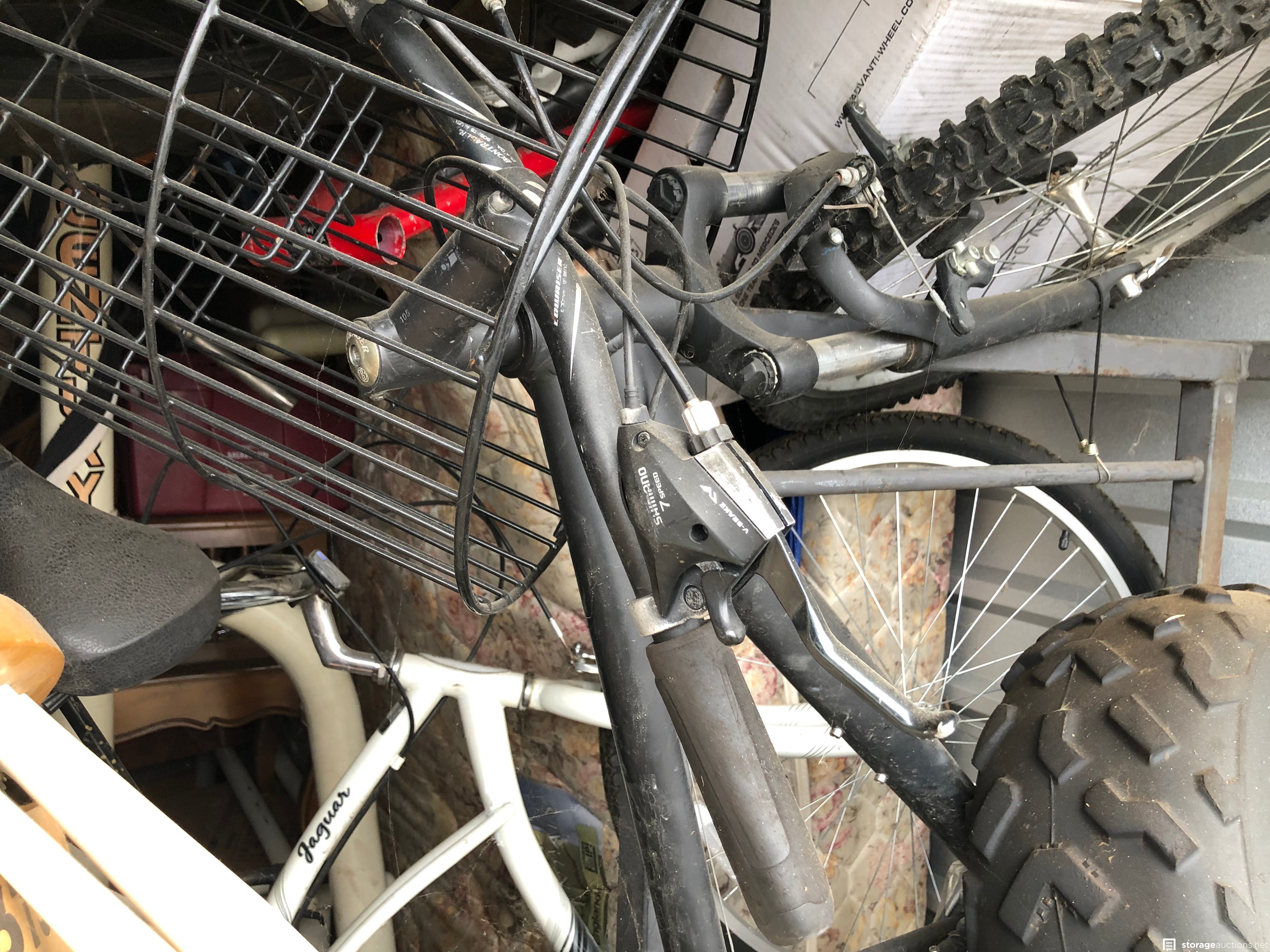 Seen from doorway: multiple pieces and tires for bicycles, ATV/quad tires, motor, rims, etc. We are requiring a higher cleaning deposit on this unit due to the high volume of included goods.