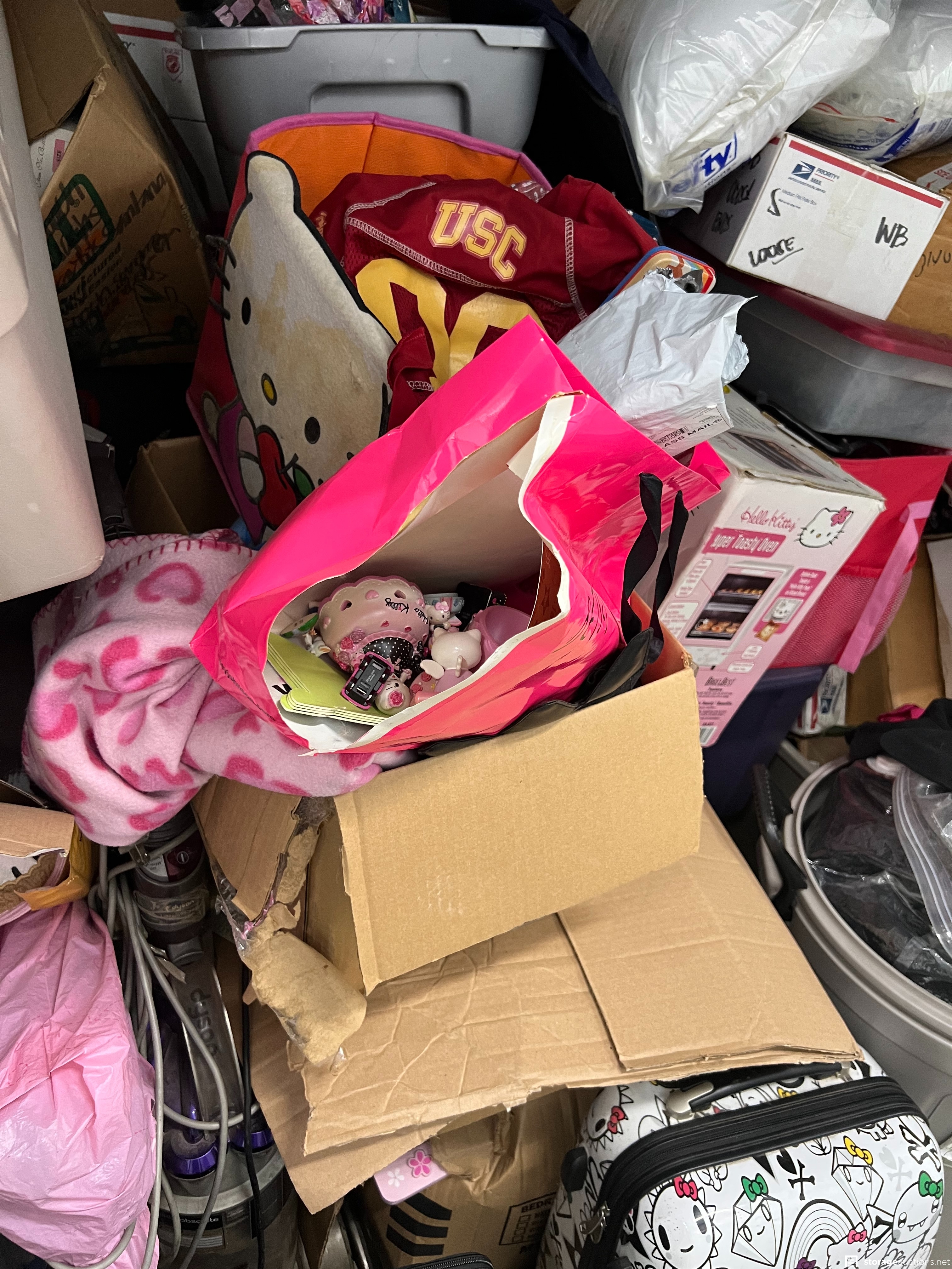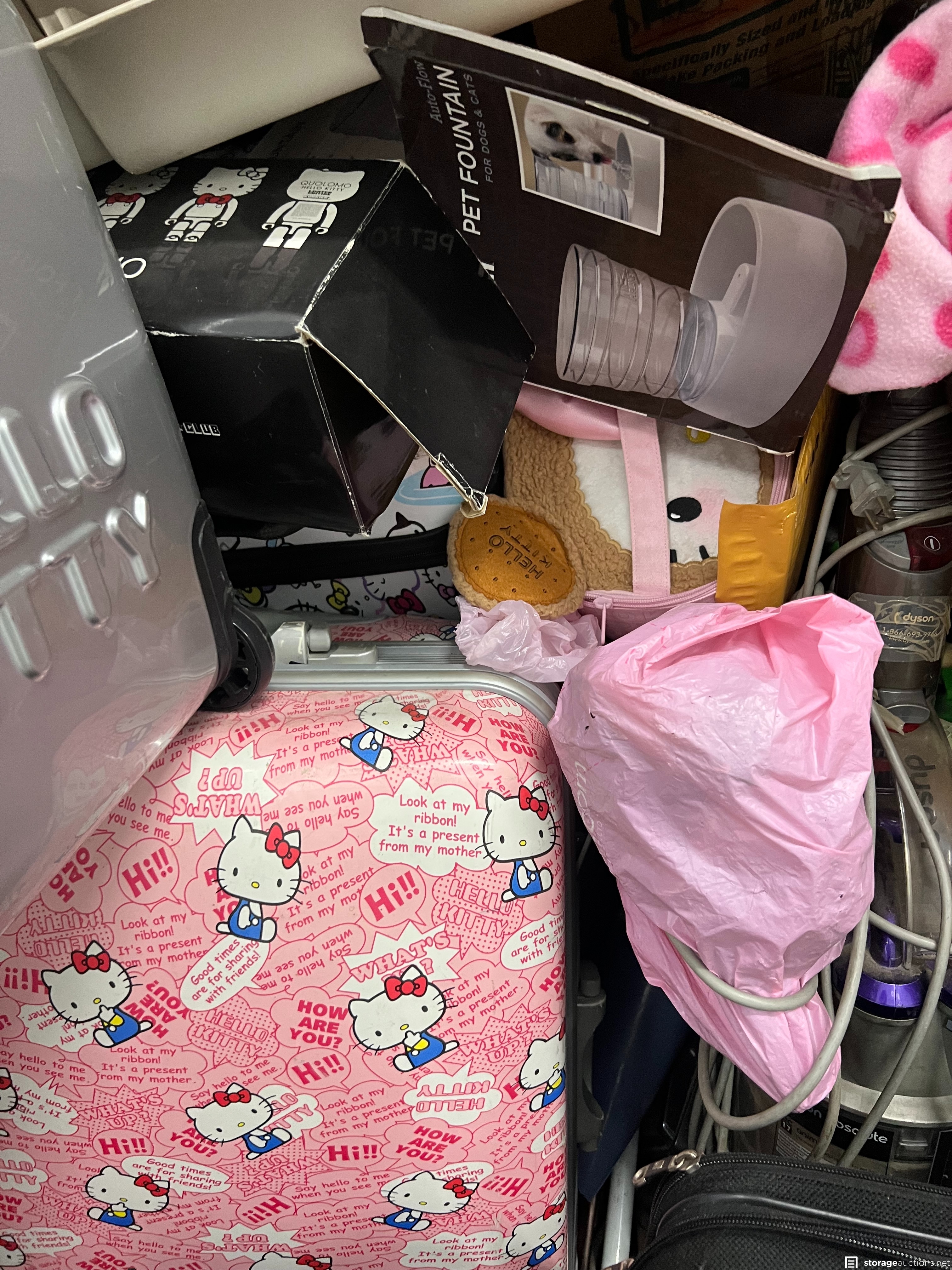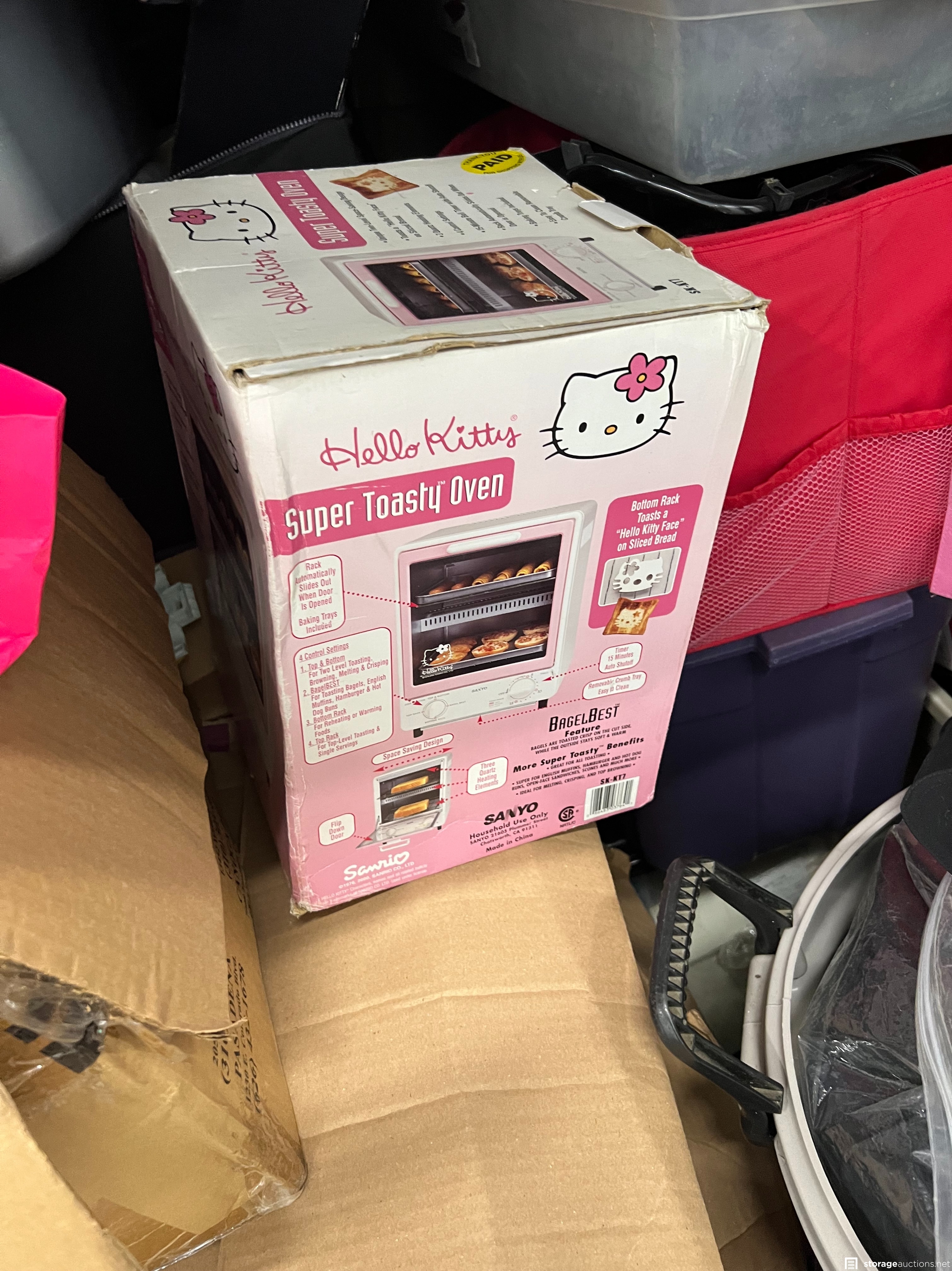 VEHICLE SEAT, LUGGAGE, BOXES, HELLO KITTY ITEMS, DYSON VACUUM, TOTES, BAGS, FAN, TOASTER OVEN, CHRISTMAS TREE.