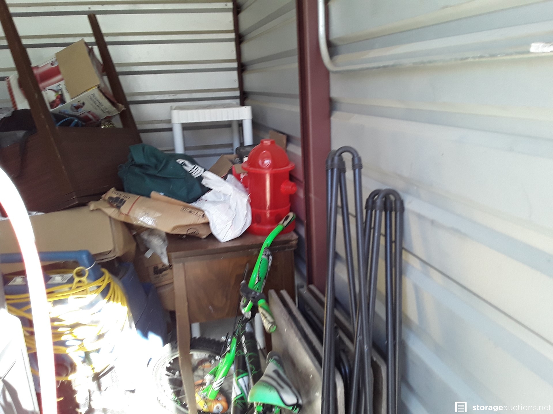 Additional Terms: PAYMENT AND TERMS 1. Buyers must be at least 18 years old to bid 2. Acceptable payment types at the facility are: Cash Only 3. You must provide a valid Photo I.D.PAYMENT AND TERMS 1. Buyers must be at least 18 yearPAYMENT AND TERMS 1. Buyers must be at least 18 years old to bid 2. Acceptable payment types at the facility are: Cash Only 3. You must provide a valid Photo I.D. to the Site Manager 4. A refundable cleaning deposit of $100 payable in cash, is required 5. Immediate payment is required prior to gaining access to the unit 6. Sales are final and bids are for the entire unit 7. You must bring your own lock to secure the unit PICK UP AND DISPOSAL 1. You must remove all contents and ???broom sweep??? the unit within the required cleanout time of 48 hours from auction end, during office hours only. 2. You are not allowed to use the on-site dumpsters 3. If you would like to rent the unit after the auction, the manager can assist you 4. Smoking is prohibited on the property 5. Please advise the manager once you have completely emptied the unit. The manager will inspect that the unit is clean and then refund your cleaning deposit 6. Do not park in customer parking 7. No pets allowed at facility 8. Respect the property, managers, tenants, and other buyers at all timess old to bid 2. Acceptable payment types at the facility are: Cash Only 3. You must provide a valid Photo I.D. to the Site Manager 4. A refundable cleaning deposit of $100 payable in cash, is required 5. Immediate payment is required prior to gaining access to the unit 6. Sales are final and bids are for the entire unit 7. You must bring your own lock to secure the unit PICK UP AND DISPOSAL 1. You must remove all contents and ???broom sweep??? the unit within the required cleanout time of 48 hours from auction end, during office hours only. 2. You are not allowed to use the on-site dumpsters 3. If you would like to rent the unit after the auction, the manager can assist you 4. Smoking is prohibited on the property 5. Please advise the manager once you have completely emptied the unit. The manager will inspect that the unit is clean and then refund your cleaning deposit 6. Do not park in customer parking 7. No pets allowed at facility 8. Respect the property, managers, tenants, and other buyers at all times to the Site Manager 4. A refundable cleaning deposit of $100 payable in cash, is required 5. Immediate payment is required prior to gaining access to the unit 6. Sales are final and bids are for the entire unit 7. You must bring your own lock to secure the unit PICK UP AND DISPOSAL 1. You must remove all contents and ???broom sweep??? the unit within the required cleanout time of 48 hours from auction end, during office hours only. 2. You are not allowed to use the on-site dumpsters 3. If you would like to rent the unit after the auction, the manager can assist you 4. Smoking is prohibited on the property 5. Please advise the manager once you have completely emptied the unit. The manager will inspect that the unit is clean and then refund your cleaning deposit 6. Do not park in customer parking 7. No pets allowed at facility 8. Respect the property, managers, tenants, and other buyers at all times