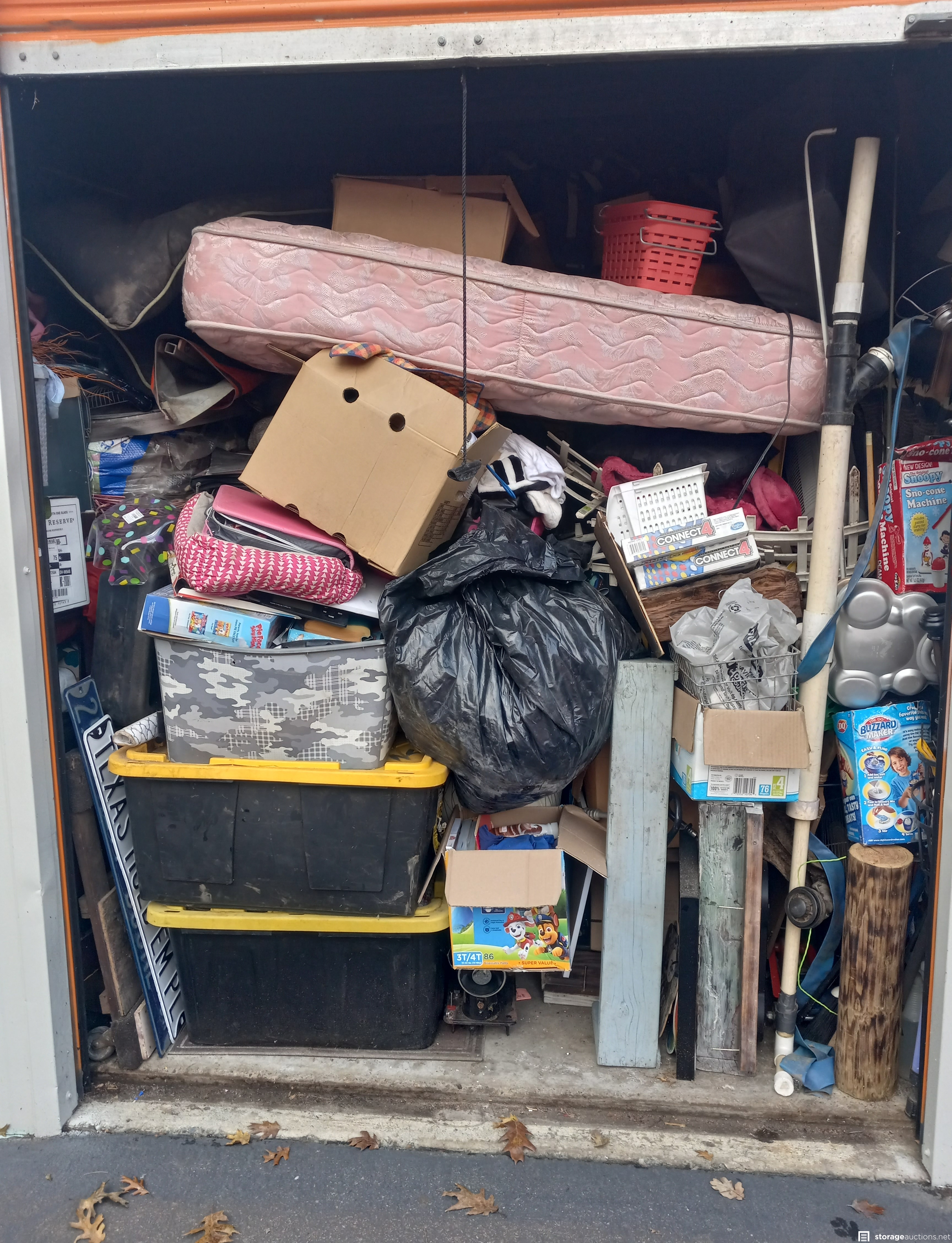 Additional Terms: **Tenants bidding on their own unit do not alleviate their debt obligation and will still owe the full balance due on the unit.** 1. Auction units must be paid in Cash Only at the facility where the unit is located. 2. Cleaning Deposit paid in Cash and only returned after approved inspection of unit. 3. Auction Buyer needs to fill out facility buyer's agreement. 4. Auction buyer must show ID or have letter stating buyer's representative name and they must show ID to gain access to unit. 5. Auction Buyers must contact the storage facility office where the unit is located within 72 hours after the auction ends. 6. Buyer must clean unit out during office hours only. No gate access code will be given out. 7. Contact facility immediately when auction ends, to make arrangements to pay for and pick up the unit. 8. You must have a Paid Invoice in order to pick up unit. 9. You must be 18 years old to bid. 10. You must provide a valid photo I.D. to the Site Manager. 11. You must bring your own lock to secure the unit. 12. You will not be allowed to enter the storage unit or touch any items prior to bidding. 13. Sales are final and bids are for the entire unit. 14. The Auctioneer has final say on all issues, including whether to refuse a bid if a bidder has disrupted an auction or violated any rules. 15. Immediate cash payment is required when you purchase a unit. 16. You have 72 hours to remove the contents entirely and broom sweep the unit. 17. A $50 refundable cleaning deposit is also charged on every unit you buy. 18. You must remove all of the contents and trash from the unit and facility grounds. 19. You are not allowed to use the dumpsters on the facility property. 20. Please advise the manager once you have completely emptied the unit. The manager will inspect that the unit is clean and then refund your cleaning deposit. 21. Smoking is prohibited on storage facility properties. 22. No Pets allowed at facility 23. Respect the Property, Managers, Tenants and other Buyers at all times.
